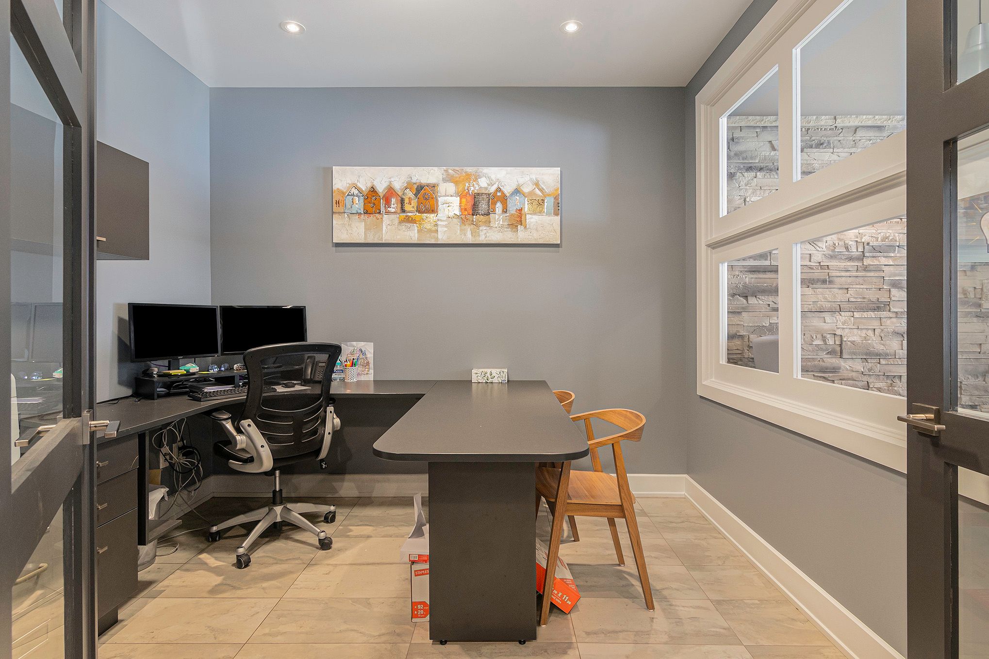 • Large windows provide natural light with custom blinds.