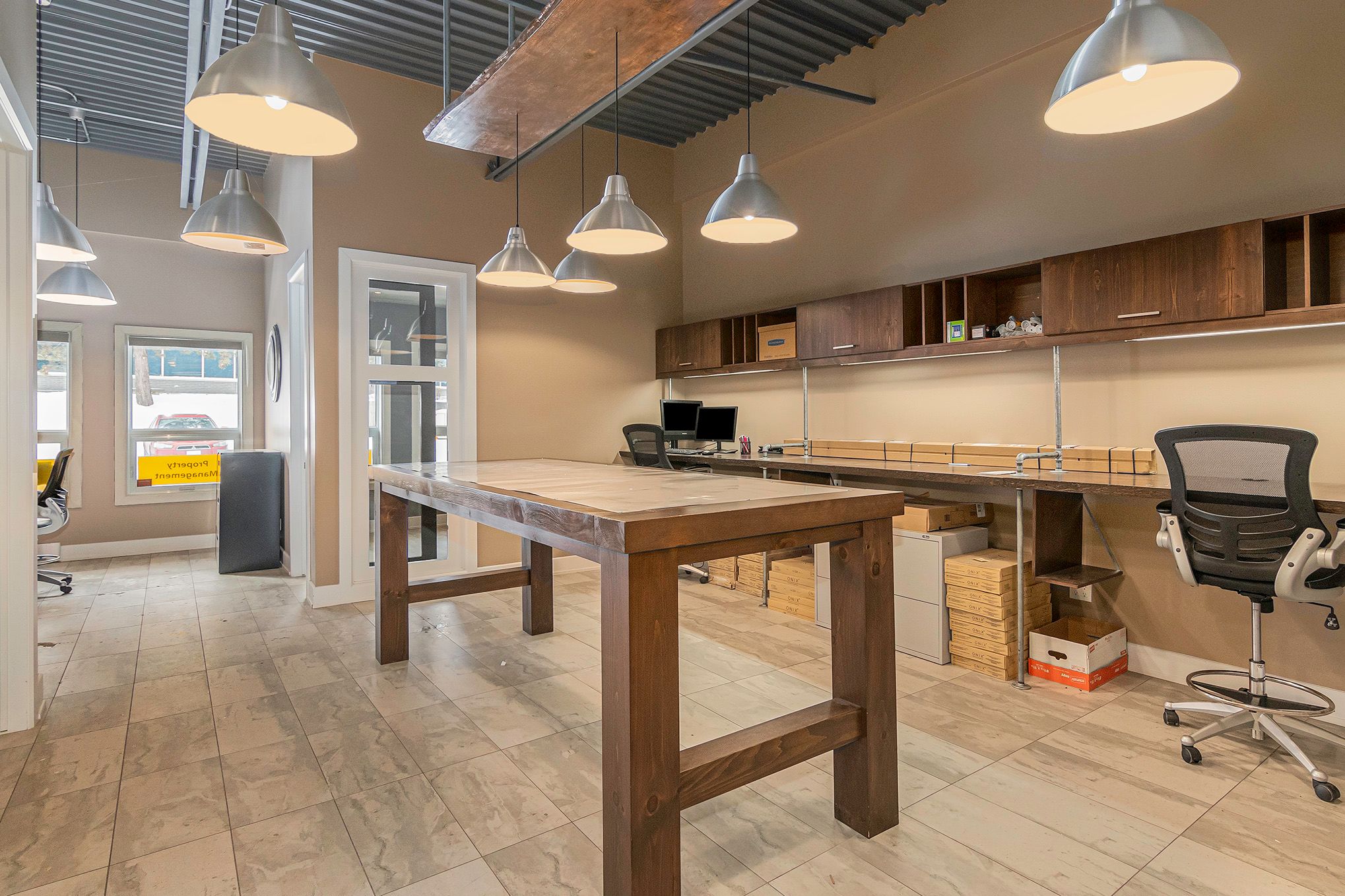 • Open-concept work area with three workstations and central island.