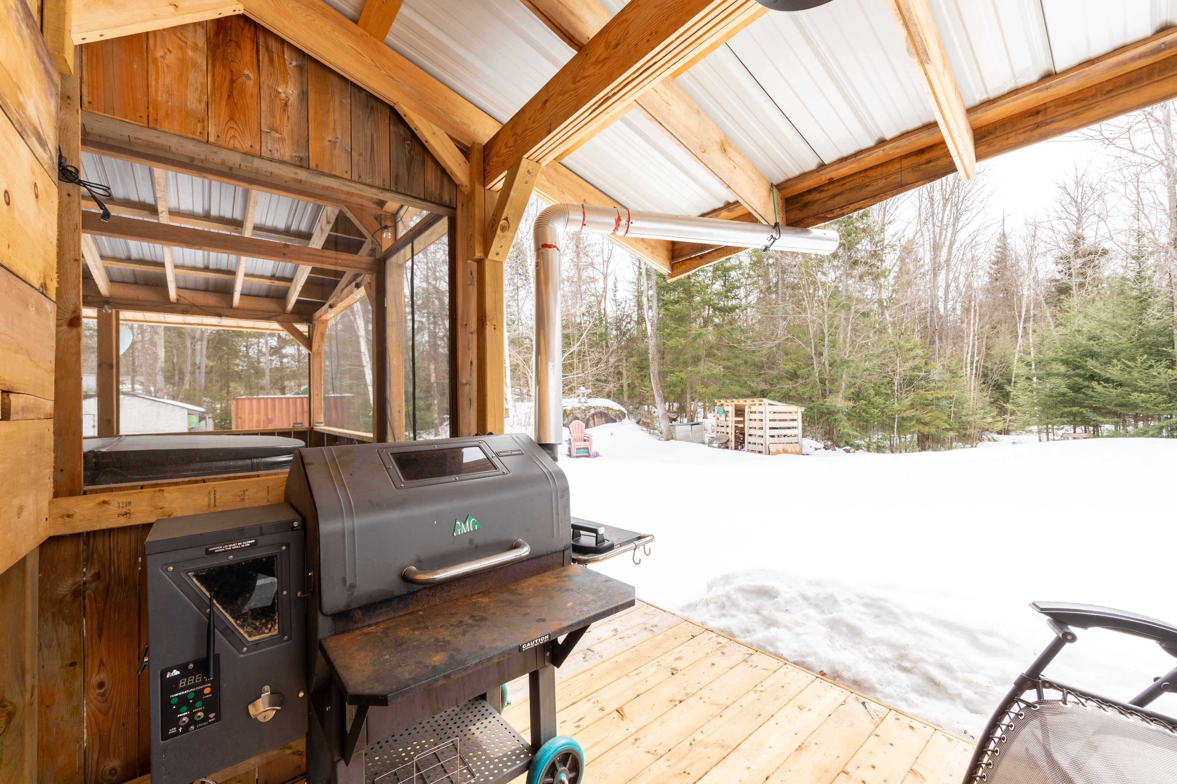 • Outdoor tiered deck with covered hot tub and ample parking available.