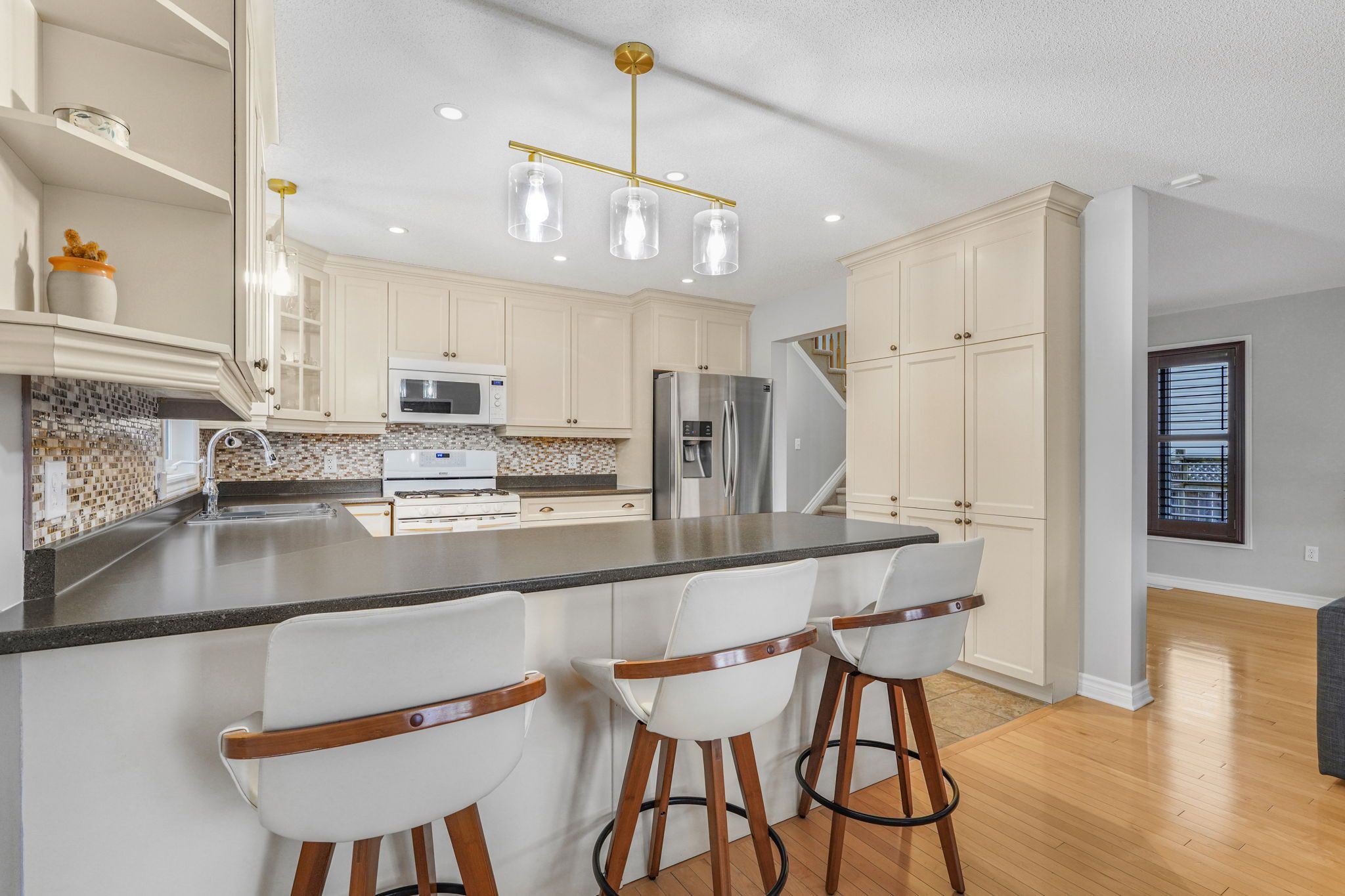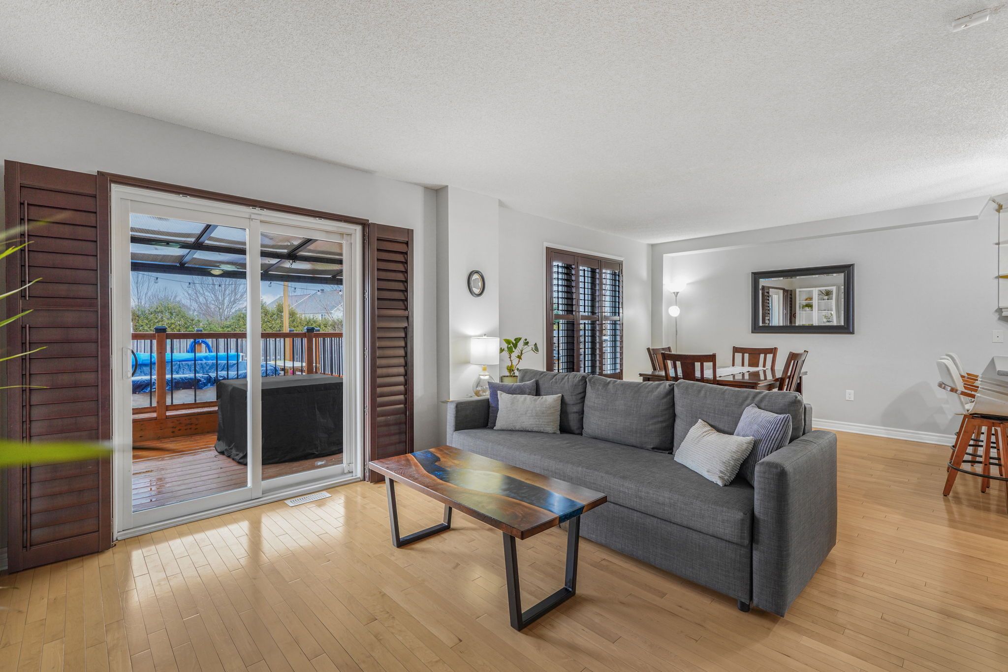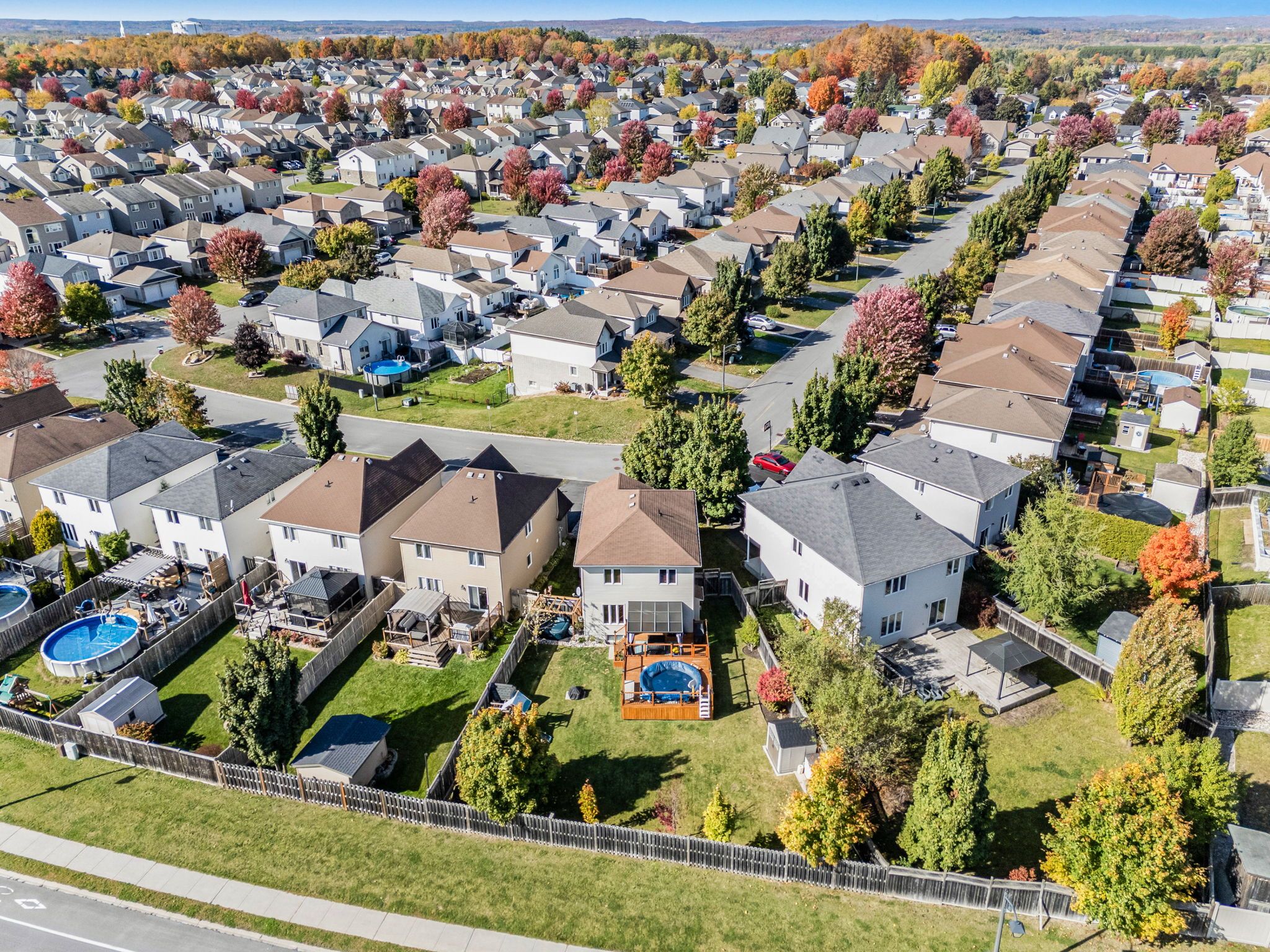 Beautifully maintained 3+1 bedroom family home nestled in the sought-after morris village community of rockland, set on a large pie-shaped lot with no rear neighbours for added privacy. Thoughtfully designed with the perfect balance of modern sophistication and family-friendly comfort, this home offers stylish finishes and functional living spaces throughout. Gorgeous blonde hardwood flooring, neutral tones, custom blinds, and elegant shutters create a warm and inviting atmosphere from the moment you enter. The bright open-concept layout is ideal for everyday family living and entertaining alike. A cozy gas fireplace anchors the living room, adding both charm and comfort. The well-appointed kitchen features timeless cream-coloured cabinetry, a stunning statement backsplash, and a spacious peninsula with breakfast bar seating-perfect for meal preparation and casual dining. Patio doors from the living area provide seamless access to the backyard oasis. Set on one of the largest premium lots in the neighbourhood, the fully fenced backyard offers exceptional privacy and plenty of space to enjoy. Relax on the deck overlooking the beautifully finished yard, complete with a heated 12-foot above-ground pool-perfect for summer entertaining. The second level offers three generous bedrooms, convenient laundry, and a full family bathroom. The spacious primary suite includes a full wall of closet space and a private ensuite bath. The fully finished basement adds impressive versatility with a large recreation room ideal for movie nights, a play area, or home gym, along with a fourth bedroom perfect for guests, a teenager retreat, or home office. An exceptional opportunity to own a stylish and spacious family home in a fantastic community close to parks, schools, shopping, and everyday amenities.