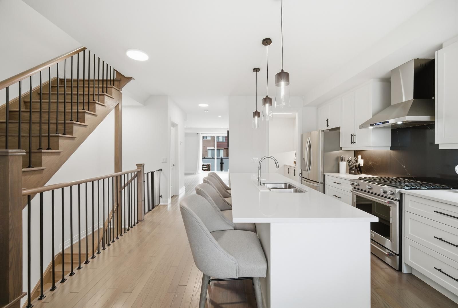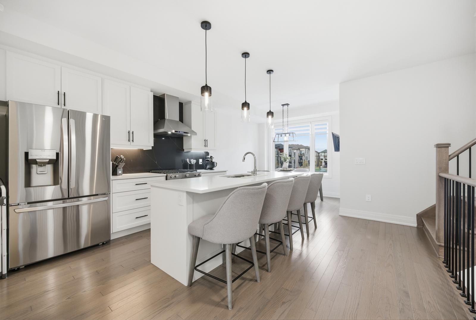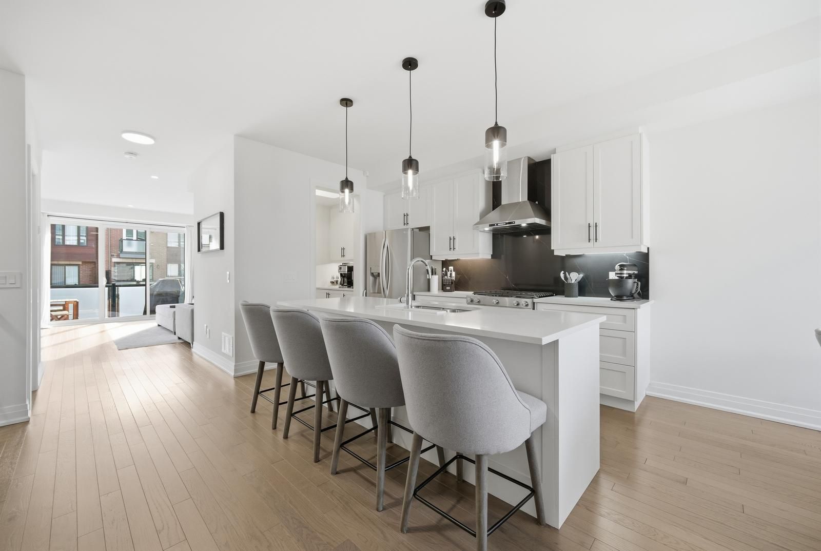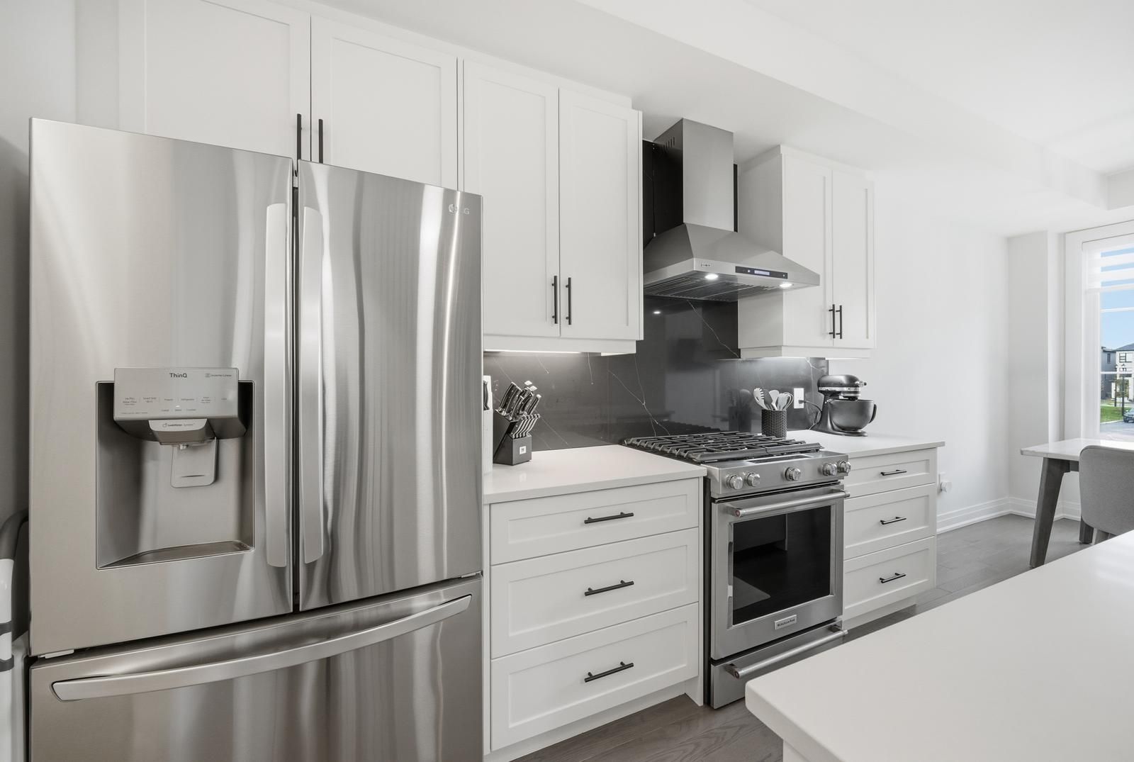 • Upgraded kitchen with marble backsplash, quartz countertops, and soft-close cabinets.