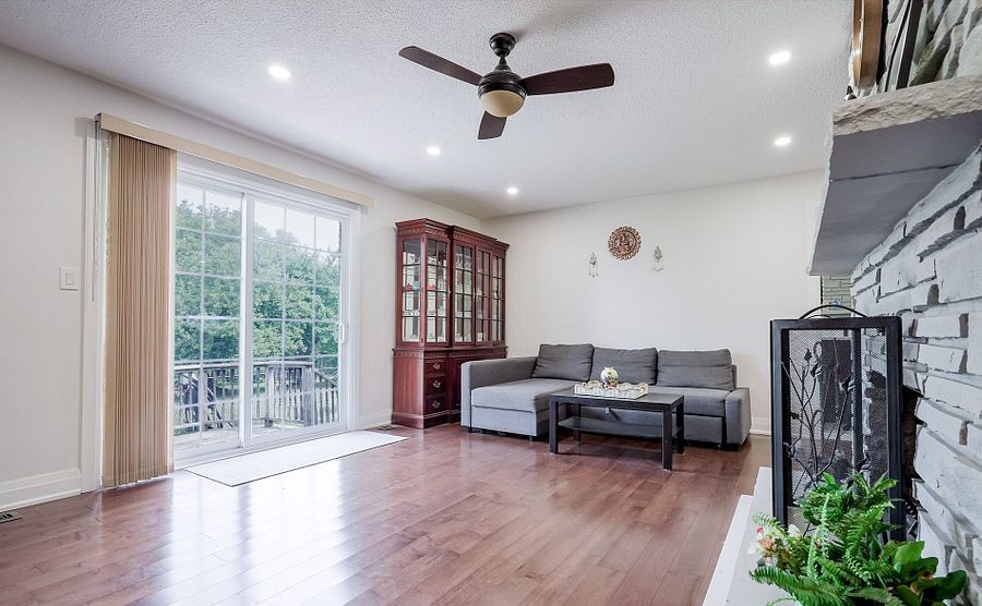 • Cozy family room with wood-burning fireplace and deck access.
