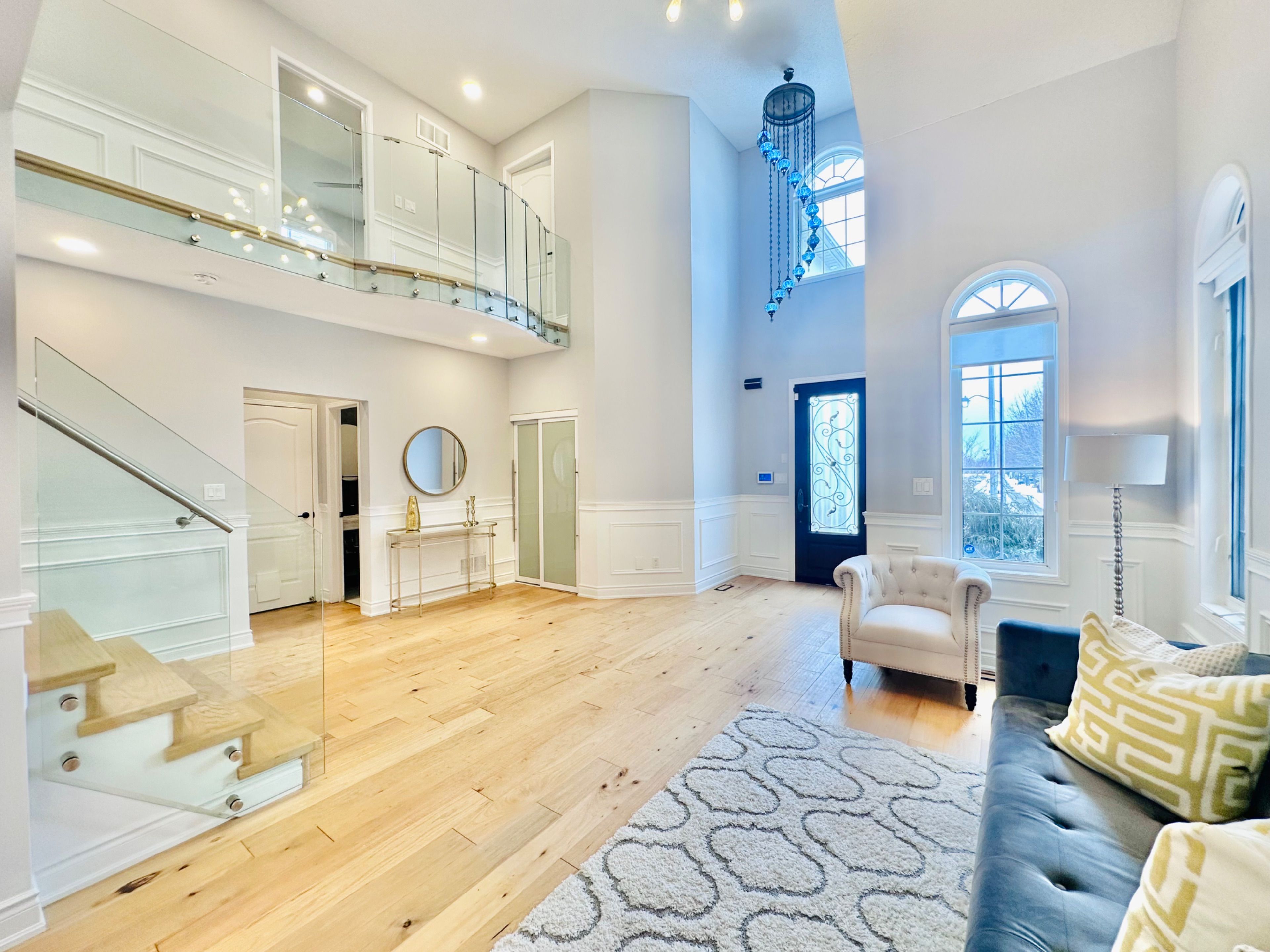 *see 3d tour* this stunning luxurious smart home offers approximately 4500 square feet of refined living space with over 300k spent on upgrades (2022). Featuring a grand open-to-above foyer and living room, elegant wainscoting throughout the main floor, and modern hardwood flooring with 9-foot ceilings. The custom gourmet kitchen showcases tall cabinets, top-of-the-line built-in wall ovens, a striking island with breakfast bar and extra cabinet storage, quartz countertops with a waterfall edge paired with a matching quartz backsplash and smart moen faucet. A beautiful hardwood staircase with sleek glass panels leads to the upper level, enhancing the home's modern elegance. The inviting family room highlights pot lights and a contemporary accent wall. Thoughtfully designed with two master bedrooms, each bedroom offers a full or semi-ensuite, while the primary suite boasts a spa-like bathroom and walk-in closet with custom shelving system. Professionally finished basement with an extra bedroom and 3 pc bathroom. Modern light fixtures and silk roman shades throughout! Enjoy the upgraded stucco exterior (2022), glass garage doors, stamped concrete driveway, and backyard patio. Perfectly situated in a highly sought-after neighborhood with a top-rated high school, close to parks, shopping, amenities, highways, and go station.