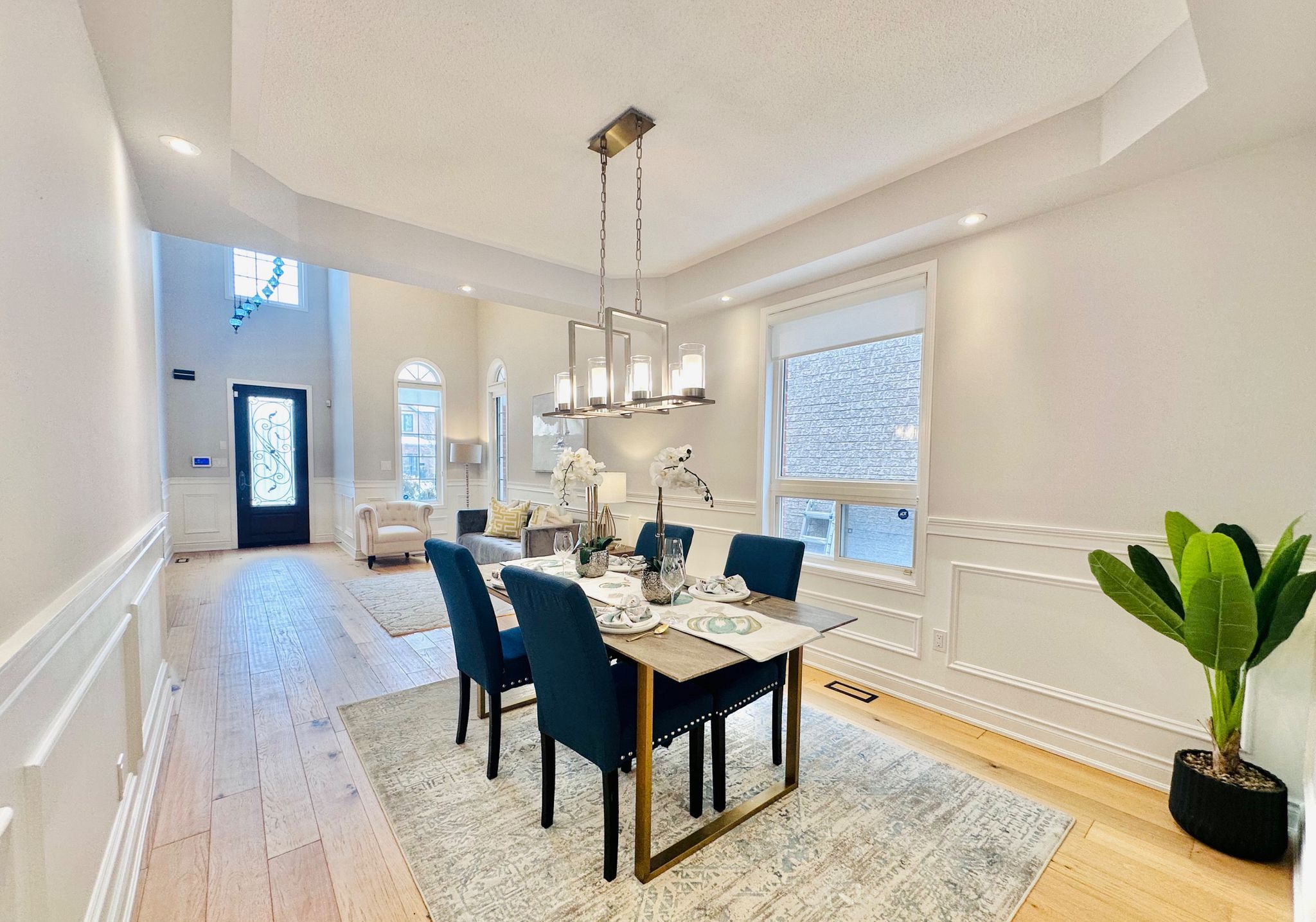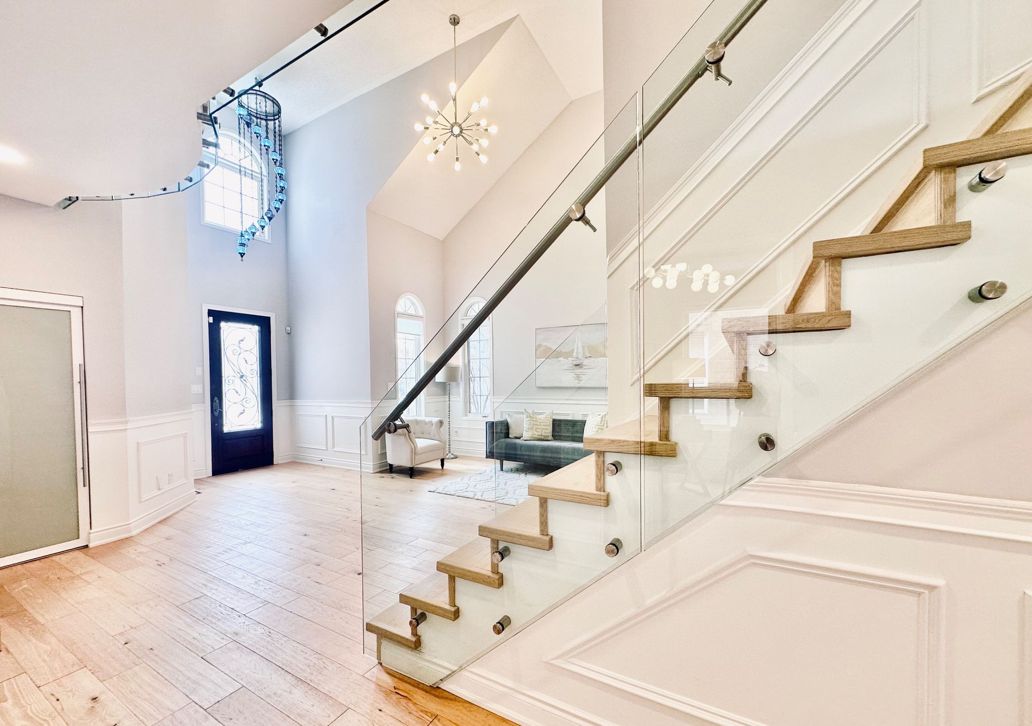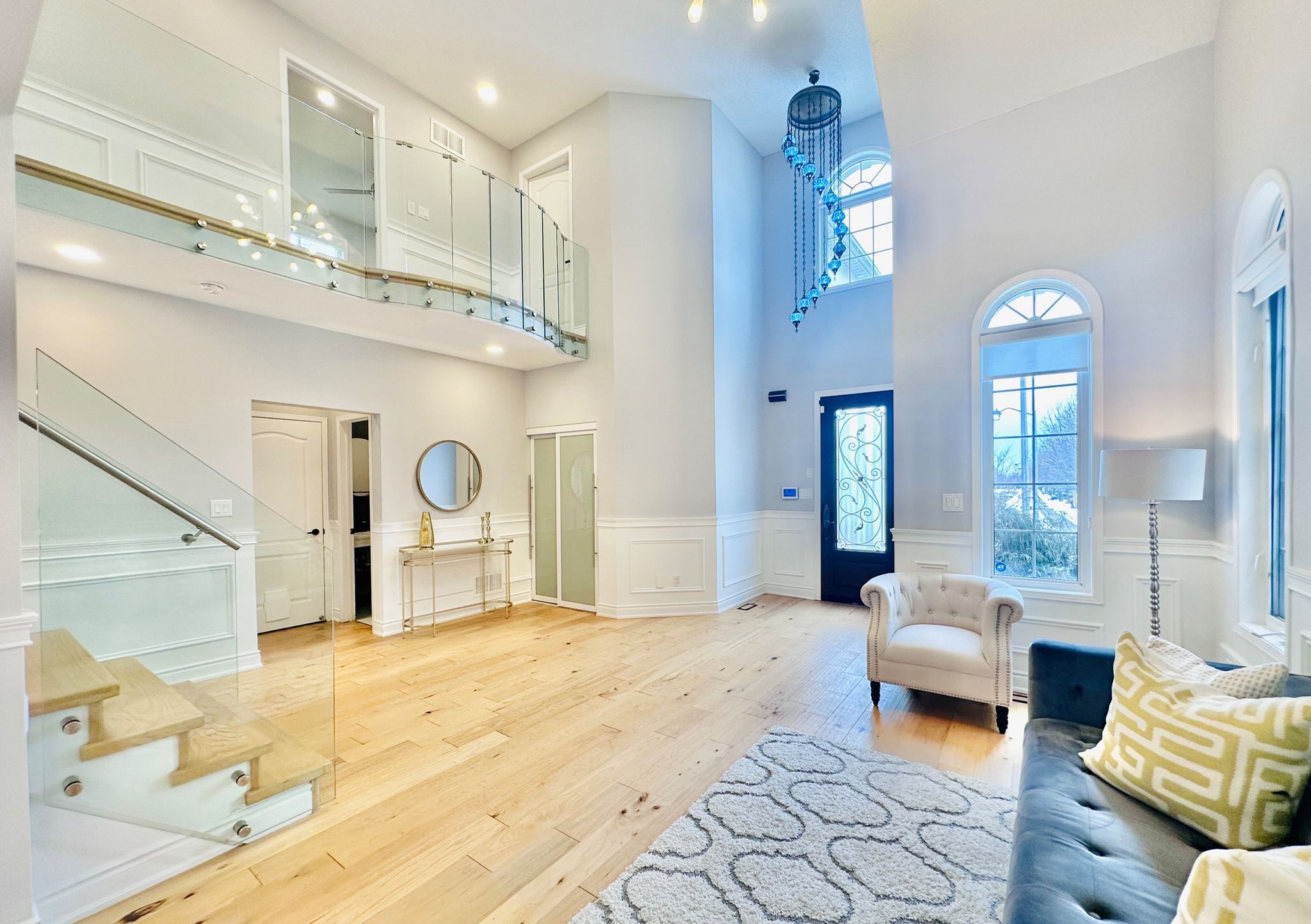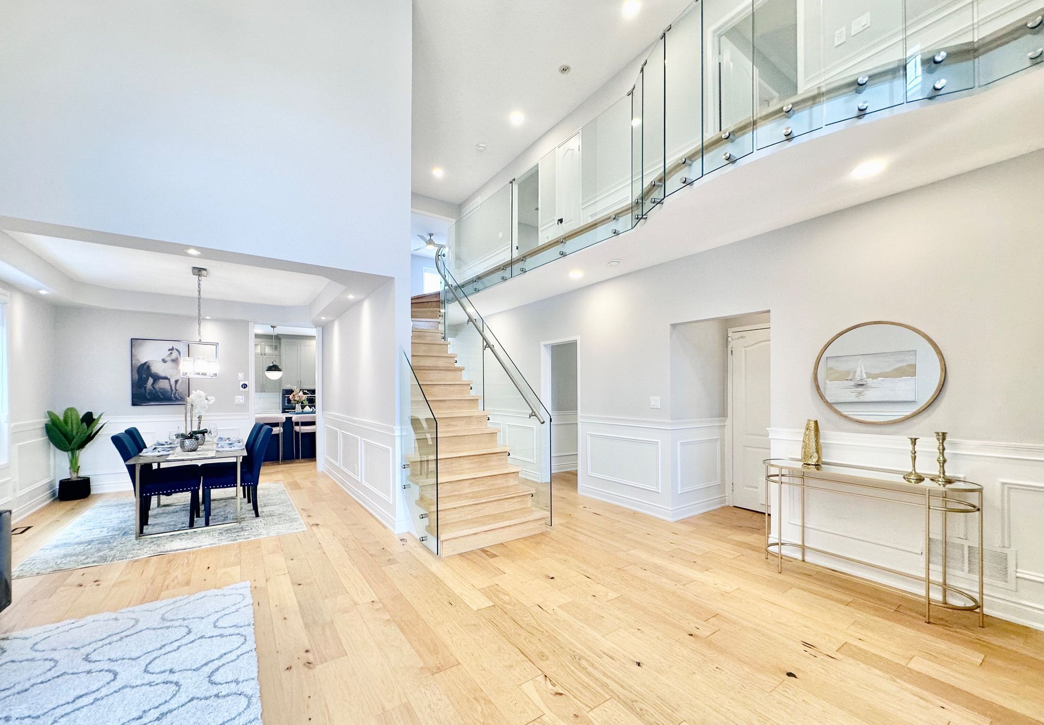 *see 3d tour* this stunning luxurious smart home offers approximately 4500 square feet of refined living space with over 300k spent on upgrades (2022). Featuring a grand open-to-above foyer and living room, elegant wainscoting throughout the main floor, and modern hardwood flooring with 9-foot ceilings. The custom gourmet kitchen showcases tall cabinets, top-of-the-line built-in wall ovens, a striking island with breakfast bar and extra cabinet storage, quartz countertops with a waterfall edge paired with a matching quartz backsplash and smart moen faucet. A beautiful hardwood staircase with sleek glass panels leads to the upper level, enhancing the home's modern elegance. The inviting family room highlights pot lights and a contemporary accent wall. Thoughtfully designed with two master bedrooms, each bedroom offers a full or semi-ensuite, while the primary suite boasts a spa-like bathroom and walk-in closet with custom shelving system. Professionally finished basement with an extra bedroom and 3 pc bathroom. Modern light fixtures and silk roman shades throughout! Enjoy the upgraded stucco exterior (2022), glass garage doors, stamped concrete driveway, and backyard patio. Perfectly situated in a highly sought-after neighborhood with a top-rated high school, close to parks, shopping, amenities, highways, and go station