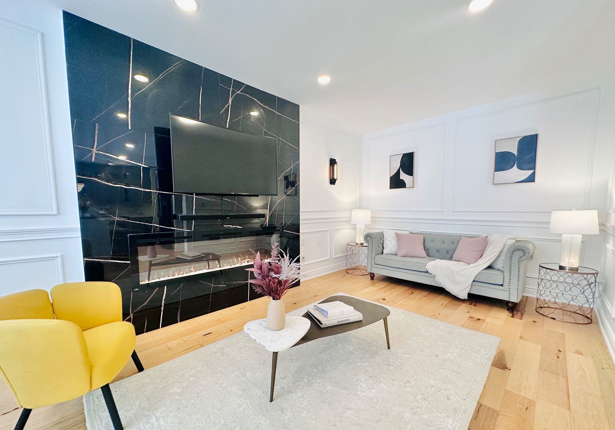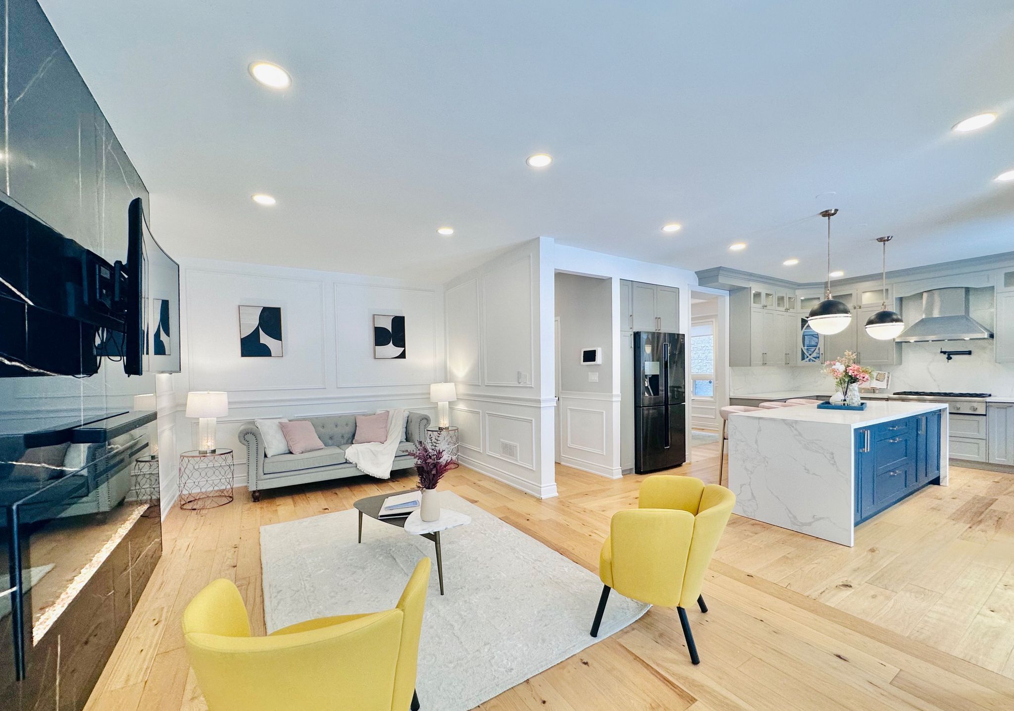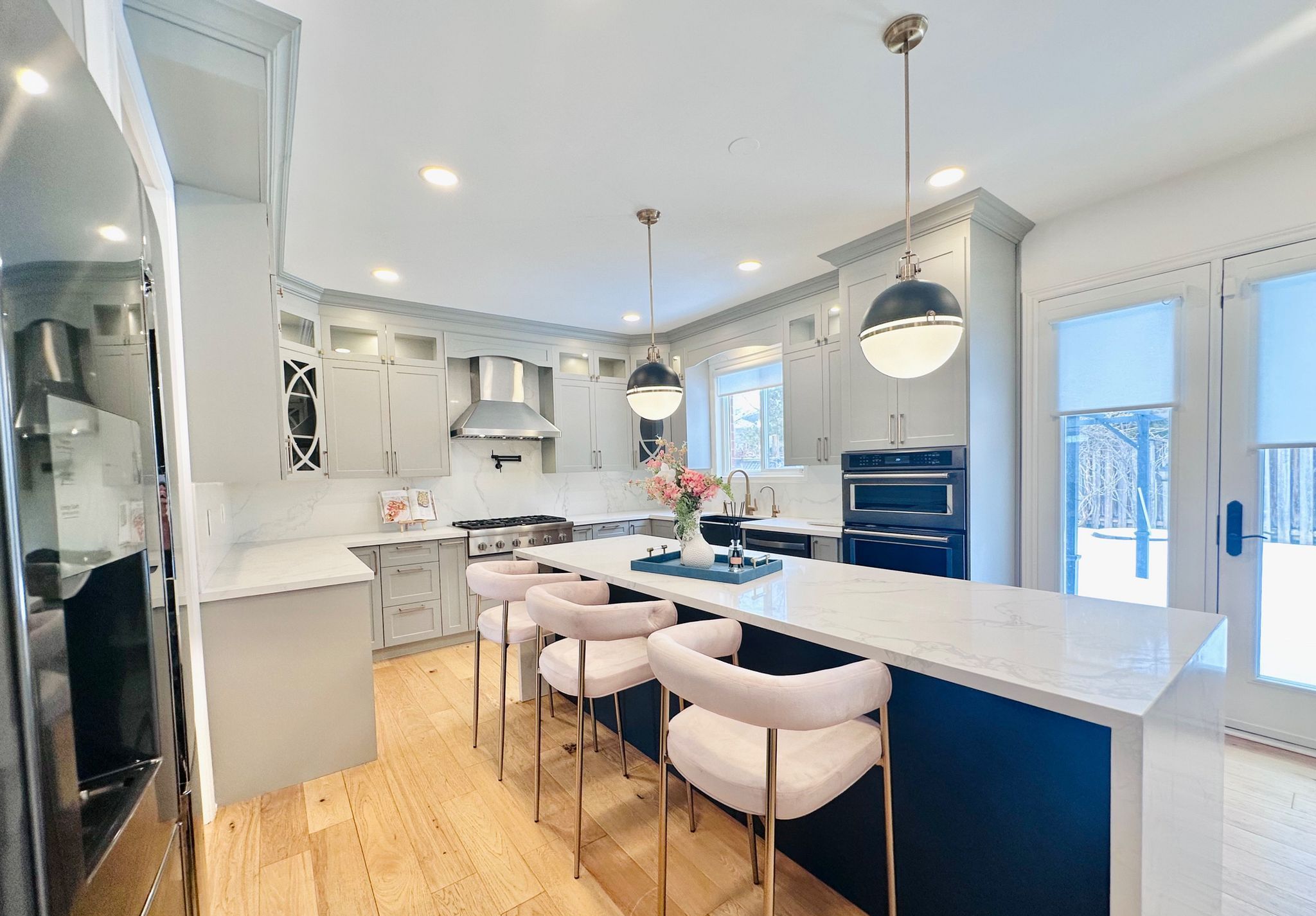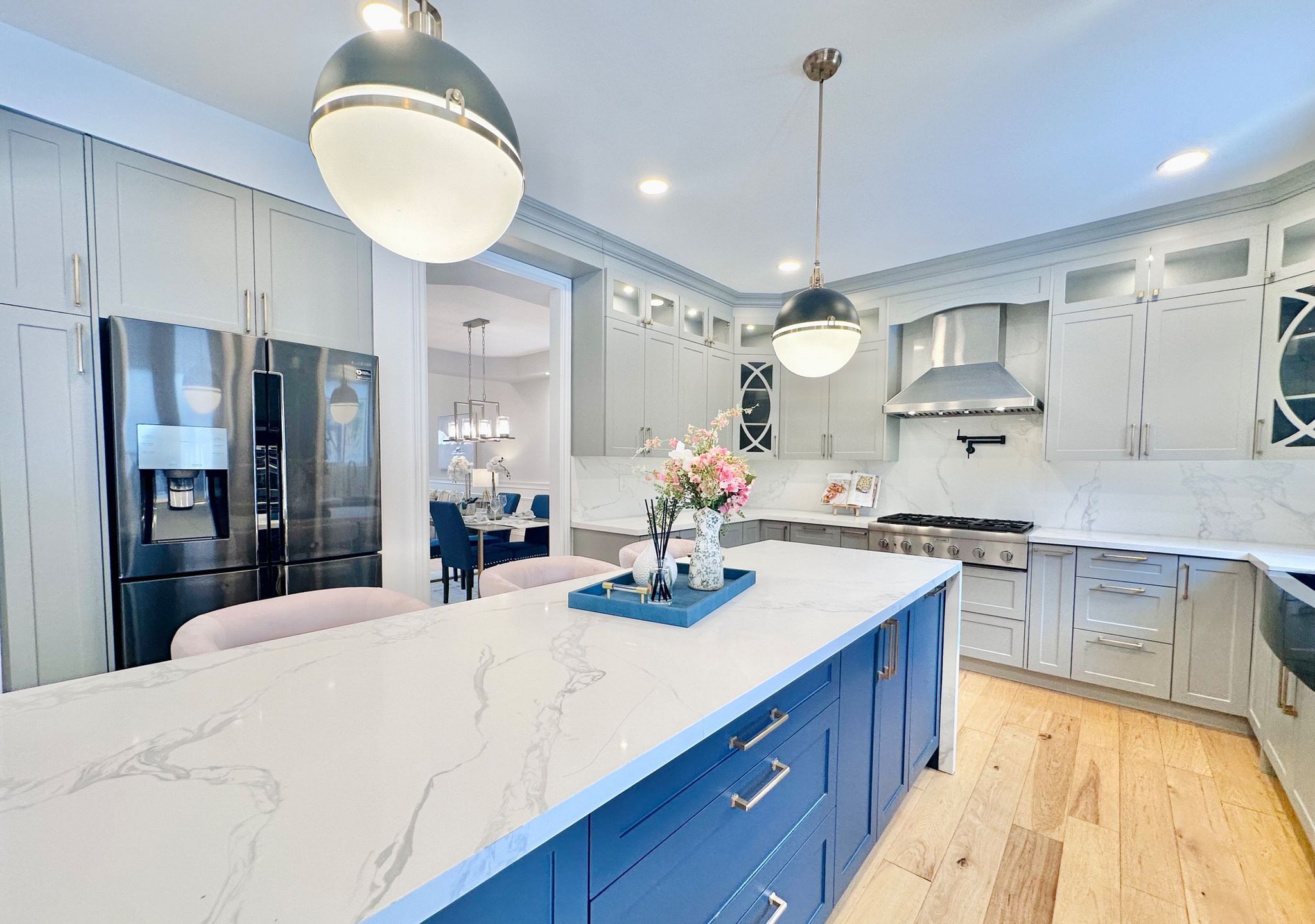 • Custom gourmet kitchen with modern appliances and quartz countertops.