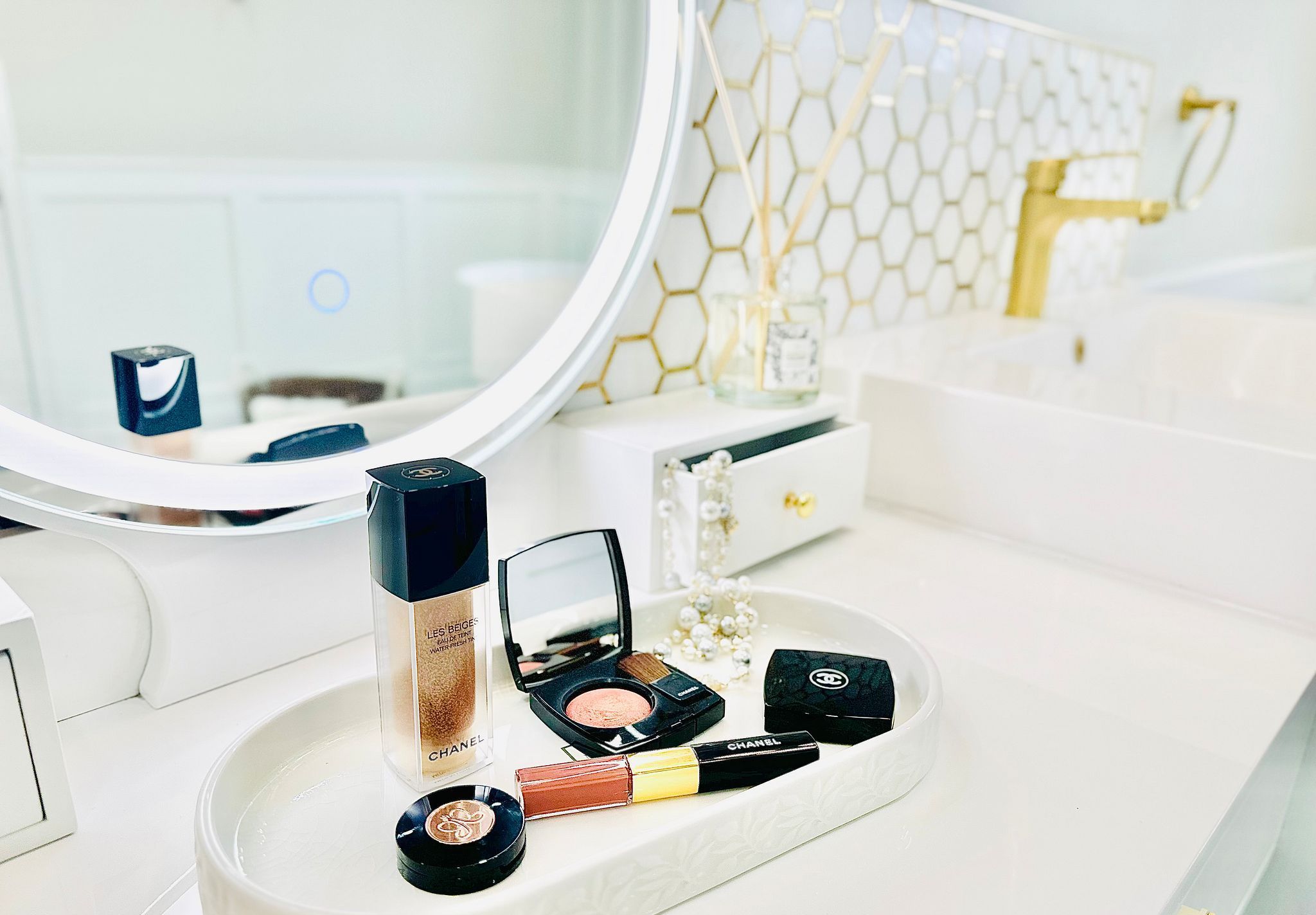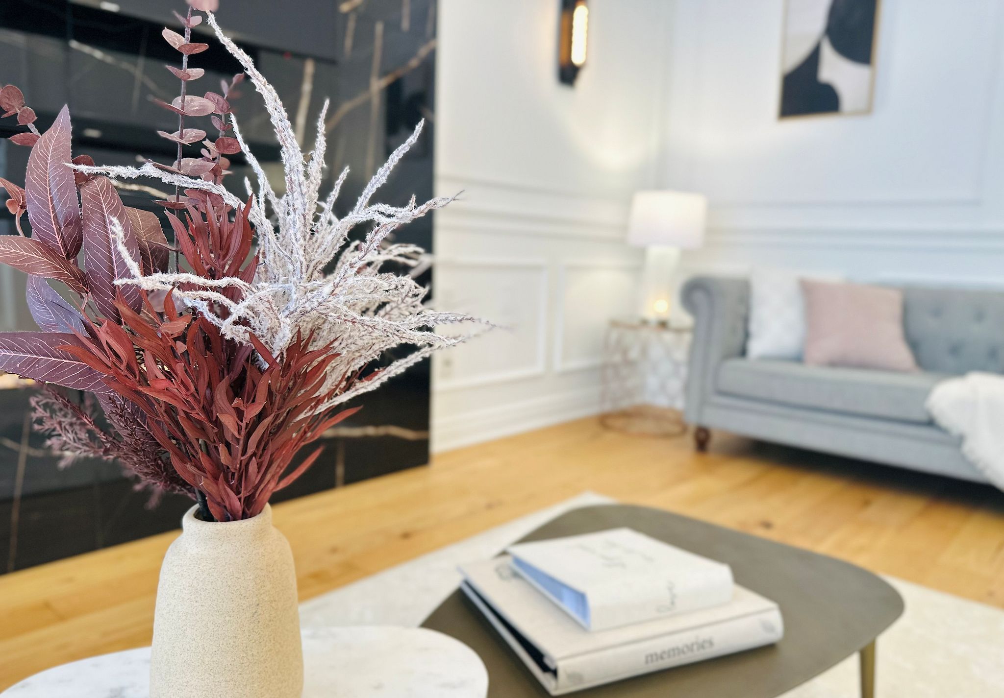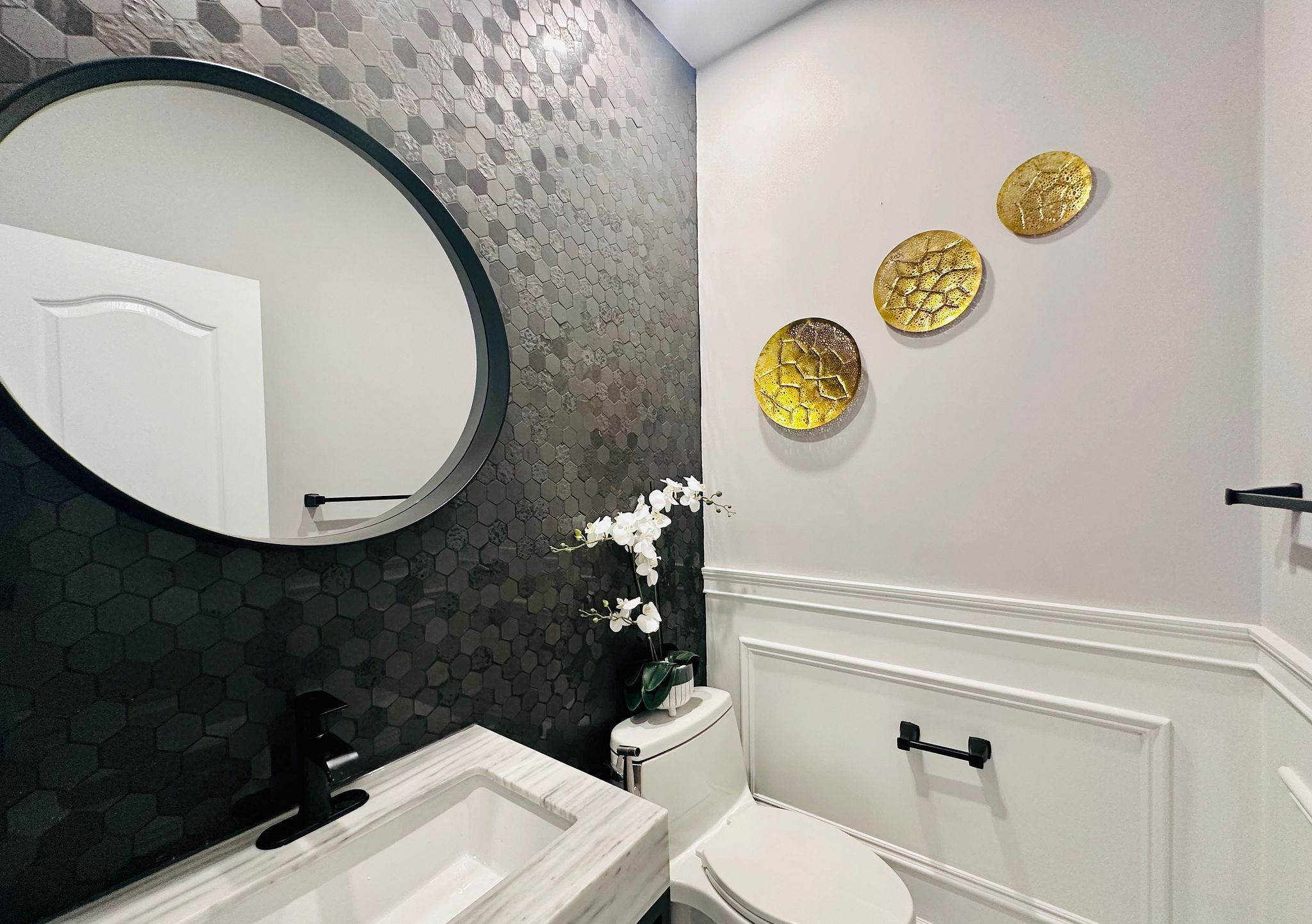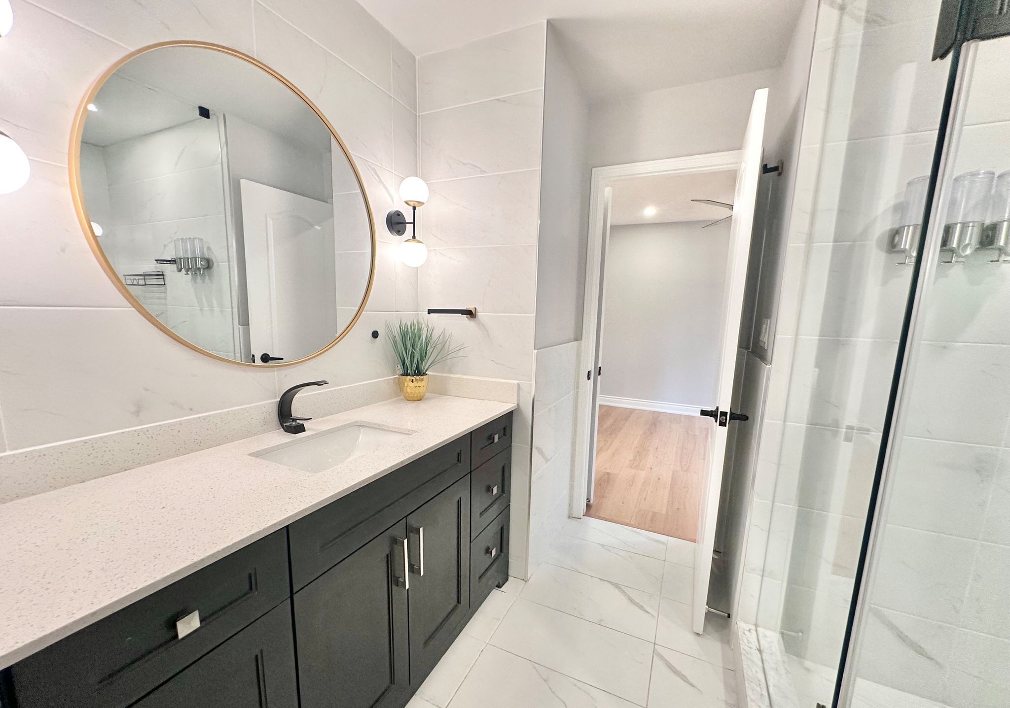 • Custom gourmet kitchen with modern appliances and quartz countertops.
