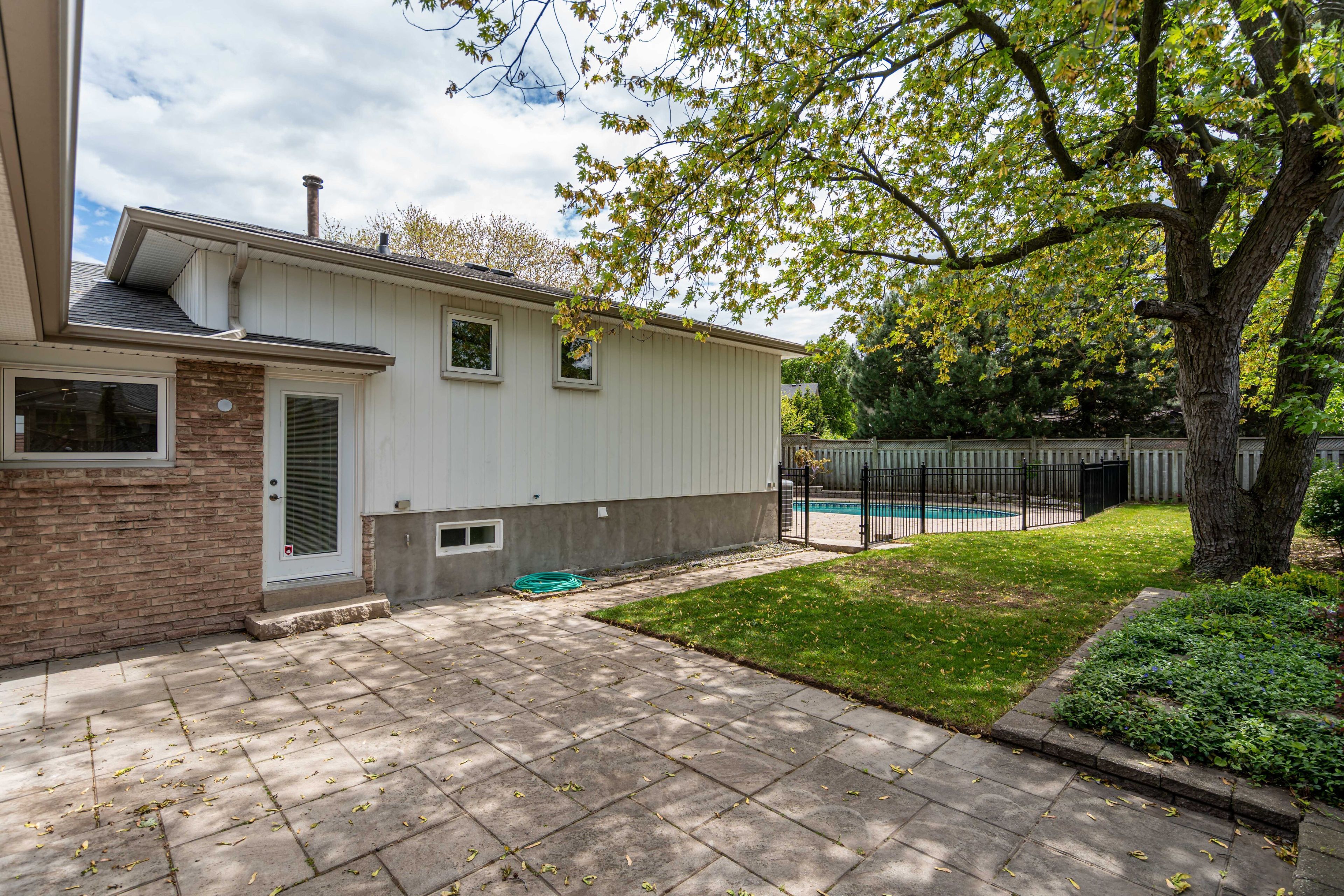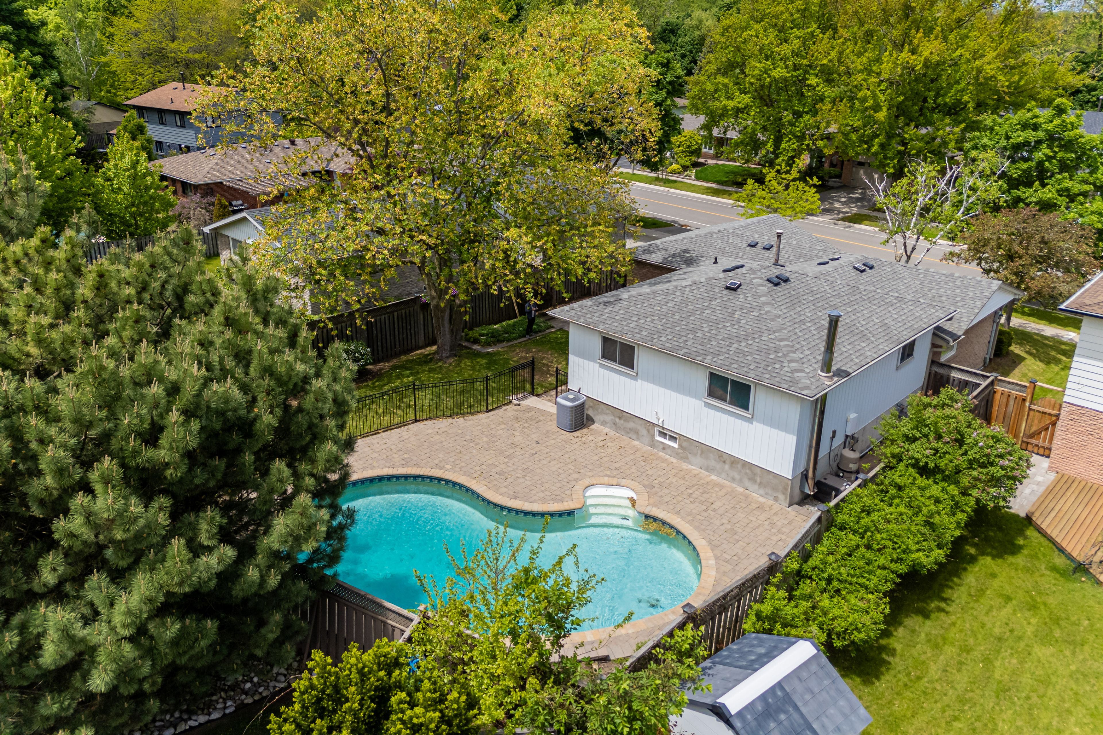 • Private backyard with an inground pool surrounded by mature landscaping.