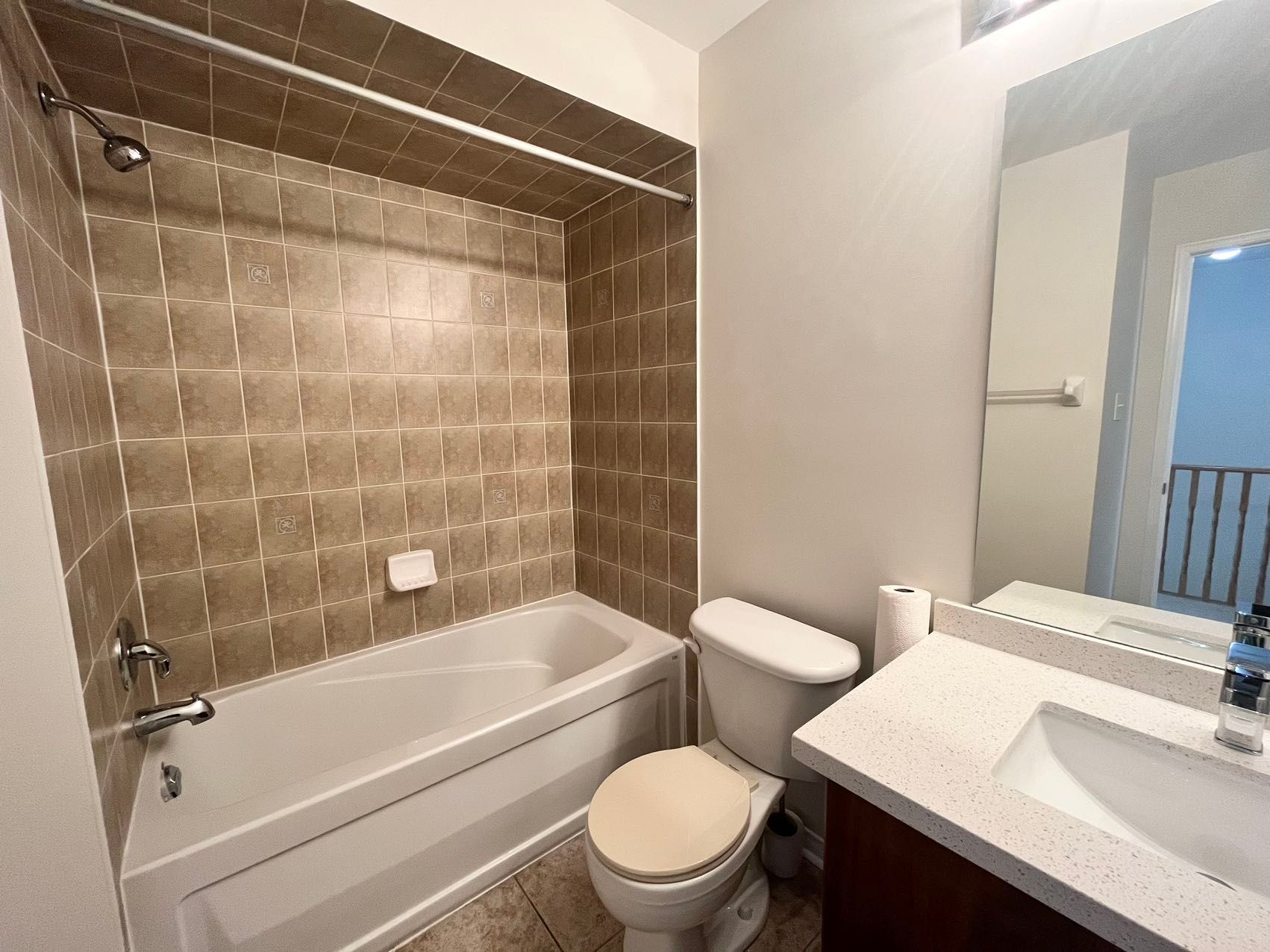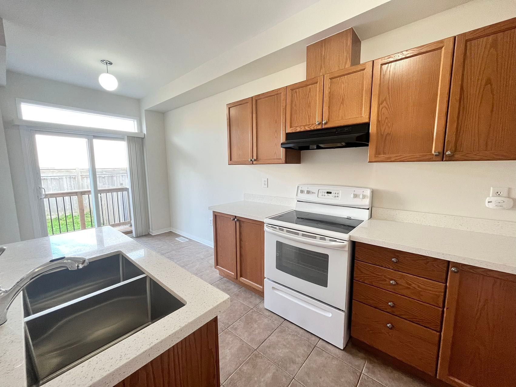 • Modern quartz countertops add a stylish touch to the kitchen.