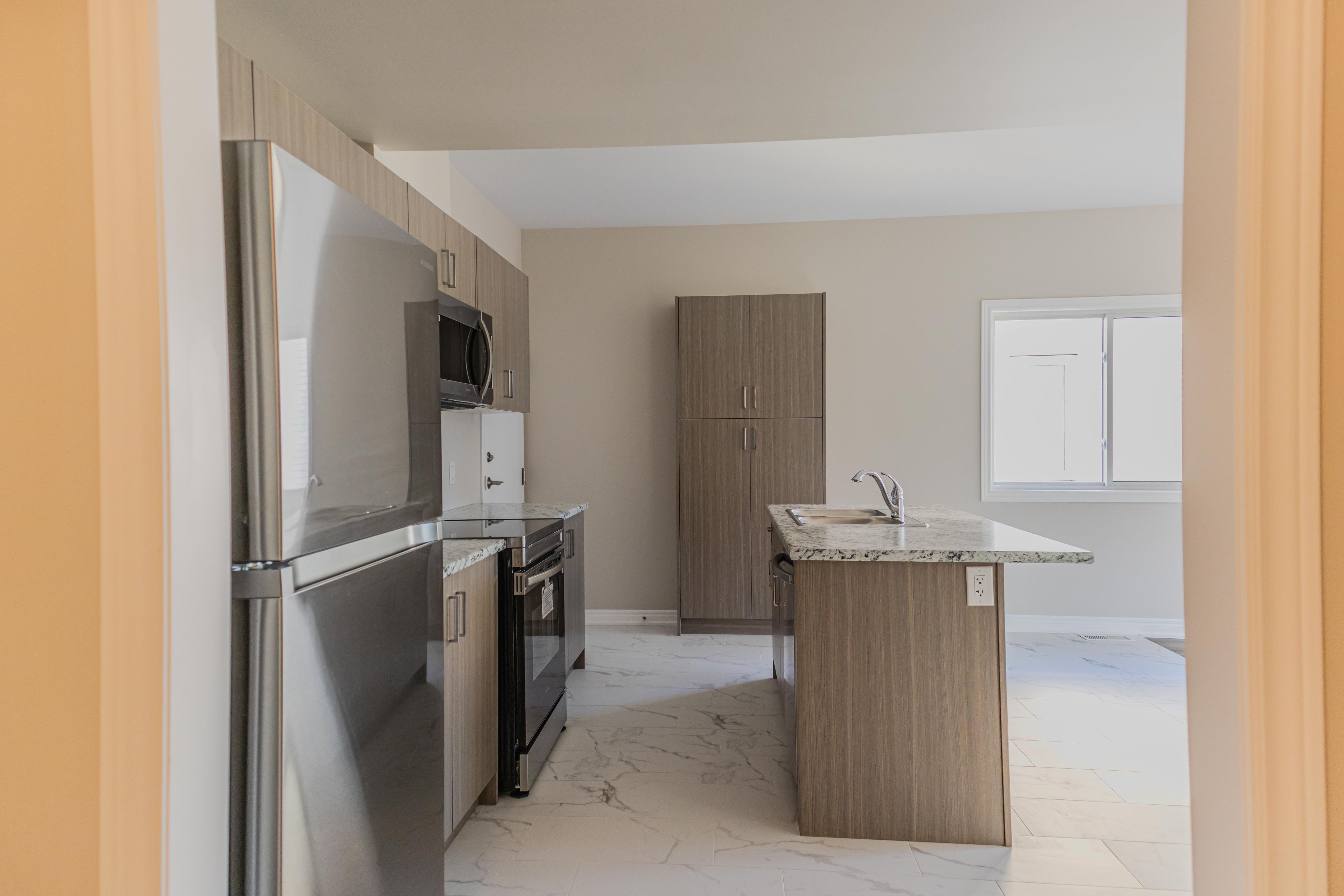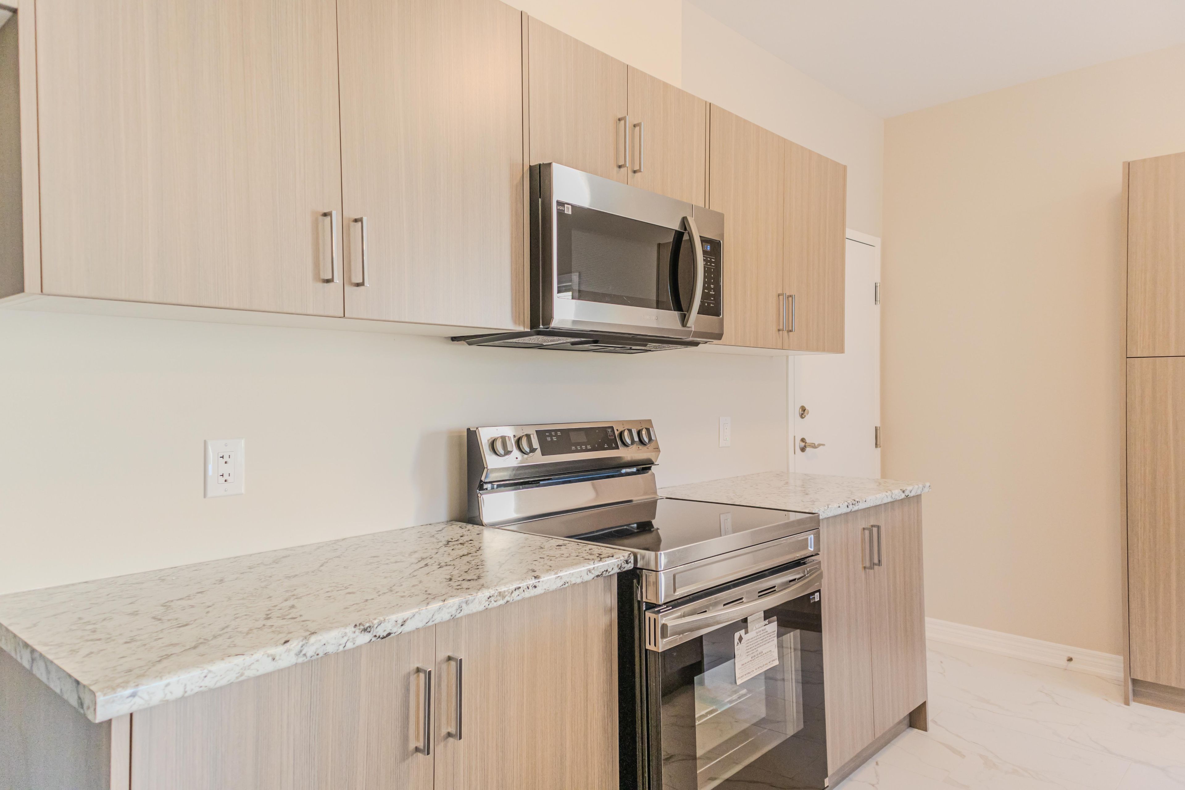 • Stylish kitchen with stainless steel appliances and quartz counters.