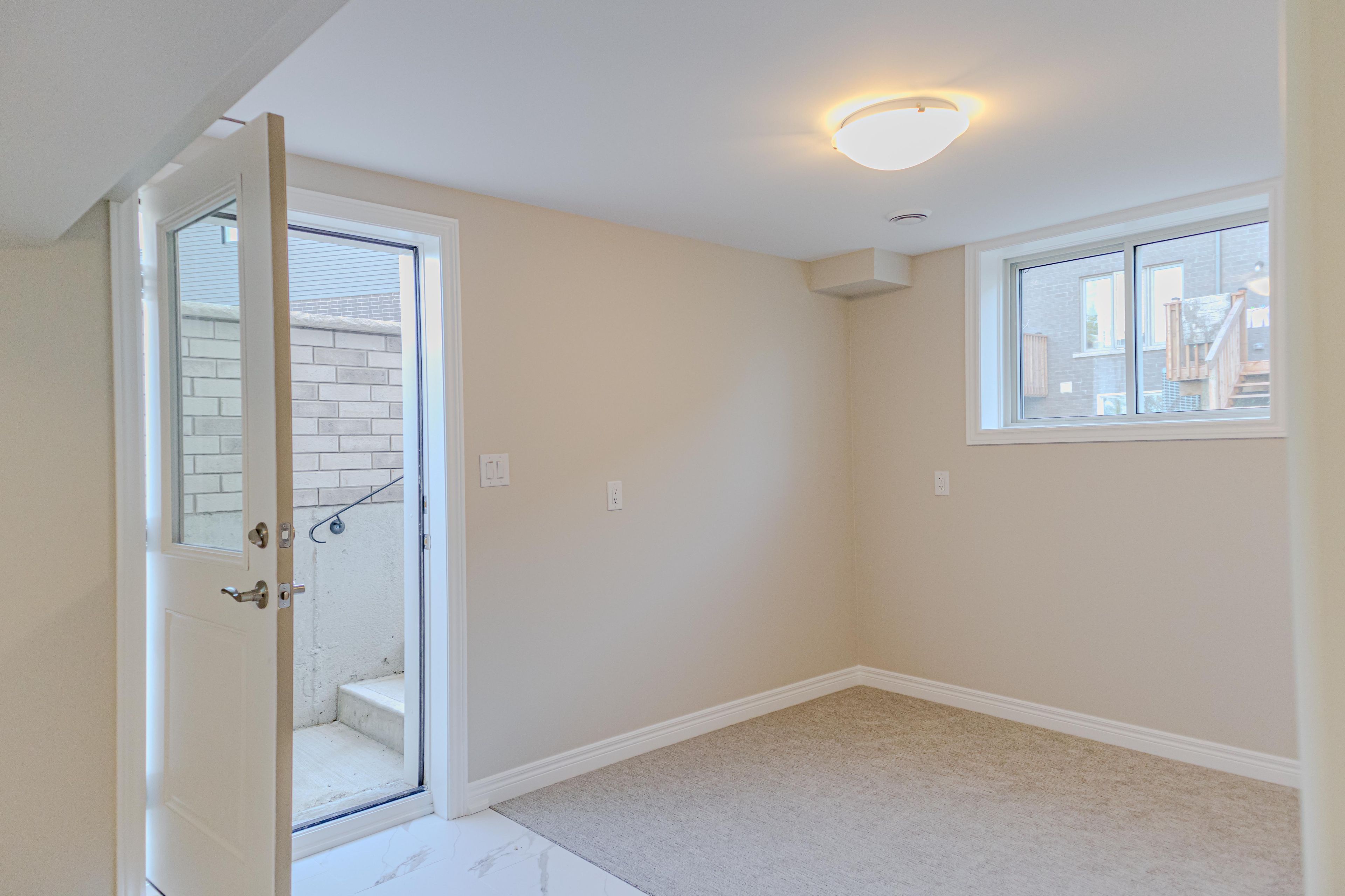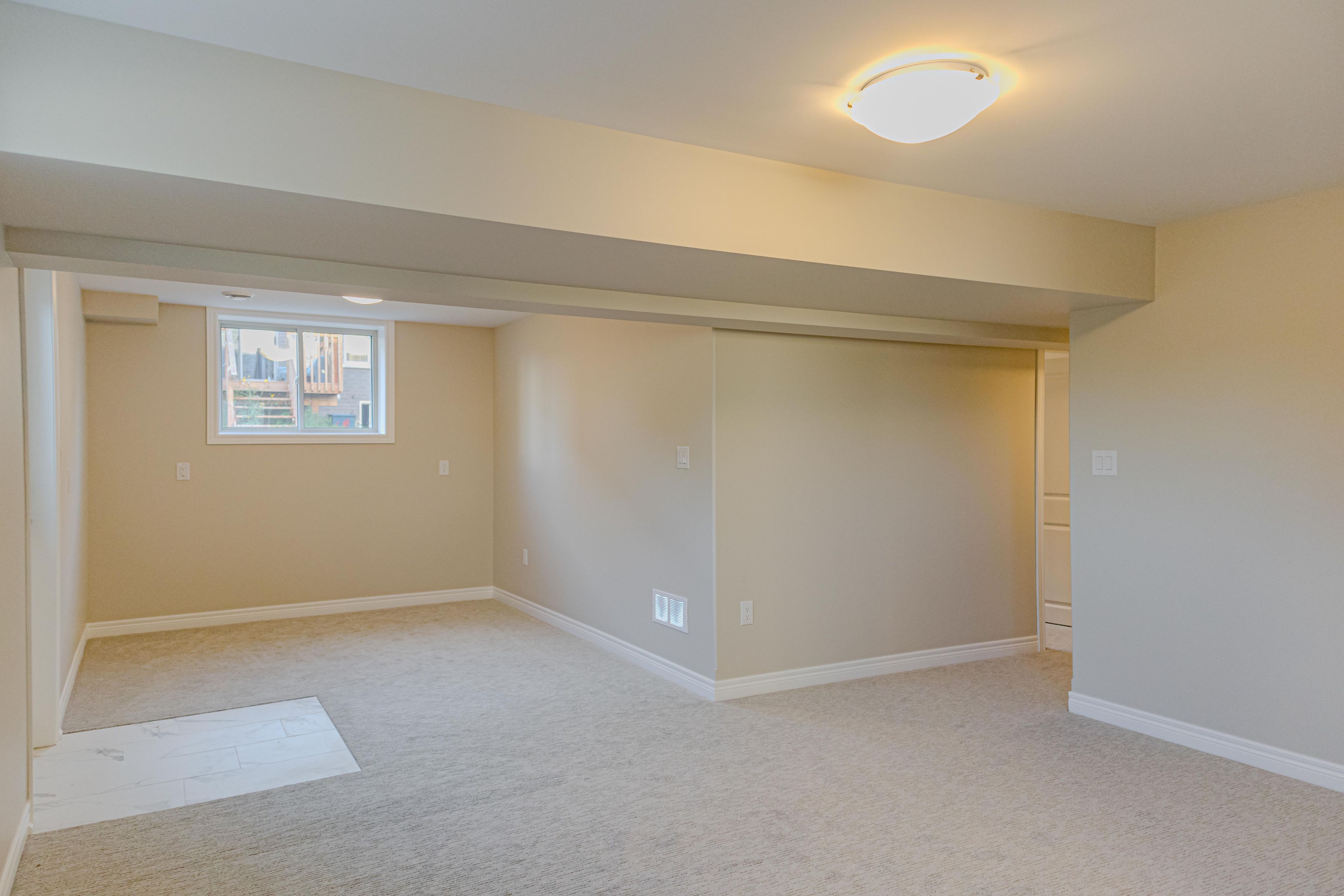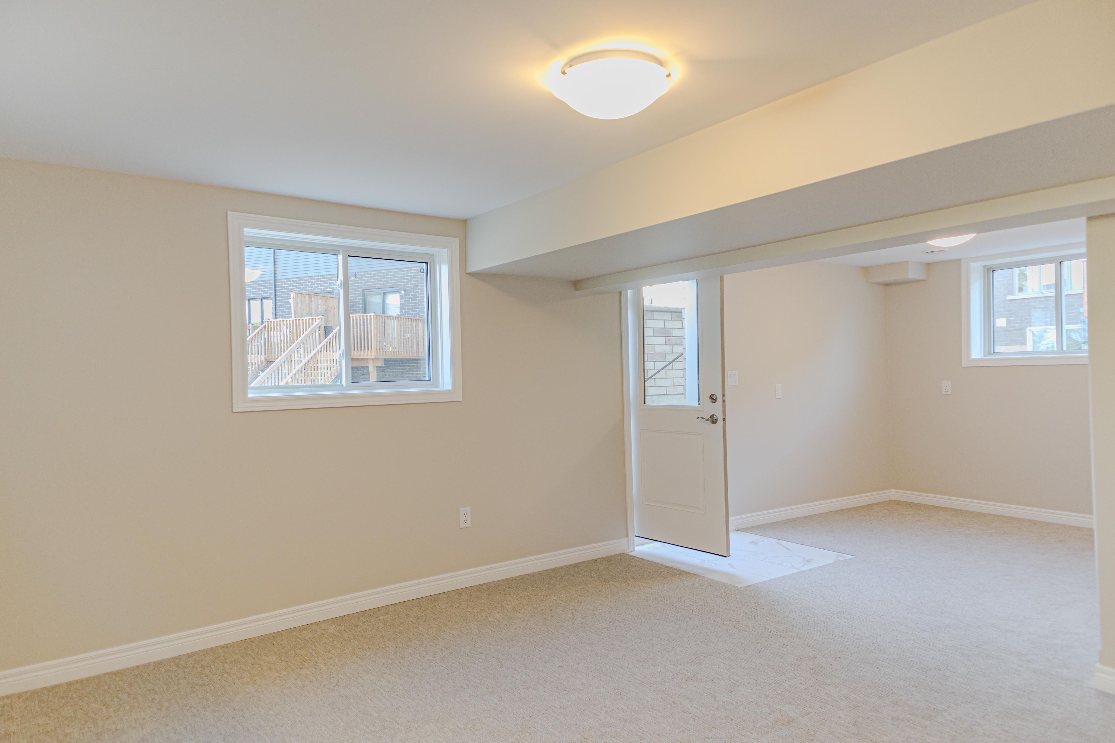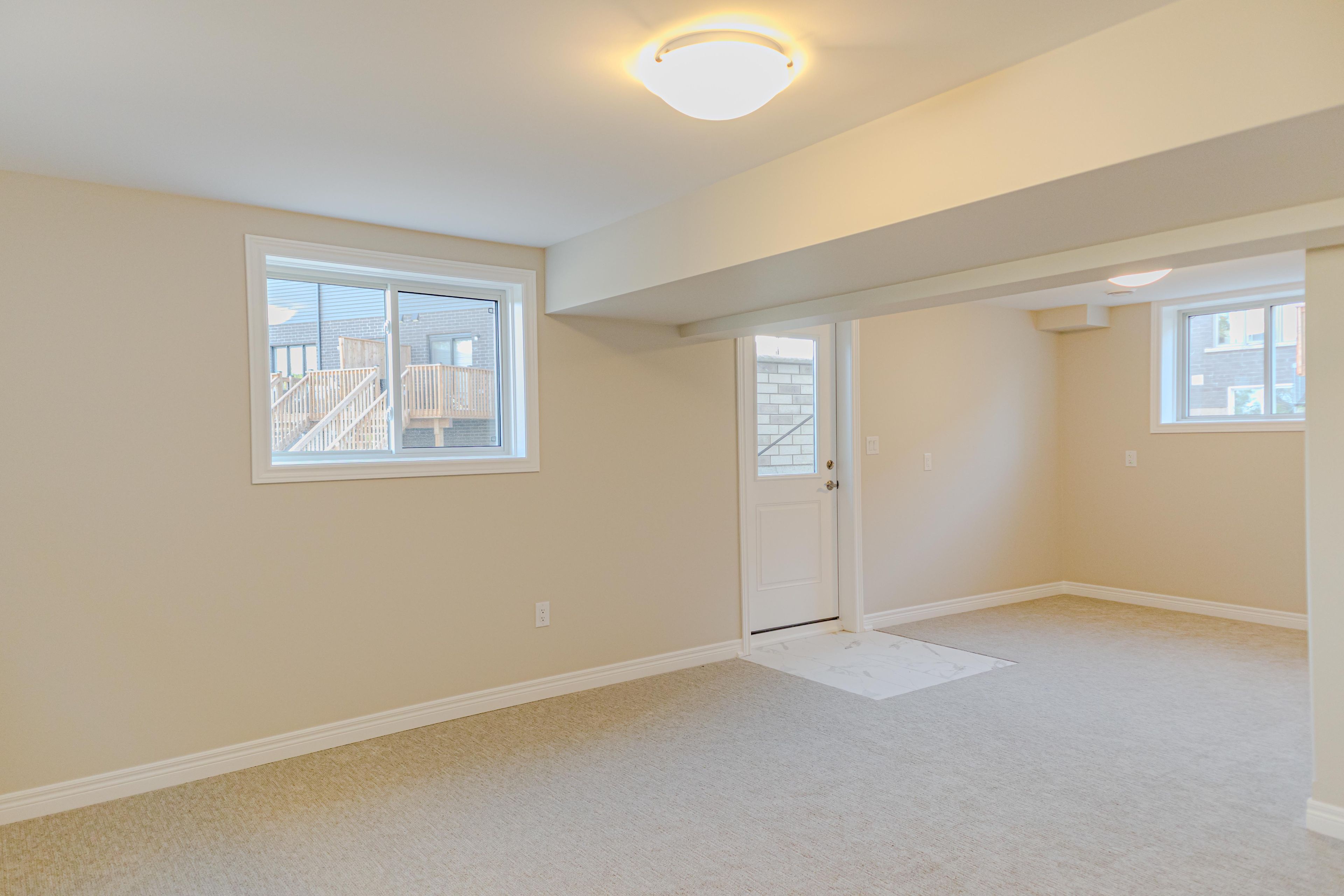 • Basement includes living area, two bedrooms, and a bathroom.