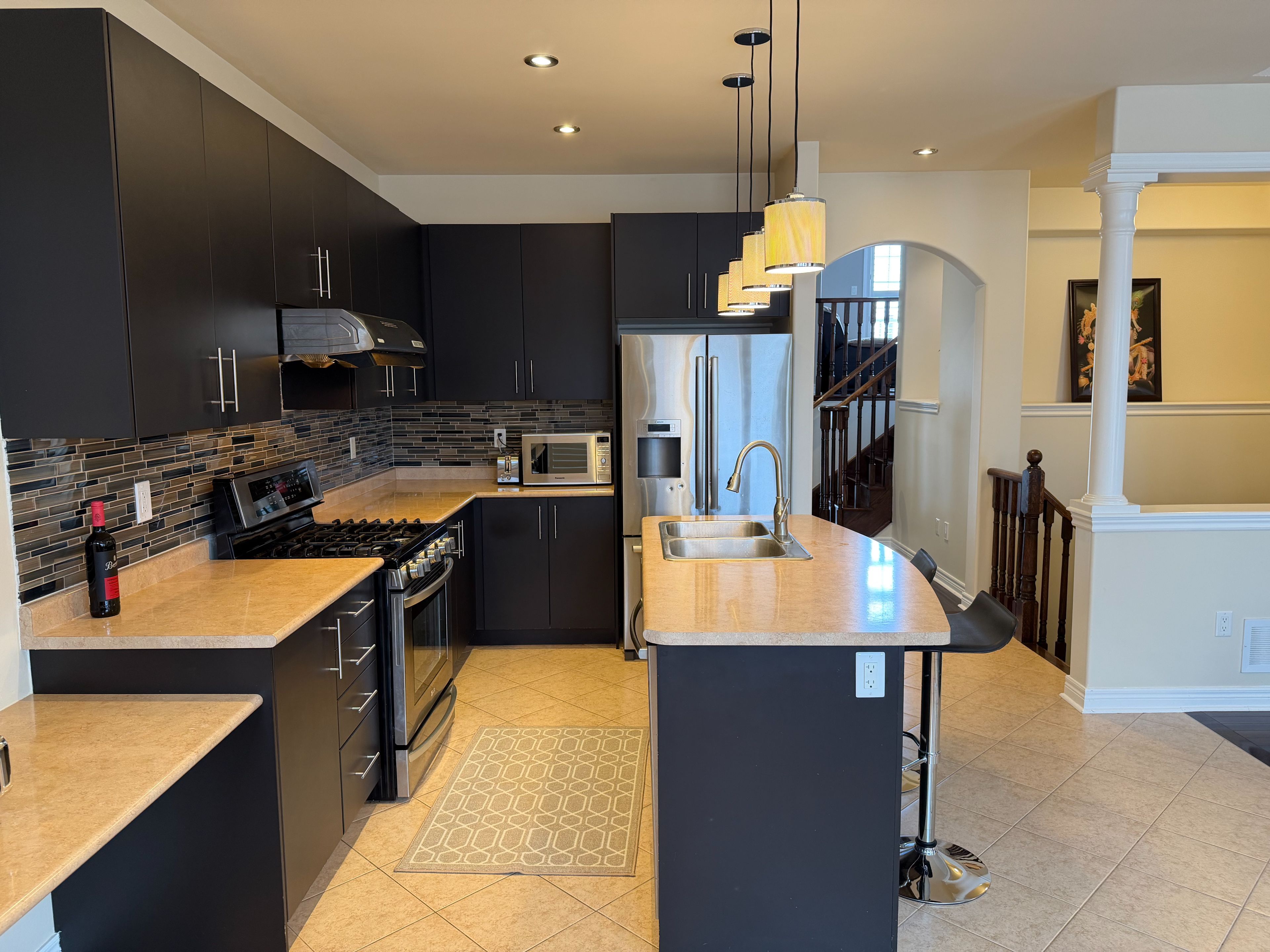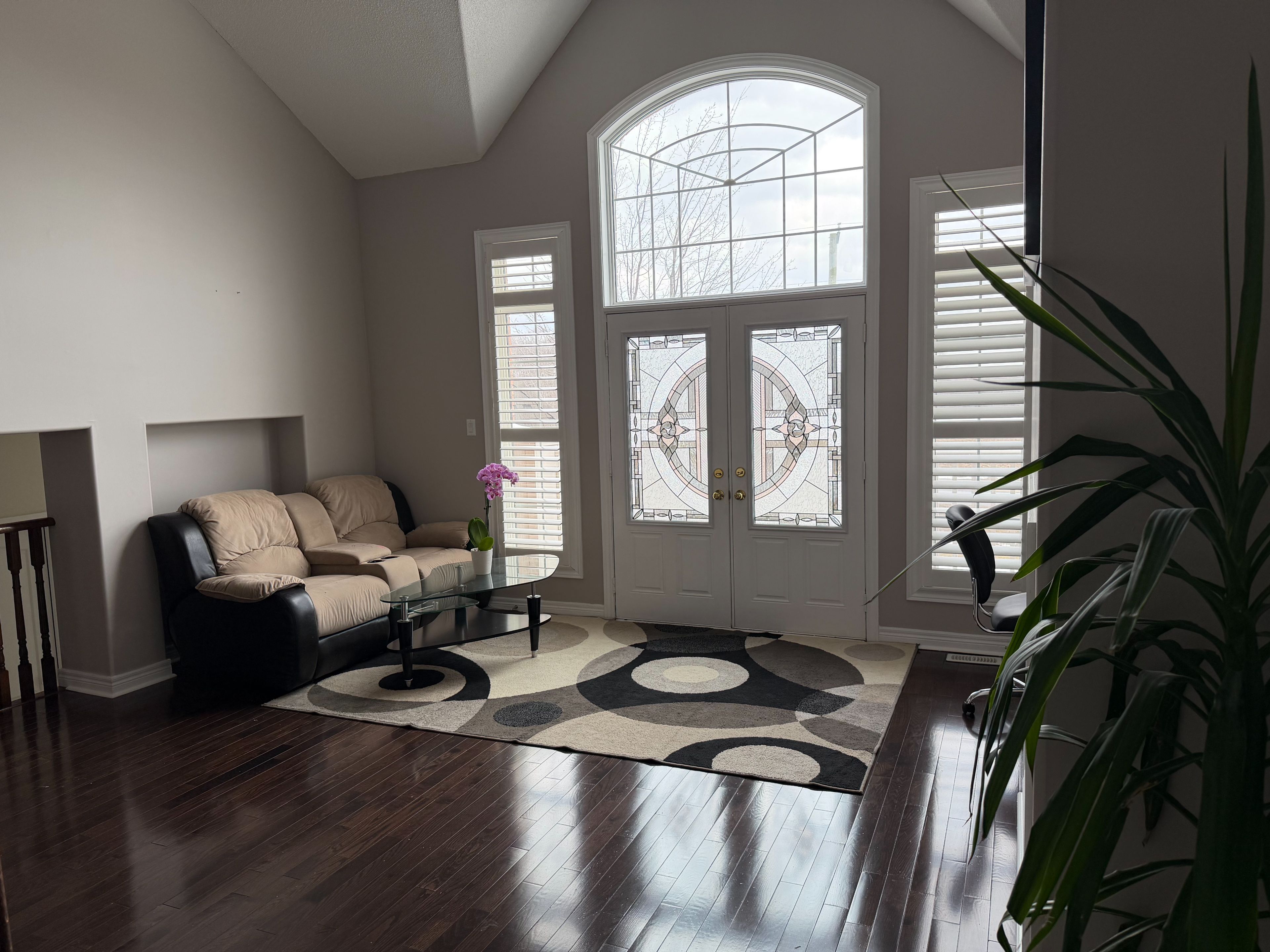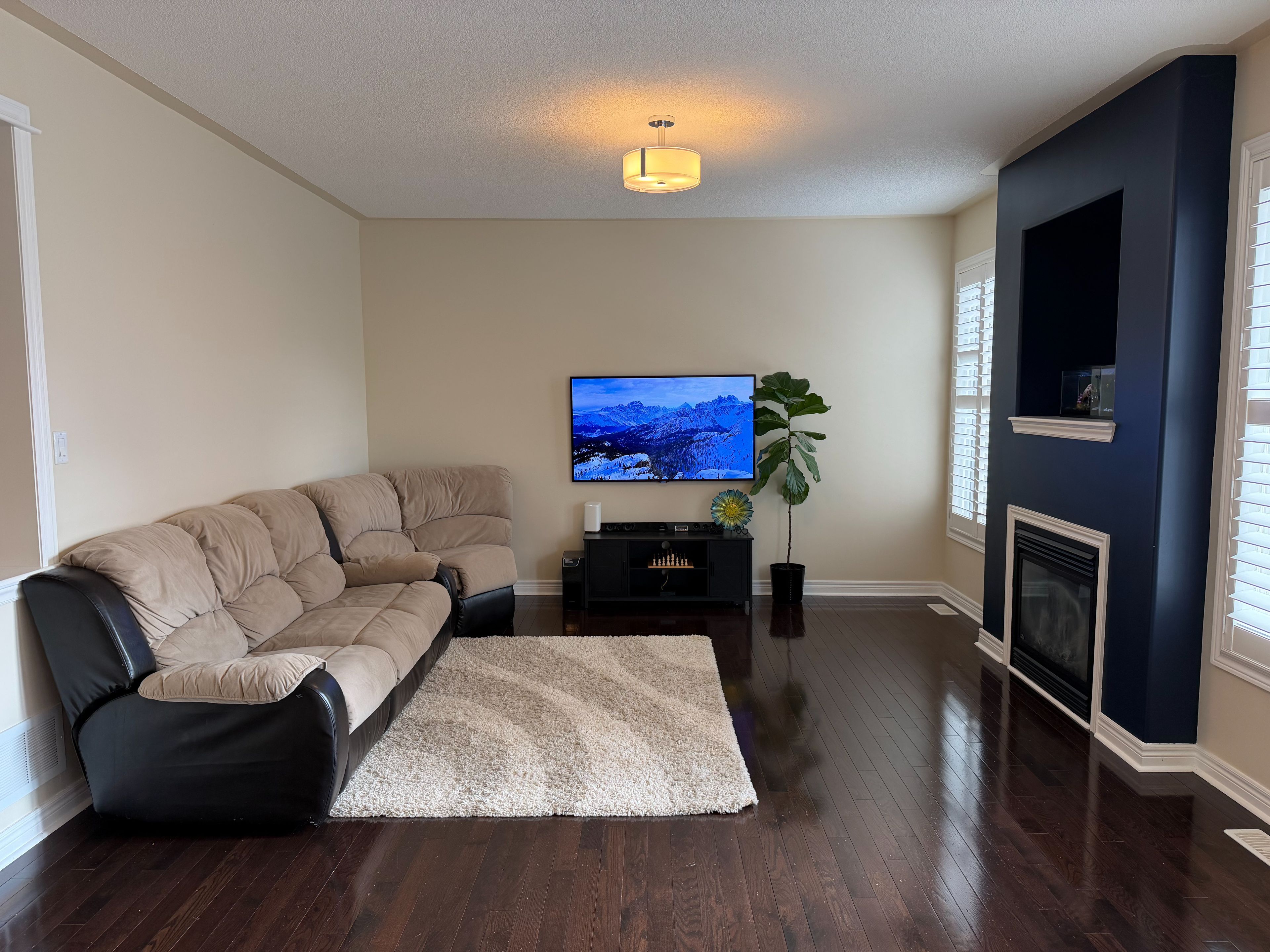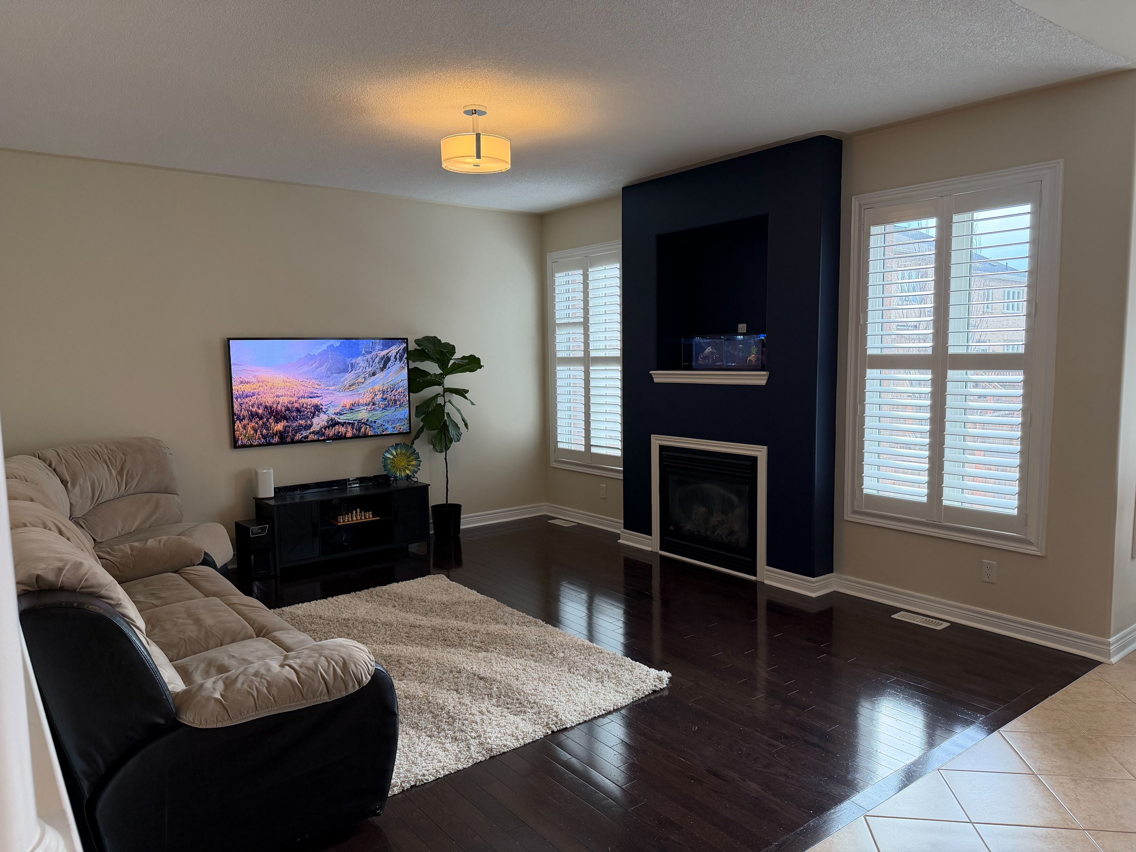 This stunning award-winning jasper model by fieldgate is a must-see, offering an airy, open-concept layout with 2,505 sq. Ft. Of above-grade living space (as per builder's plan). Situated on a rare no-sidewalk 40ft lot, this one-owner home provides a private, serene atmosphere with unobstructed green space views. The heart of the home is the magnificent east-facing mid-level great room, featuring a 21-foot cathedral ceiling, elegant bay windows, and double walk-out doors to a private balcony-perfect for watching the sunrise. The main floor boasts soaring 9-foot ceilings, complemented by chocolate brown stained staircases, matching hardwood floors, and premium california shutters throughout. With over $50k in original builder upgrades, the home features a gourmet kitchen with ebony-stained maple cabinets, a designer glass backsplash, pot lights, and two cozy fireplaces. Practical updates include a brand-new roof (2024) and fresh paint, ensuring a move-in-ready experience. This meticulously maintained home offers parking for 4 vehicles and is being offered on the market for the very first time! Located minutes from the go station, hwy 407/404, schools, and the library.