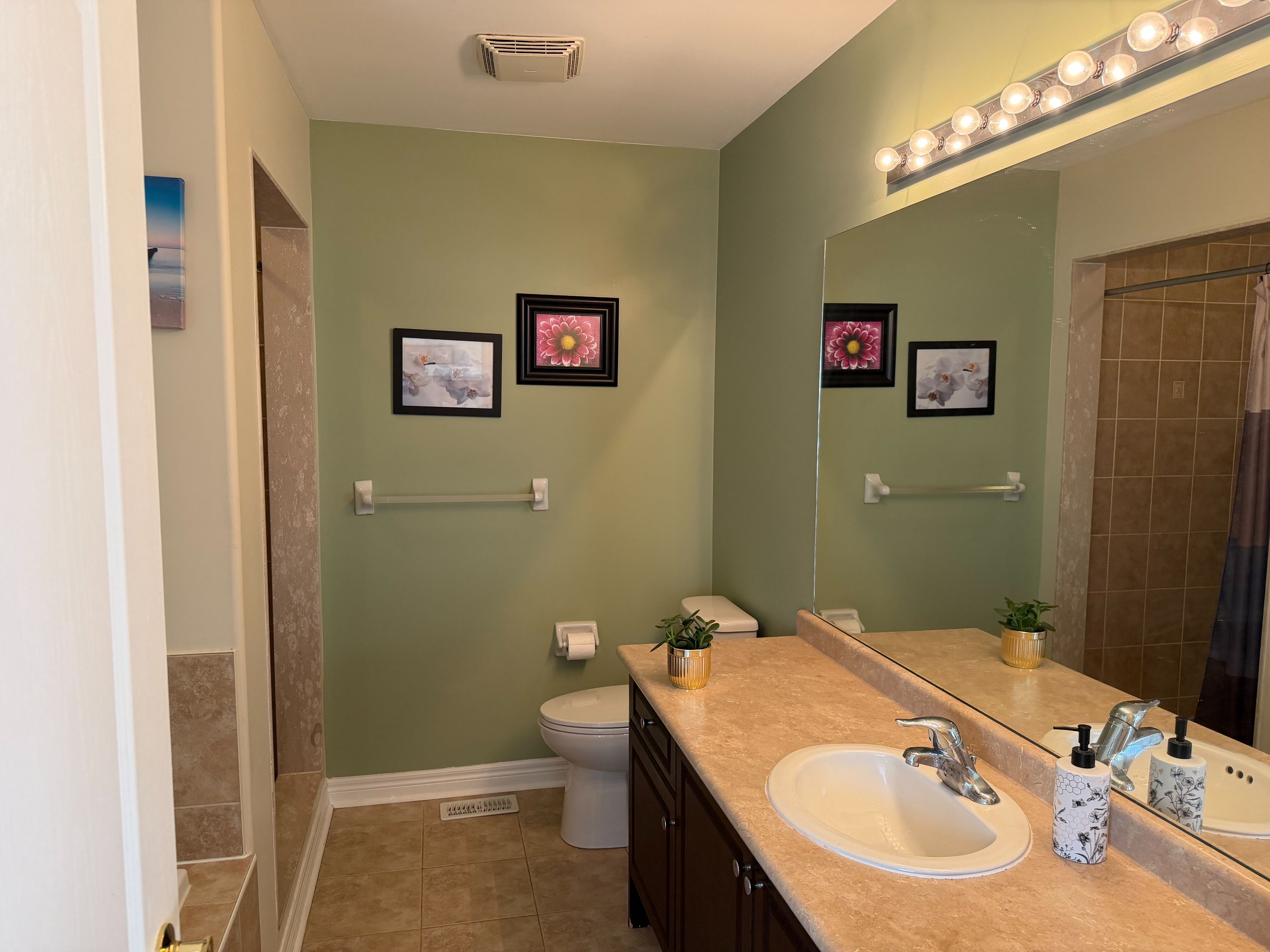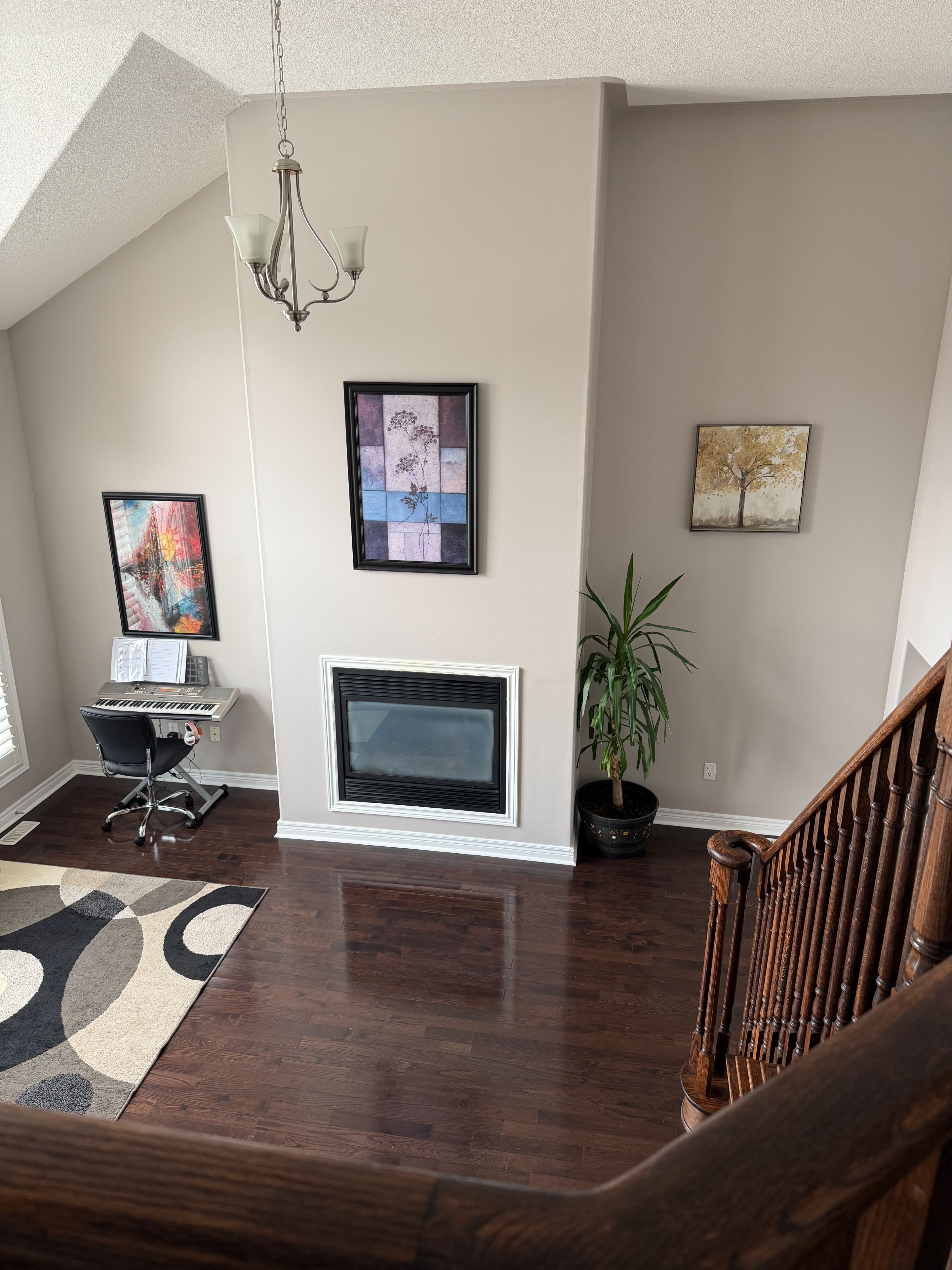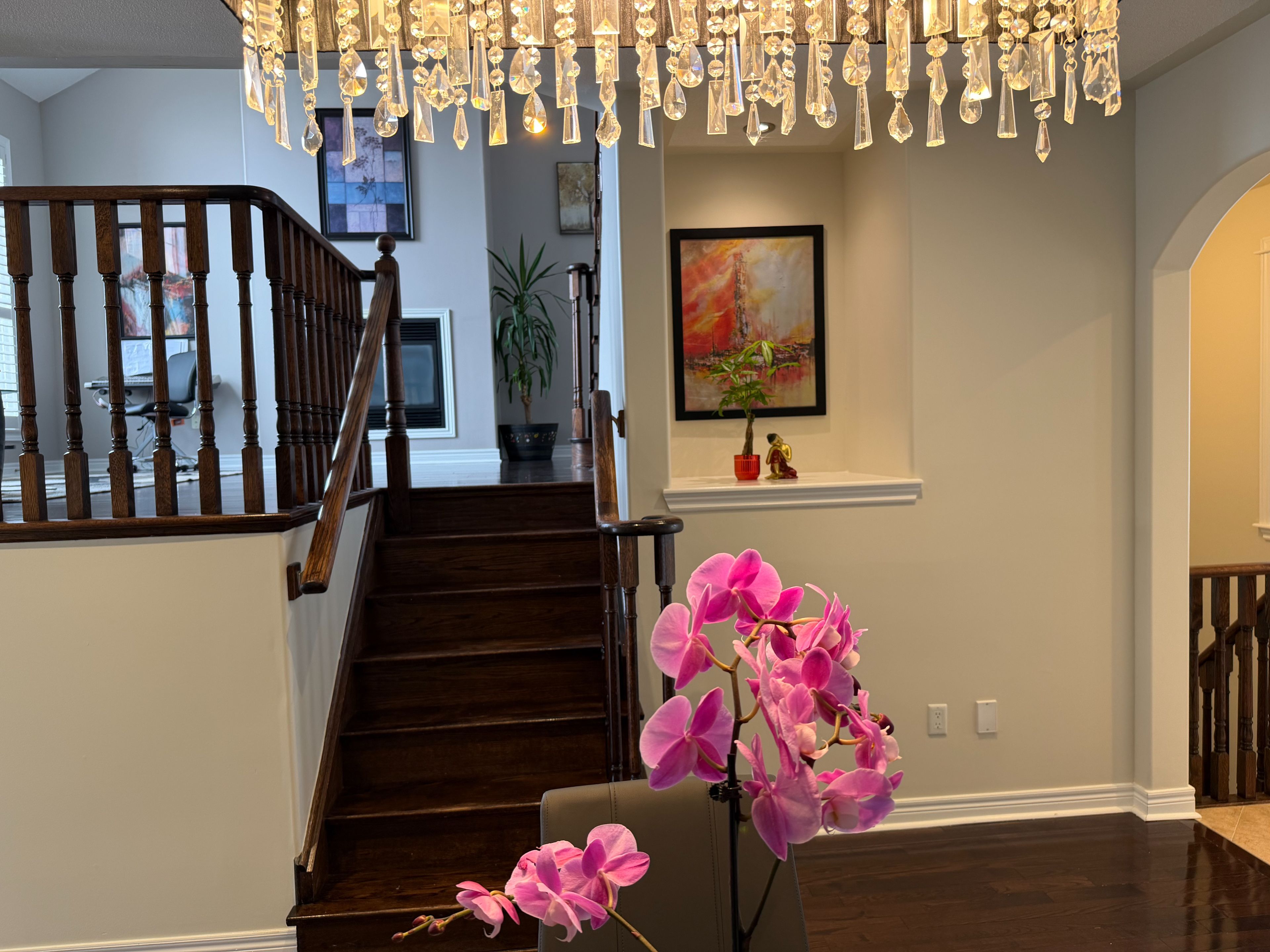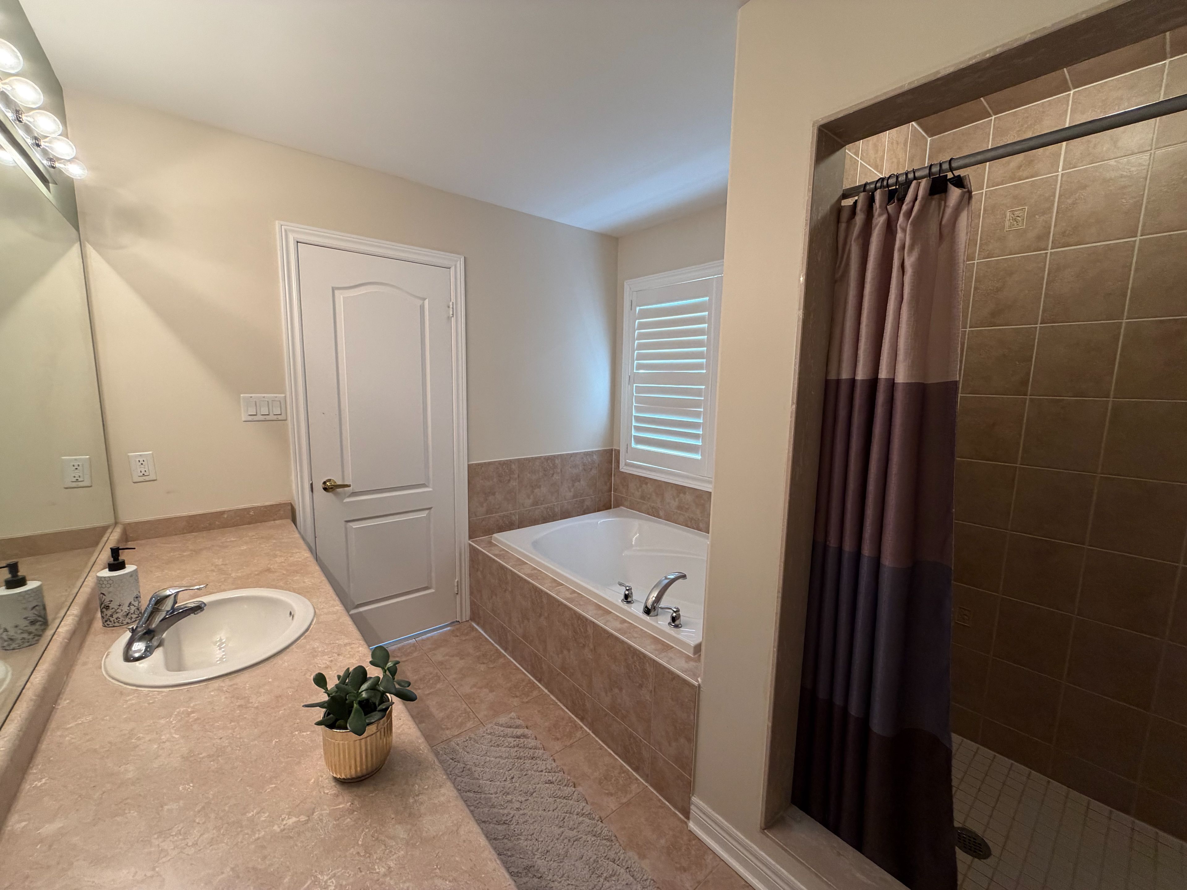 This stunning award-winning jasper model by fieldgate is a must-see, offering an airy, open-concept layout with 2,505 sq. Ft. Of above-grade living space (as per builder's plan). Situated on a rare no-sidewalk 40ft lot, this one-owner home provides a private, serene atmosphere with unobstructed green space views. The heart of the home is the magnificent east-facing mid-level great room, featuring a 21-foot cathedral ceiling, elegant bay windows, and double walk-out doors to a private balcony-perfect for watching the sunrise. The main floor boasts soaring 9-foot ceilings, complemented by chocolate brown stained staircases, matching hardwood floors, and premium california shutters throughout. With over $50k in original builder upgrades, the home features a gourmet kitchen with ebony-stained maple cabinets, a designer glass backsplash, pot lights, and two cozy fireplaces. Practical updates include a brand-new roof (2024) and fresh paint, ensuring a move-in-ready experience. This meticulously maintained home offers parking for 4 vehicles and is being offered on the market for the very first time! Located minutes from the go station, hwy 407/404, schools, and the library.