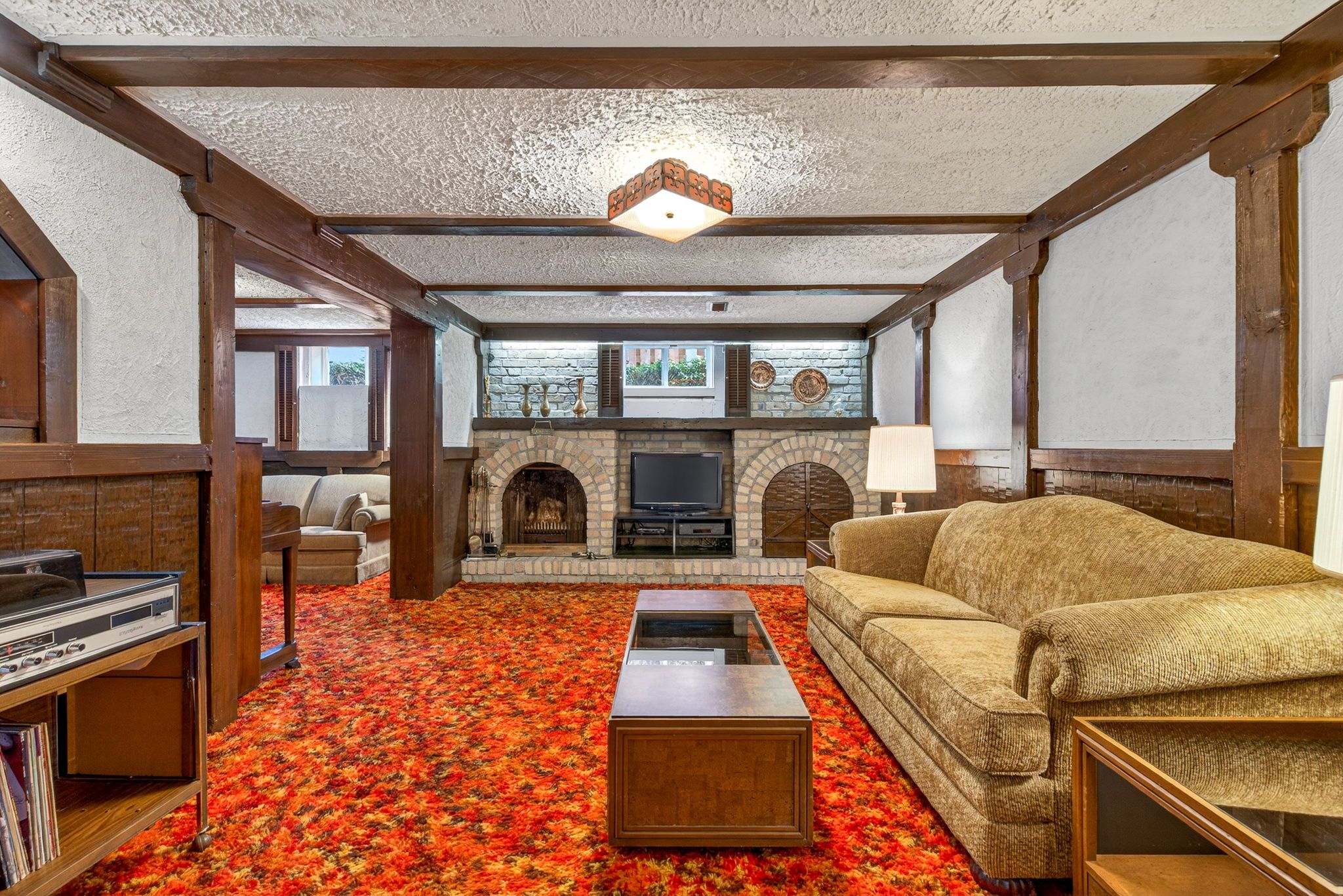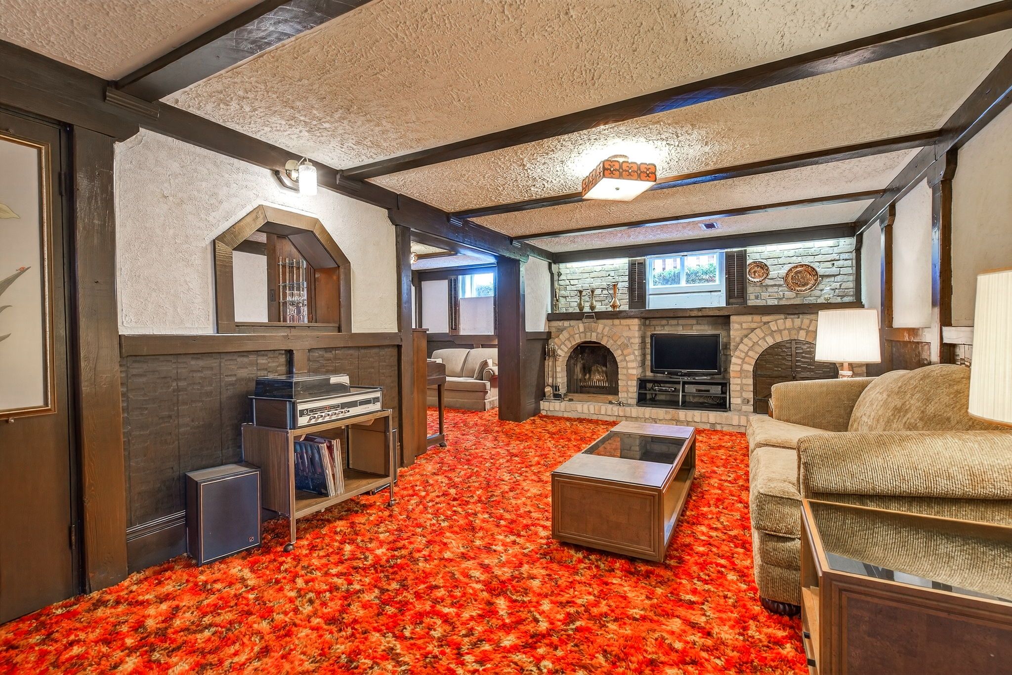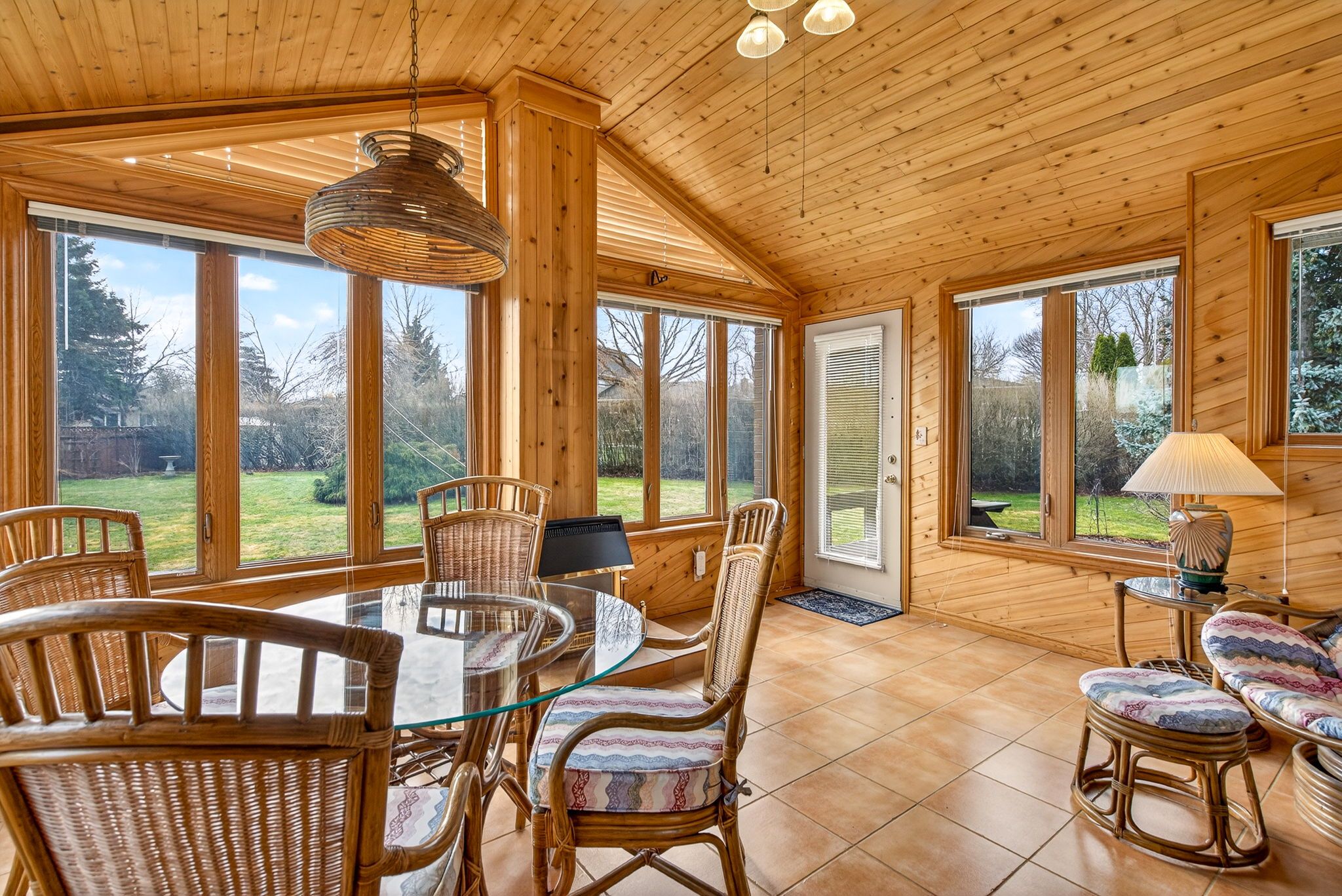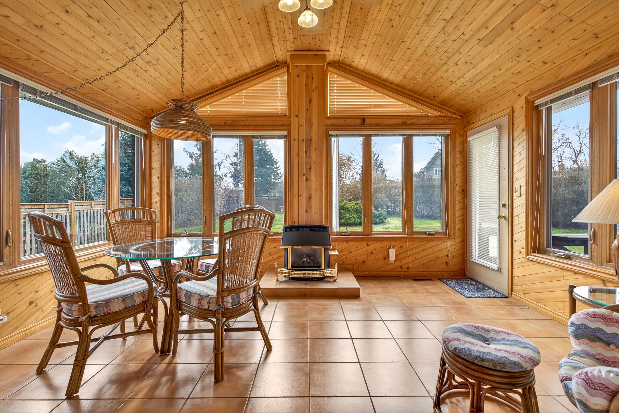 • Bright and warm interiors with a cozy fireplace and sunroom.