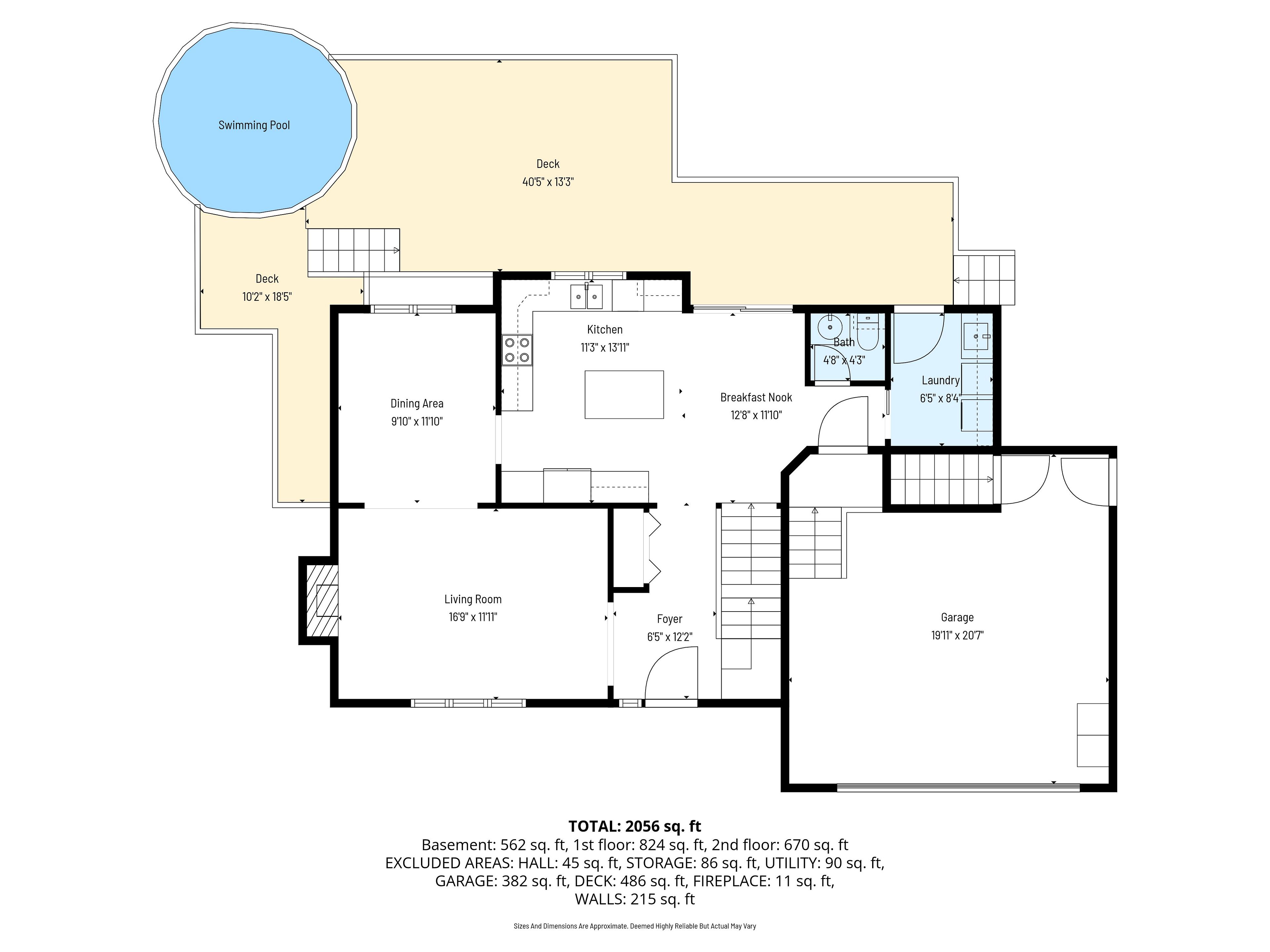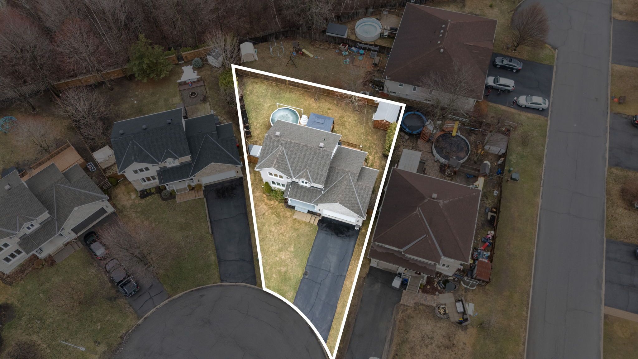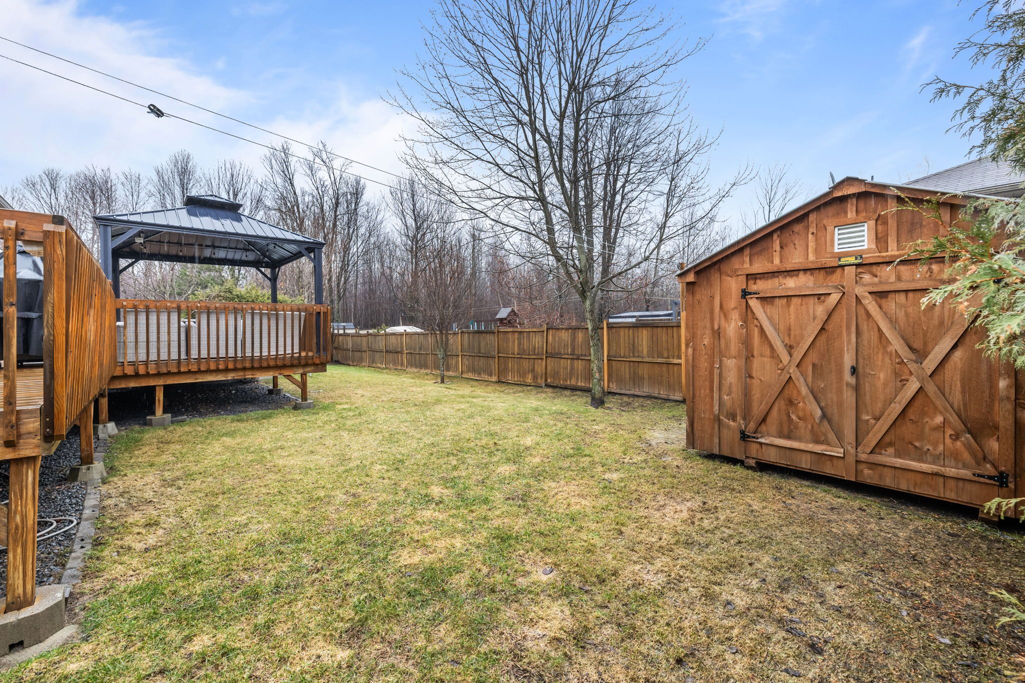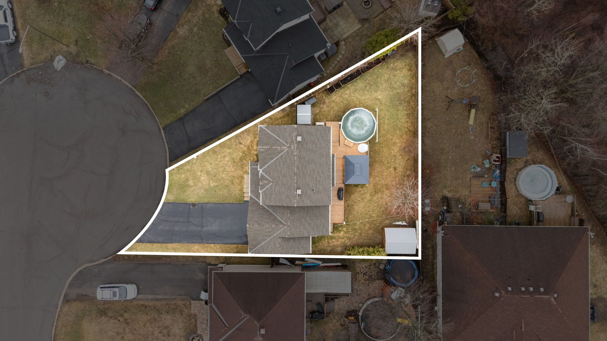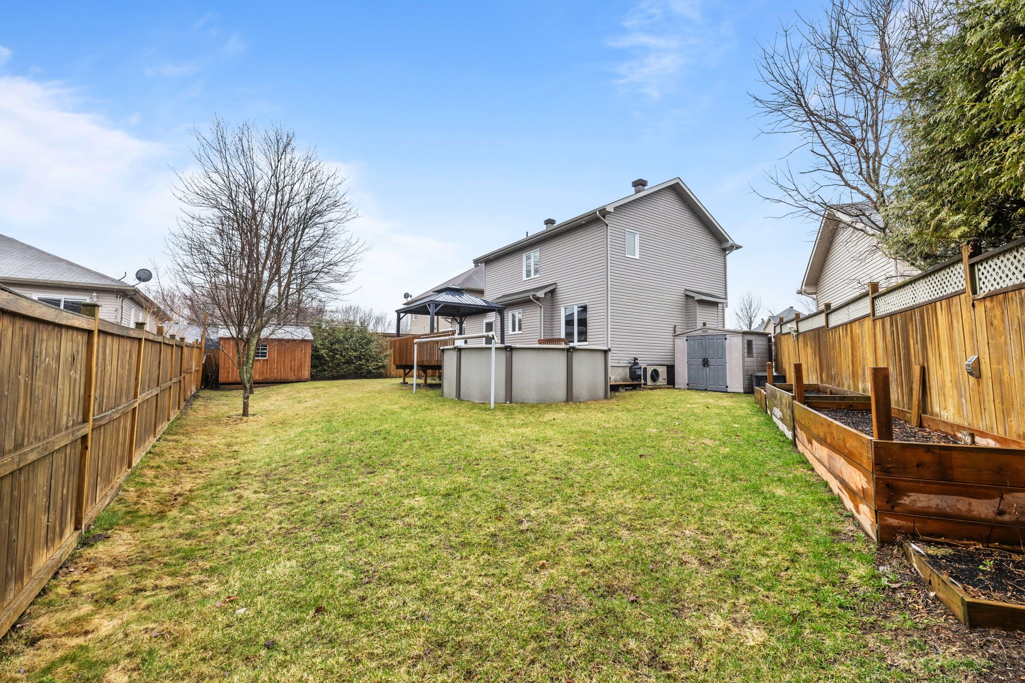 • Backyard features a large deck, pool, and storage sheds for outdoor enjoyment.