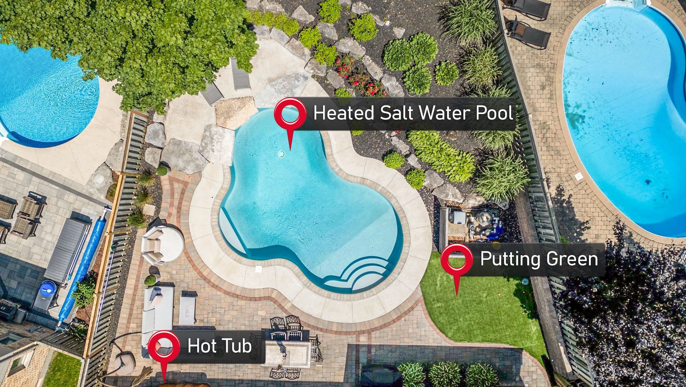• Private resort-like backyard with heated pool, hot tub, and patios.