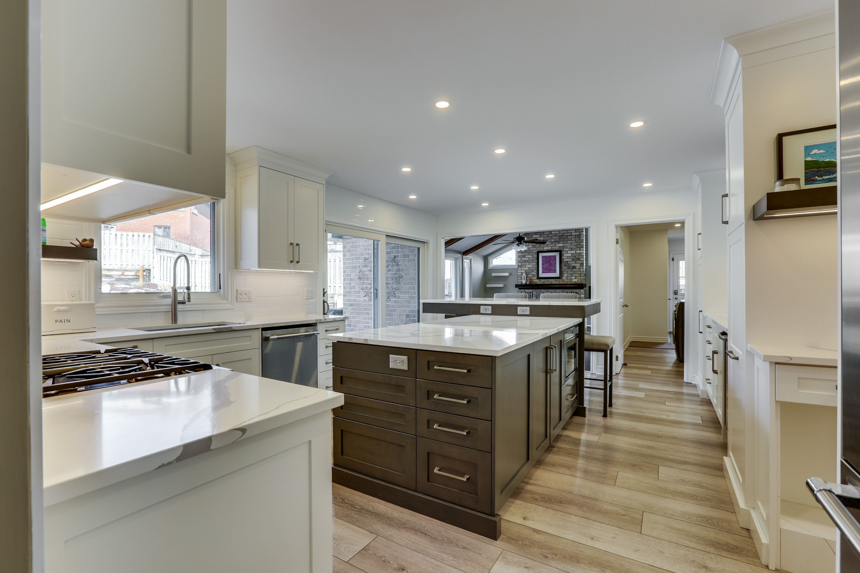 • Custom kitchen with quartz island and high-end Thermador appliances.