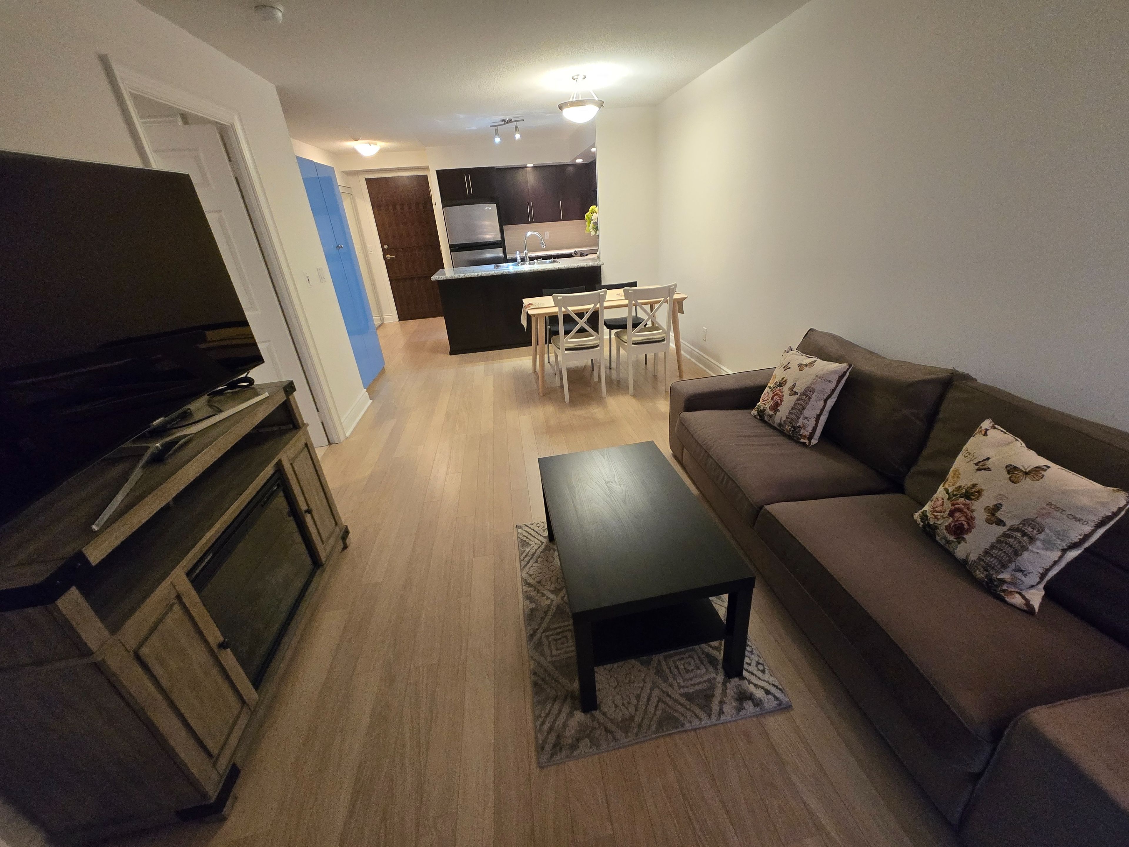 • Open concept living and dining area leads to a balcony.