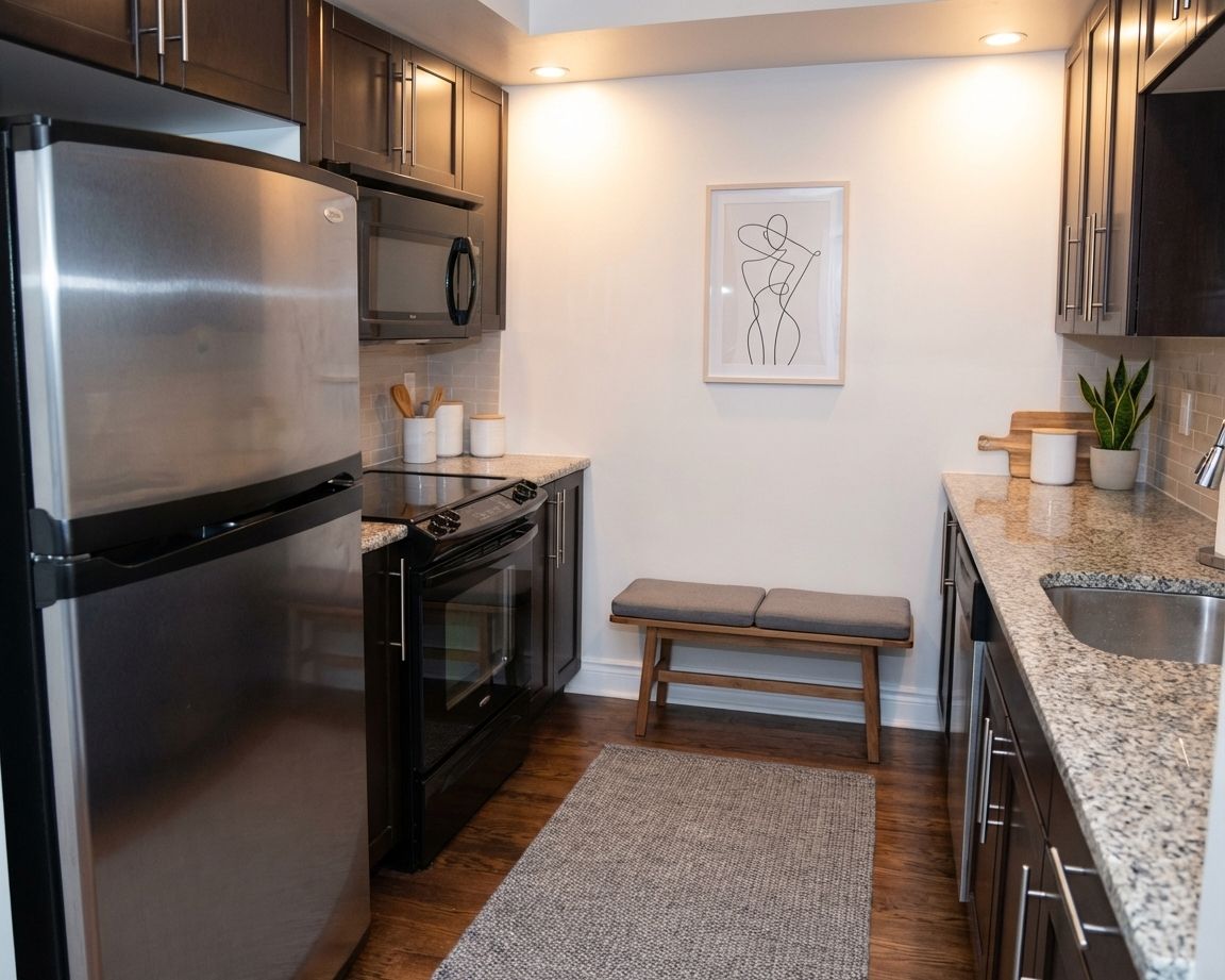 • Modern kitchen featuring granite countertops and stainless steel appliances.