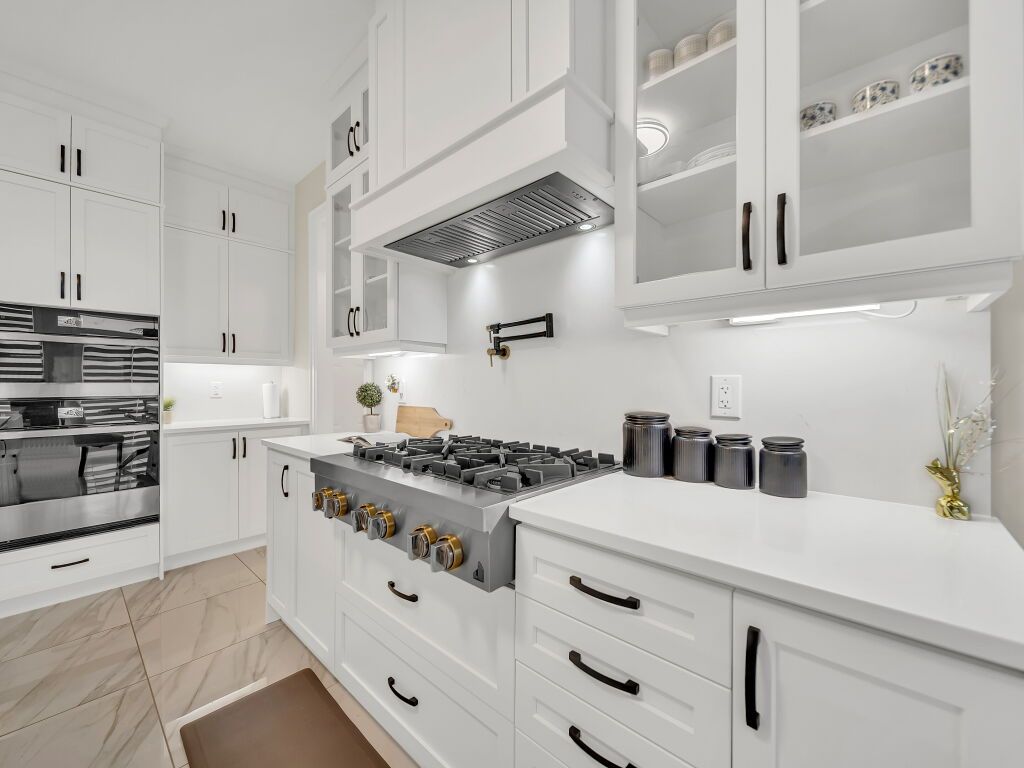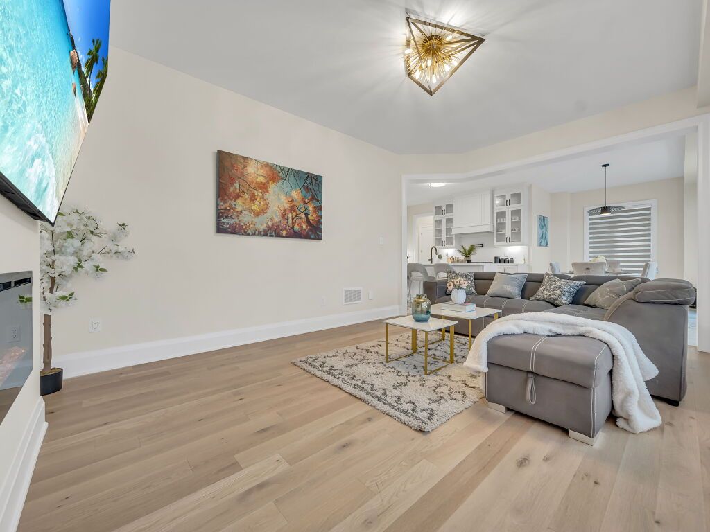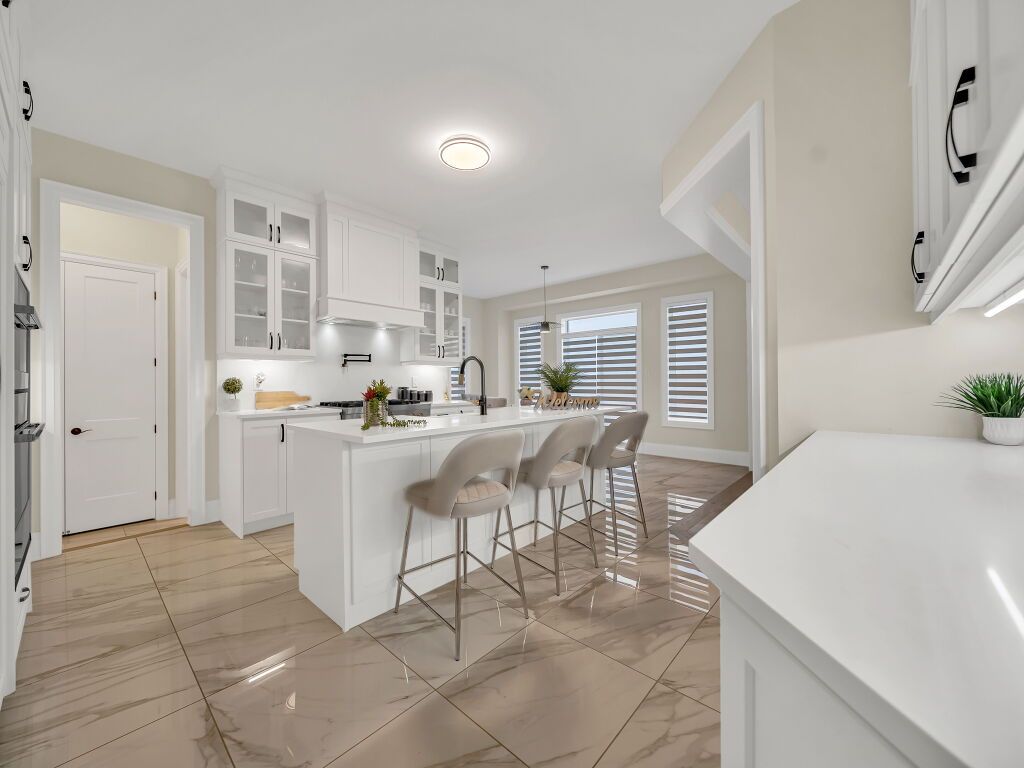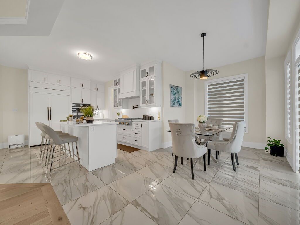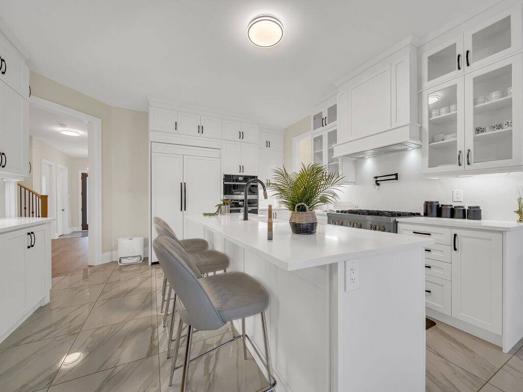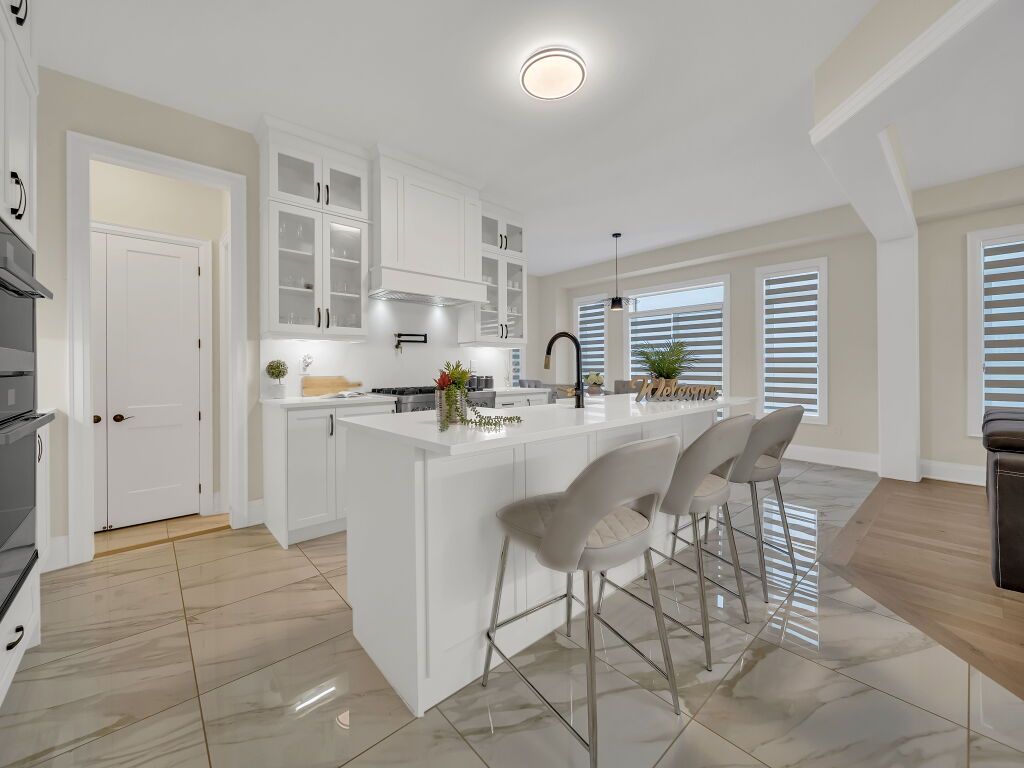 • Open-concept kitchen with built-in appliances and breakfast bar.