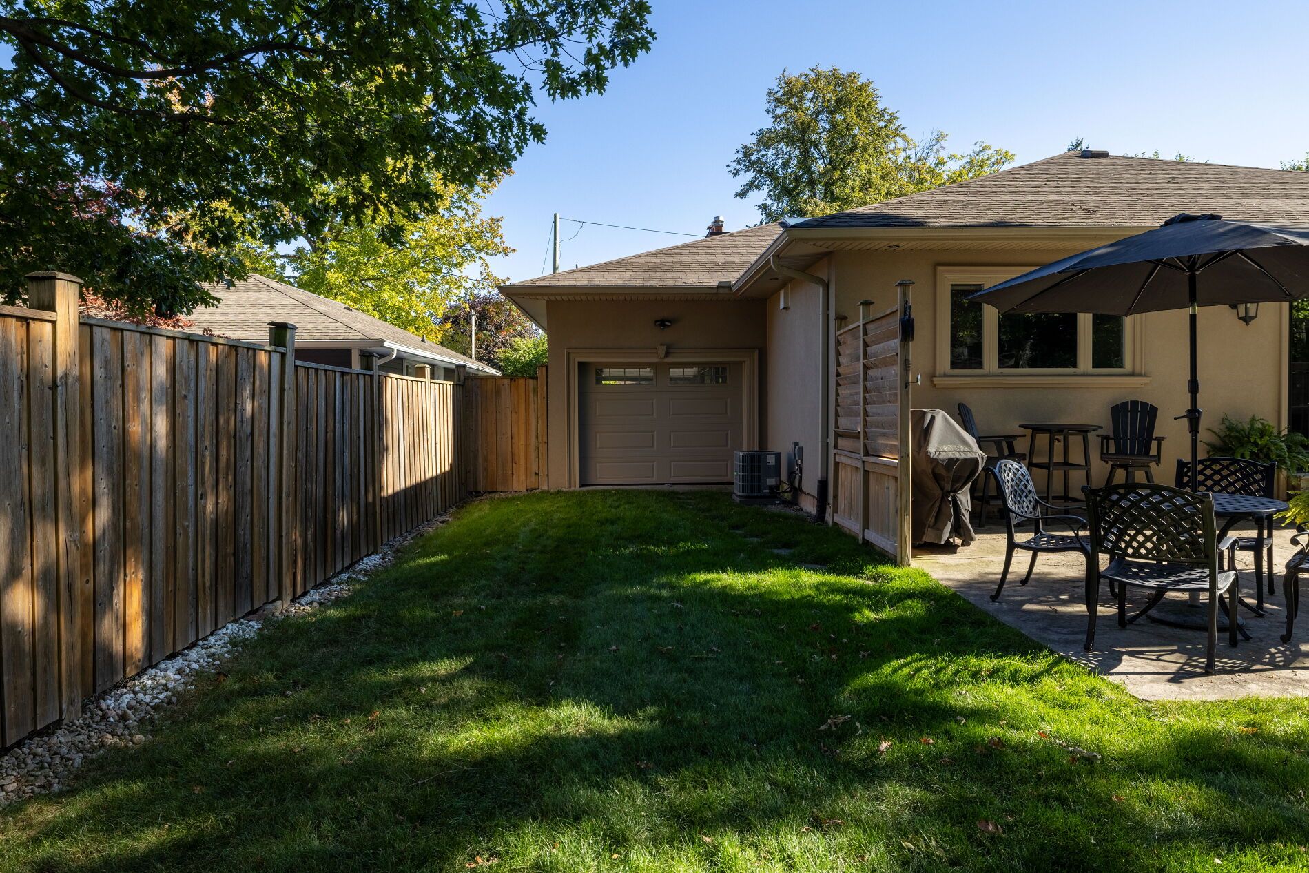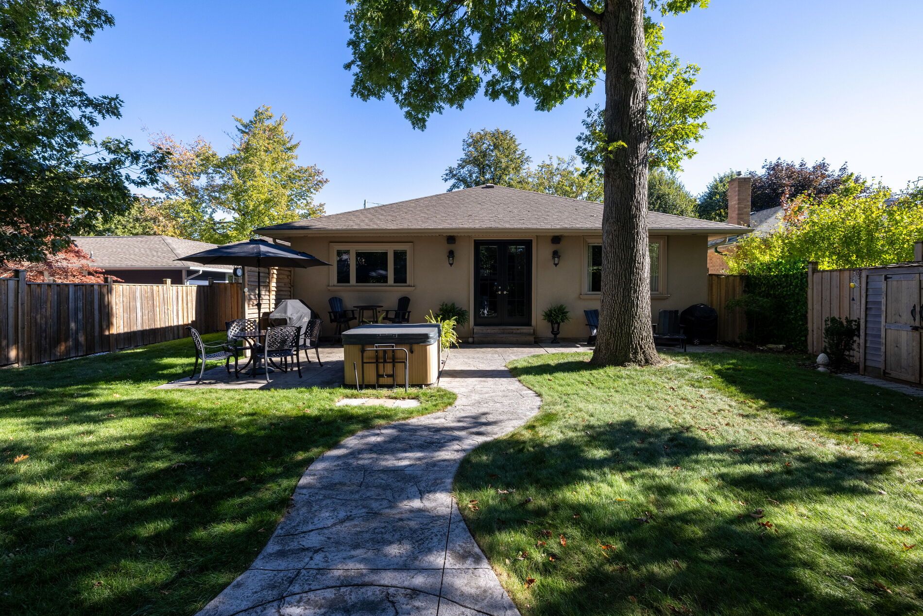 • Private fenced backyard featuring hot tub, pergola, and entertaining spaces.