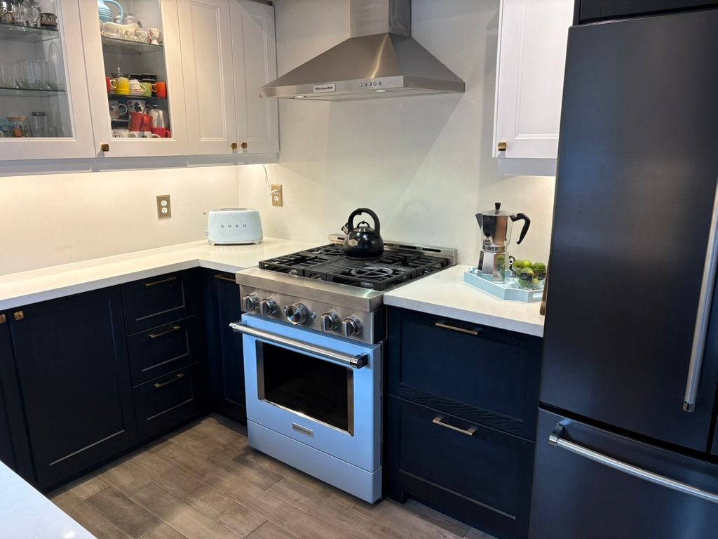 • Modern kitchen with quartz counters and patio access.