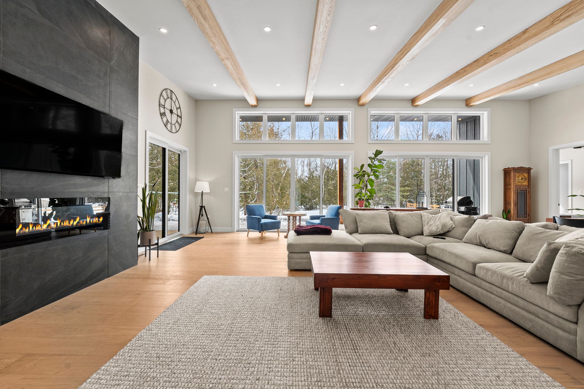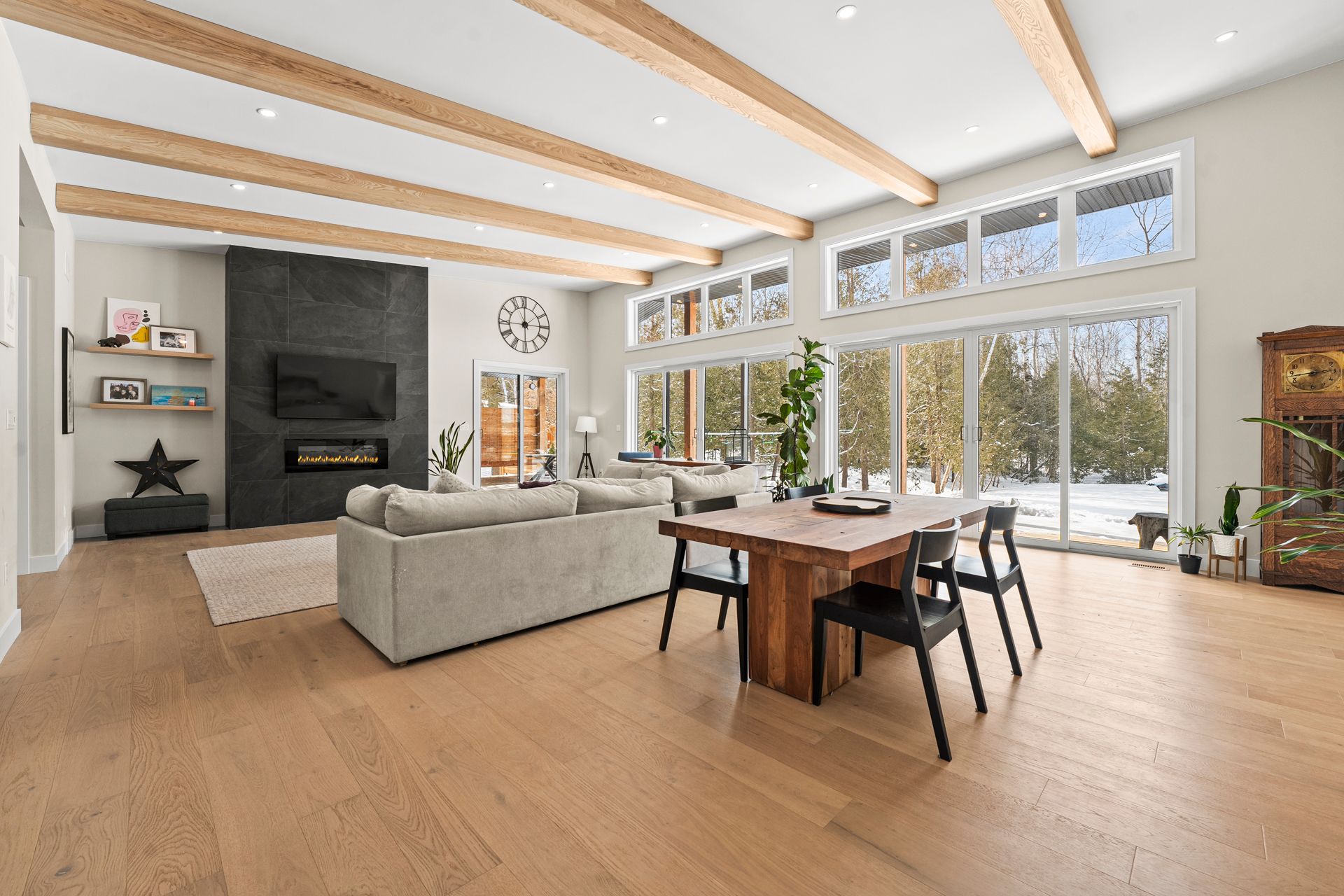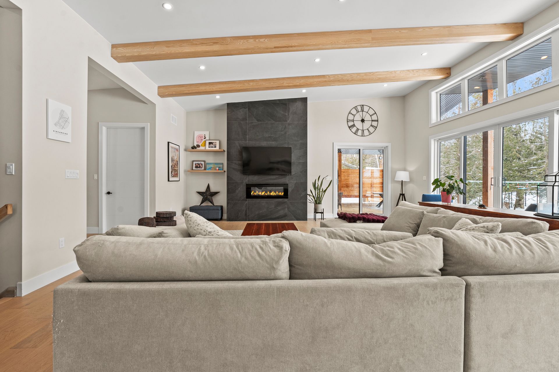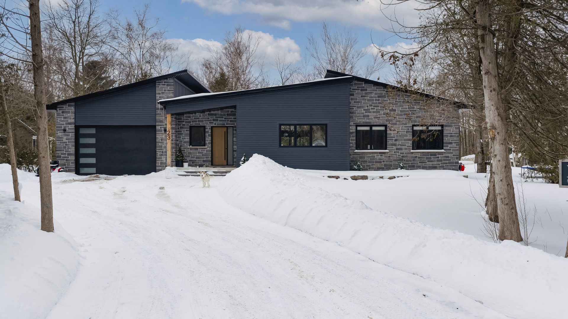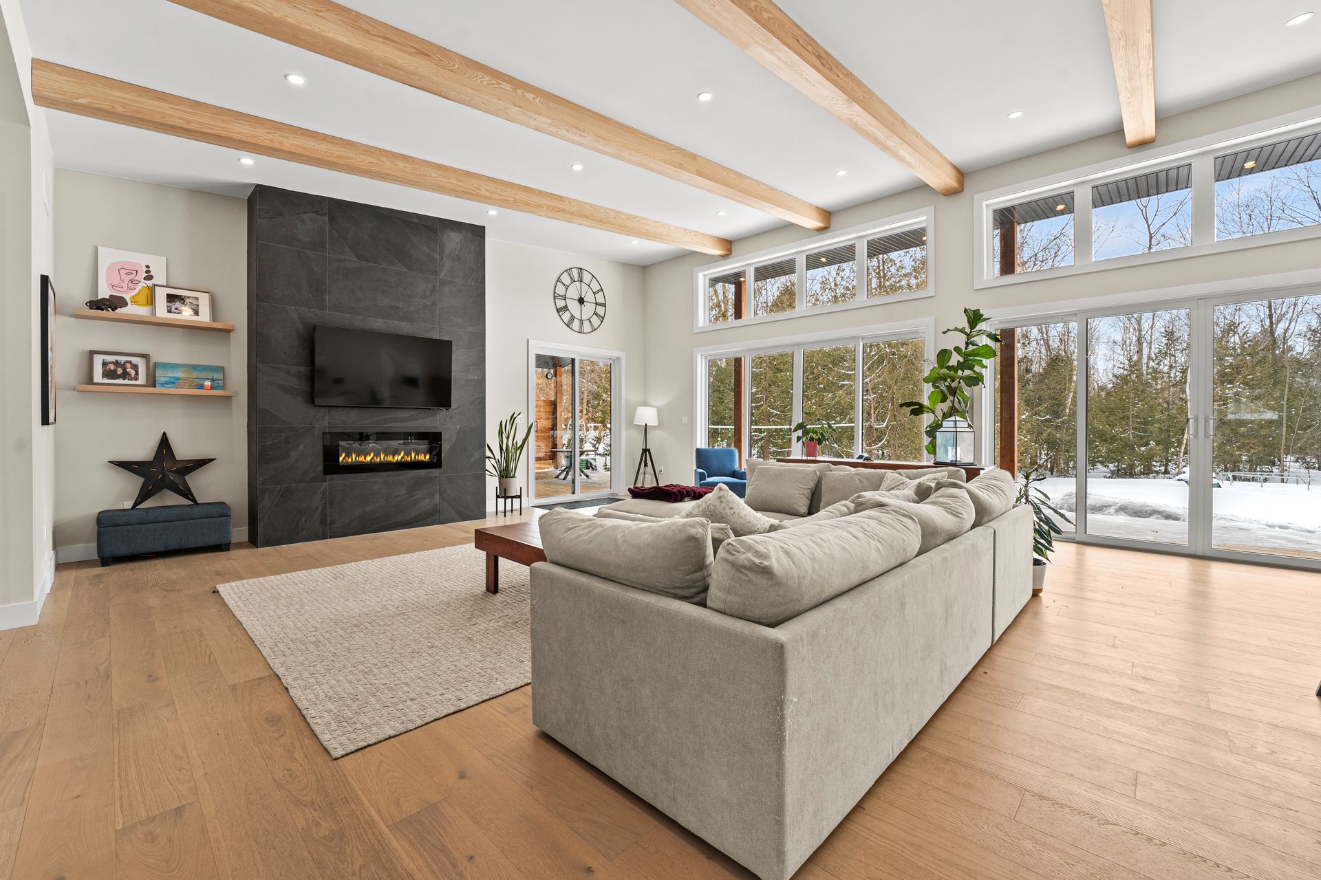 Welcome to this warm and modern custom-built 2024 home, ideally located just steps from the beach in the sought-after community of blairs grove. This one-of-a-kind residence features soaring 14-foot vaulted ceilings with exposed beams in the open-concept living and dining area, complemented by expansive windows and sliding glass doors that flood the space with natural light and offer serene forest views. Ten-foot ceilings extend throughout the three main-floor bedrooms, including a spacious primary suite with a walk-in closet featuring custom shelving and a spa-inspired ensuite with heated floors. The stunning kitchen showcases an 11-foot quartz island, white oak cabinetry, waterfall accents, and sleek modern finishes. Engineered hardwood floors flow throughout the main level, which also includes a five-piece bathroom, modern fireplace, and three sliding doors leading to a 56-foot covered back deck with beautiful 16 foot douglas fir posts. The fully finished lower level offers 3 additional bedrooms and ample storage space with 9 foot ceilings throughout and a 1,200 sq. Ft. Custom-finished rec room, perfect for family time or entertaining. The striking exterior combines brick with lp smart side board-and-batten siding and backs onto 25 acres of nature trails for added privacy. Located just 160 meters from beach access, this exceptional home offers the best of modern design and beachside living. Contact your realtor today and come take a look.