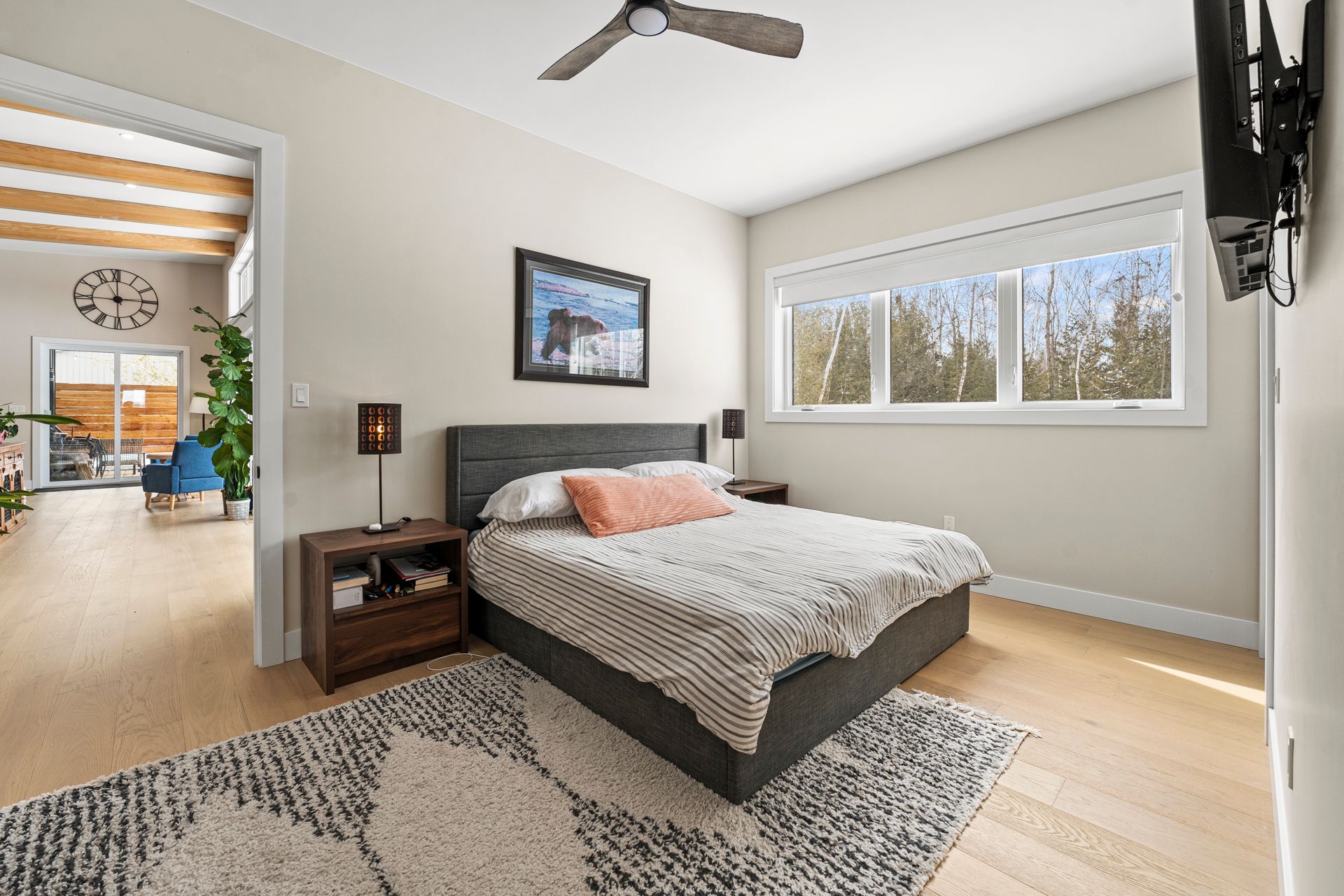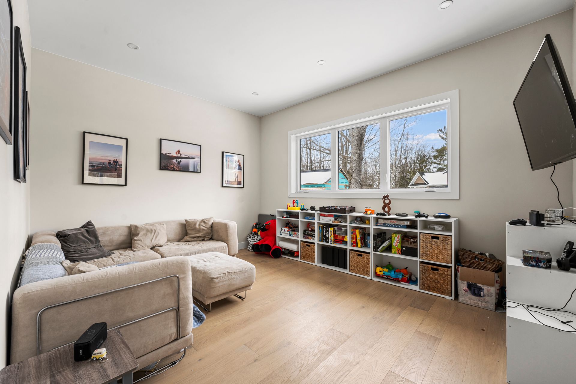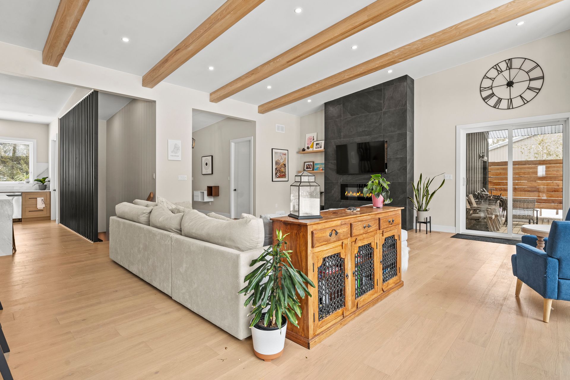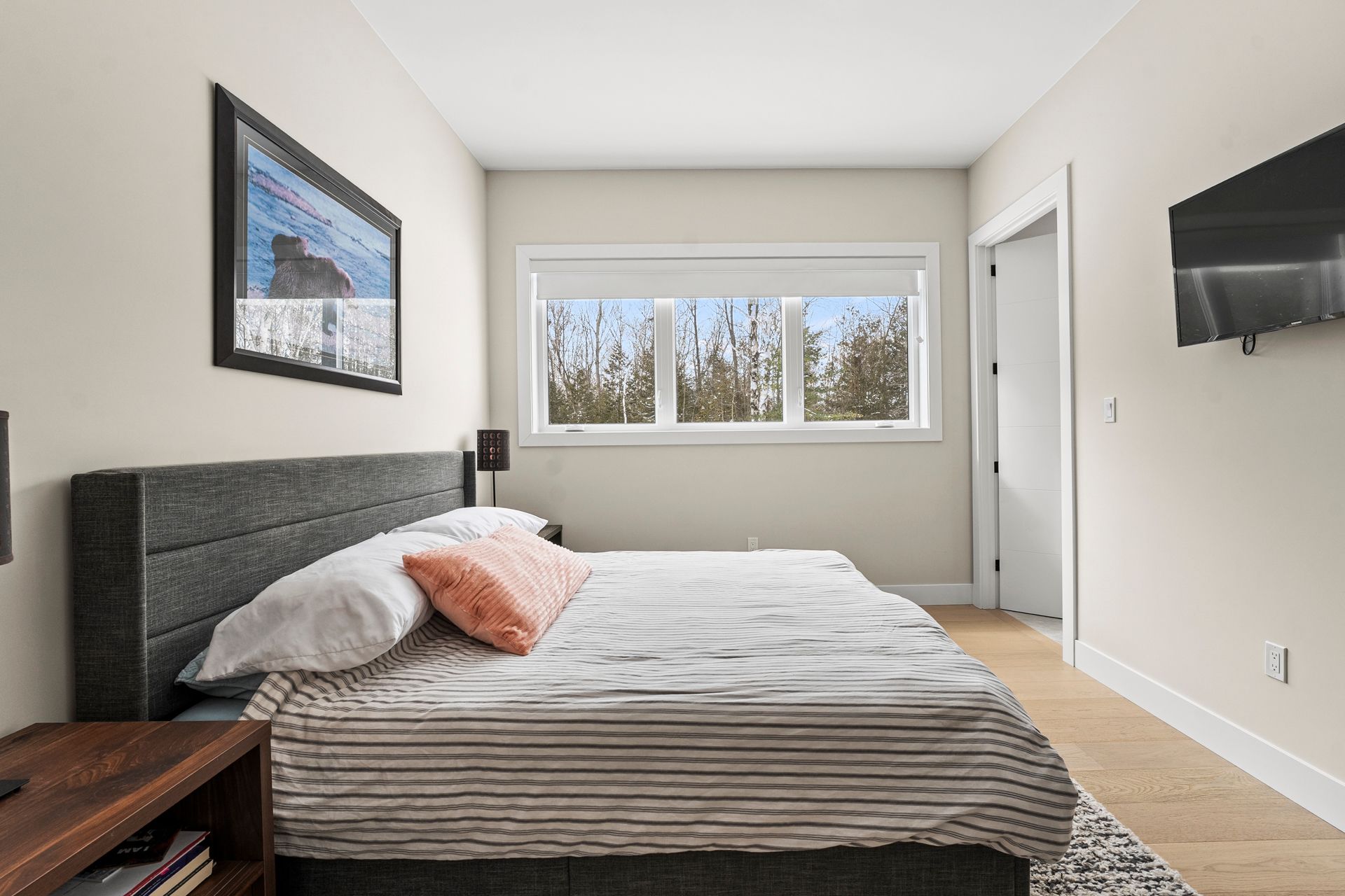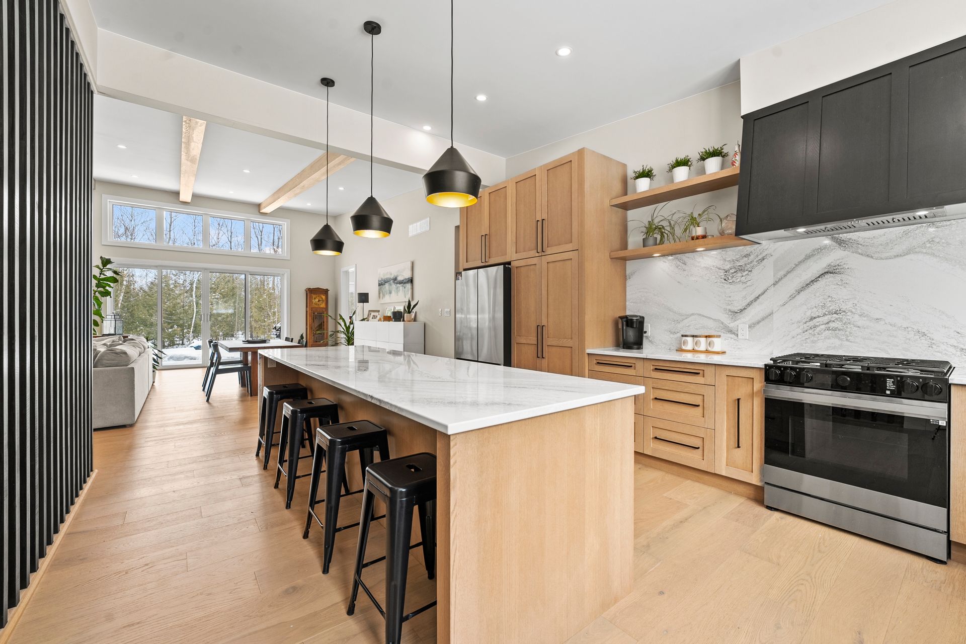 Welcome to this warm and modern custom-built 2024 home, ideally located just steps from the beach in the sought-after community of blairs grove. This one-of-a-kind residence features soaring 14-foot vaulted ceilings with exposed beams in the open-concept living and dining area, complemented by expansive windows and sliding glass doors that flood the space with natural light and offer serene forest views. Ten-foot ceilings extend throughout the three main-floor bedrooms, including a spacious primary suite with a walk-in closet featuring custom shelving and a spa-inspired ensuite with heated floors. The stunning kitchen showcases an 11-foot quartz island, white oak cabinetry, waterfall accents, and sleek modern finishes. Engineered hardwood floors flow throughout the main level, which also includes a five-piece bathroom, modern fireplace, and three sliding doors leading to a 56-foot covered back deck with beautiful 16 foot douglas fir posts. The fully finished lower level offers 3 additional bedrooms and ample storage space with 9 foot ceilings throughout and a 1,200 sq. Ft. Custom-finished rec room, perfect for family time or entertaining. The striking exterior combines brick with lp smart side board-and-batten siding and backs onto 25 acres of nature trails for added privacy. Located just 160 meters from beach access, this exceptional home offers the best of modern design and beachside living. Contact your realtor today and come take a look.