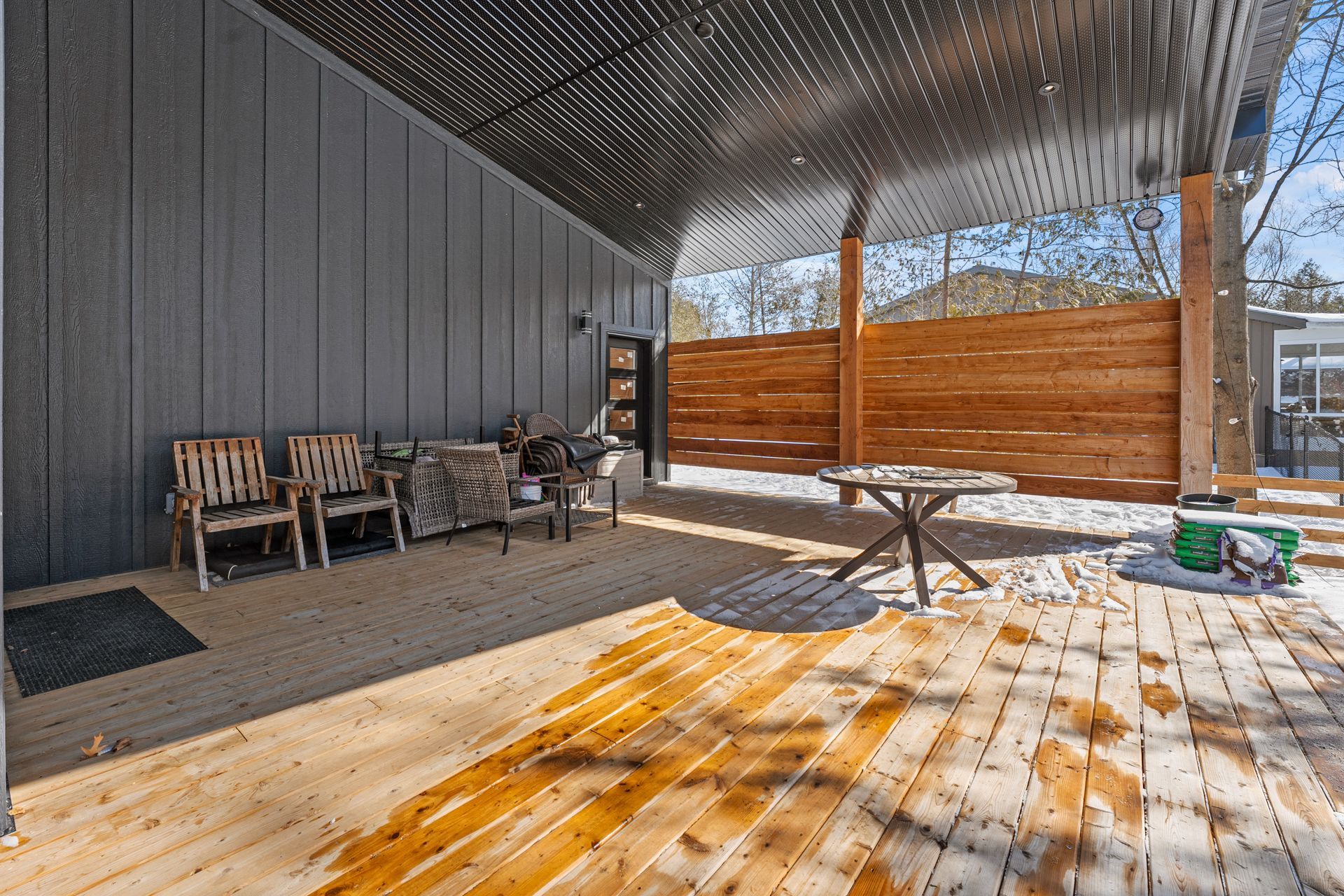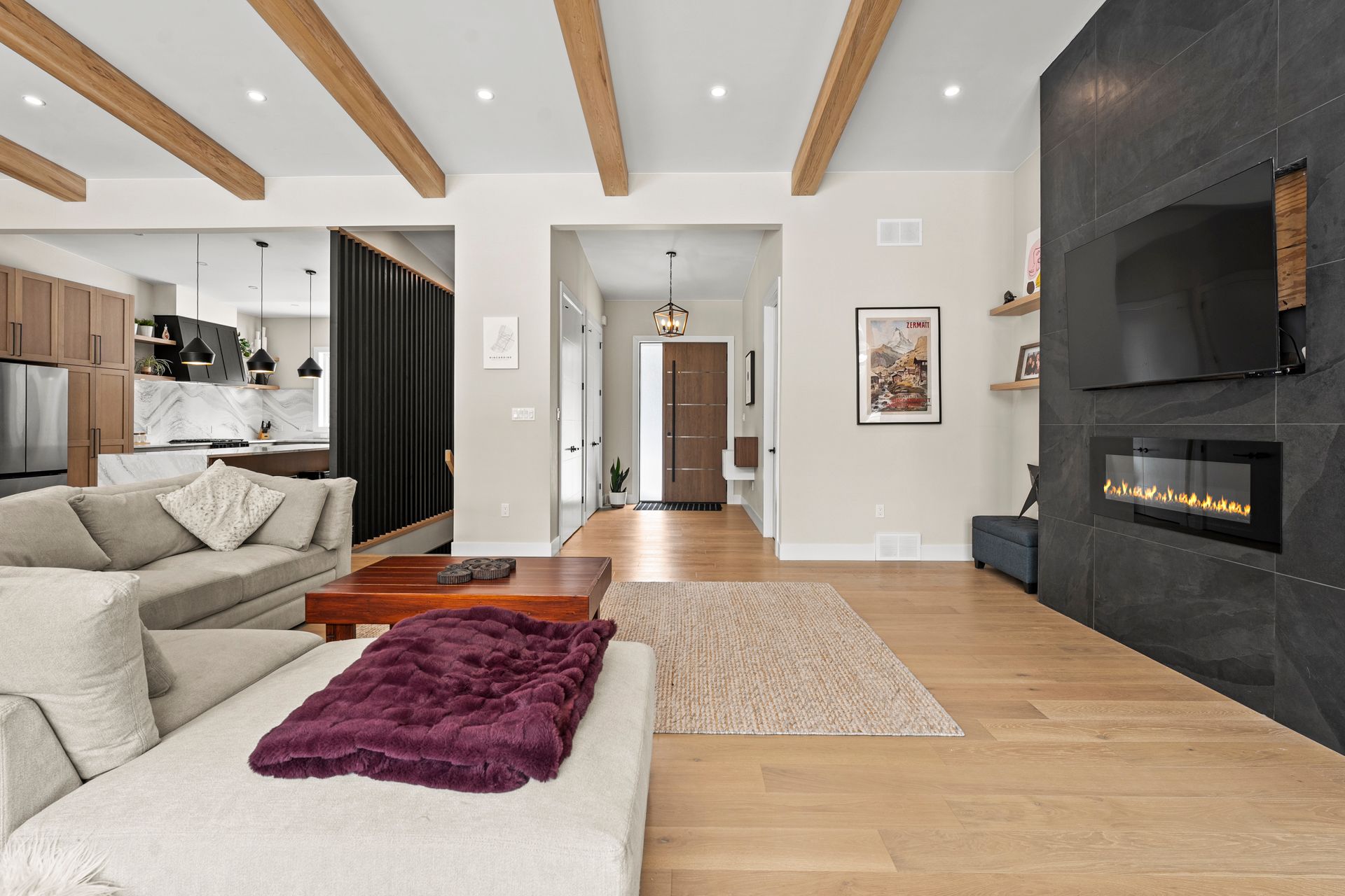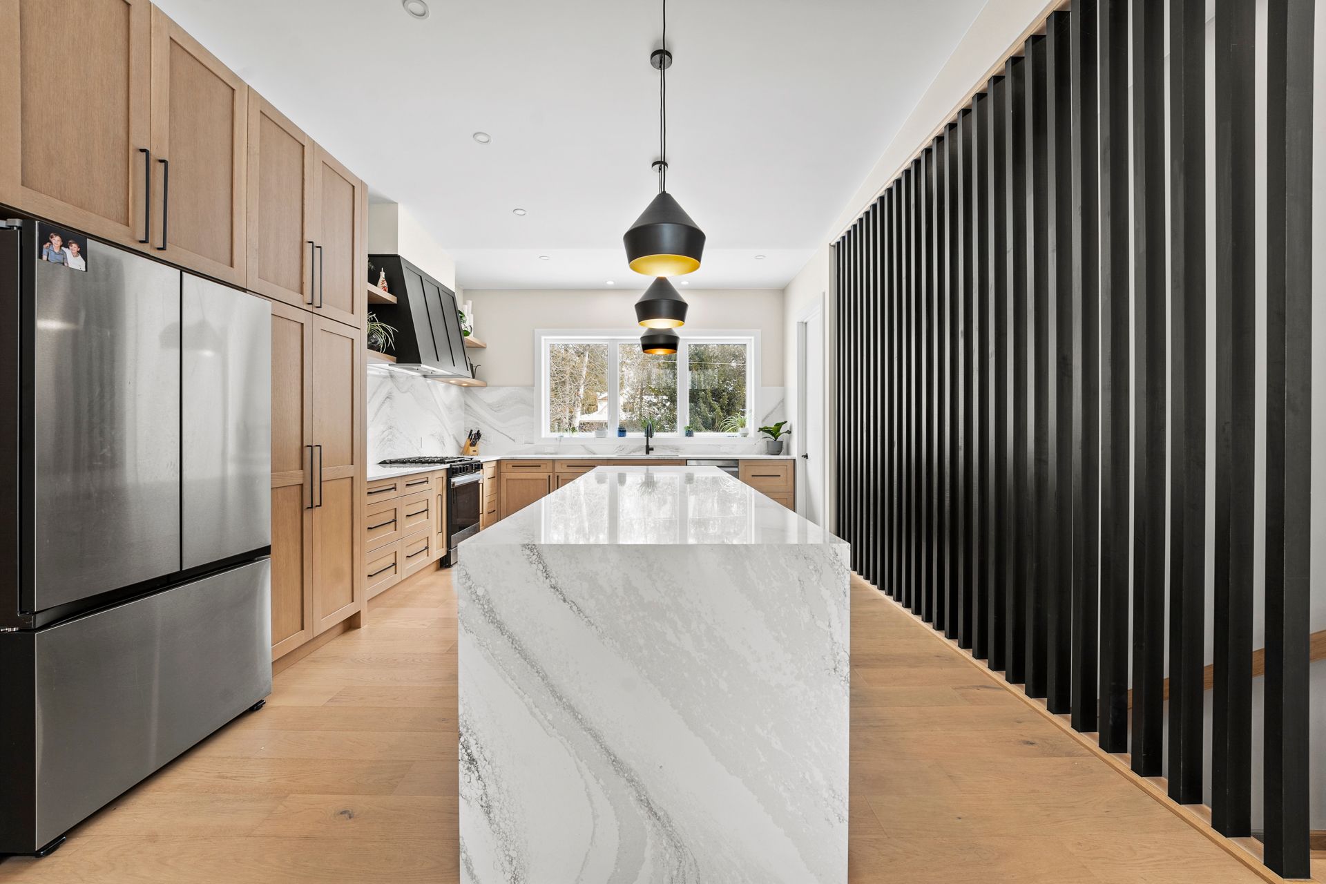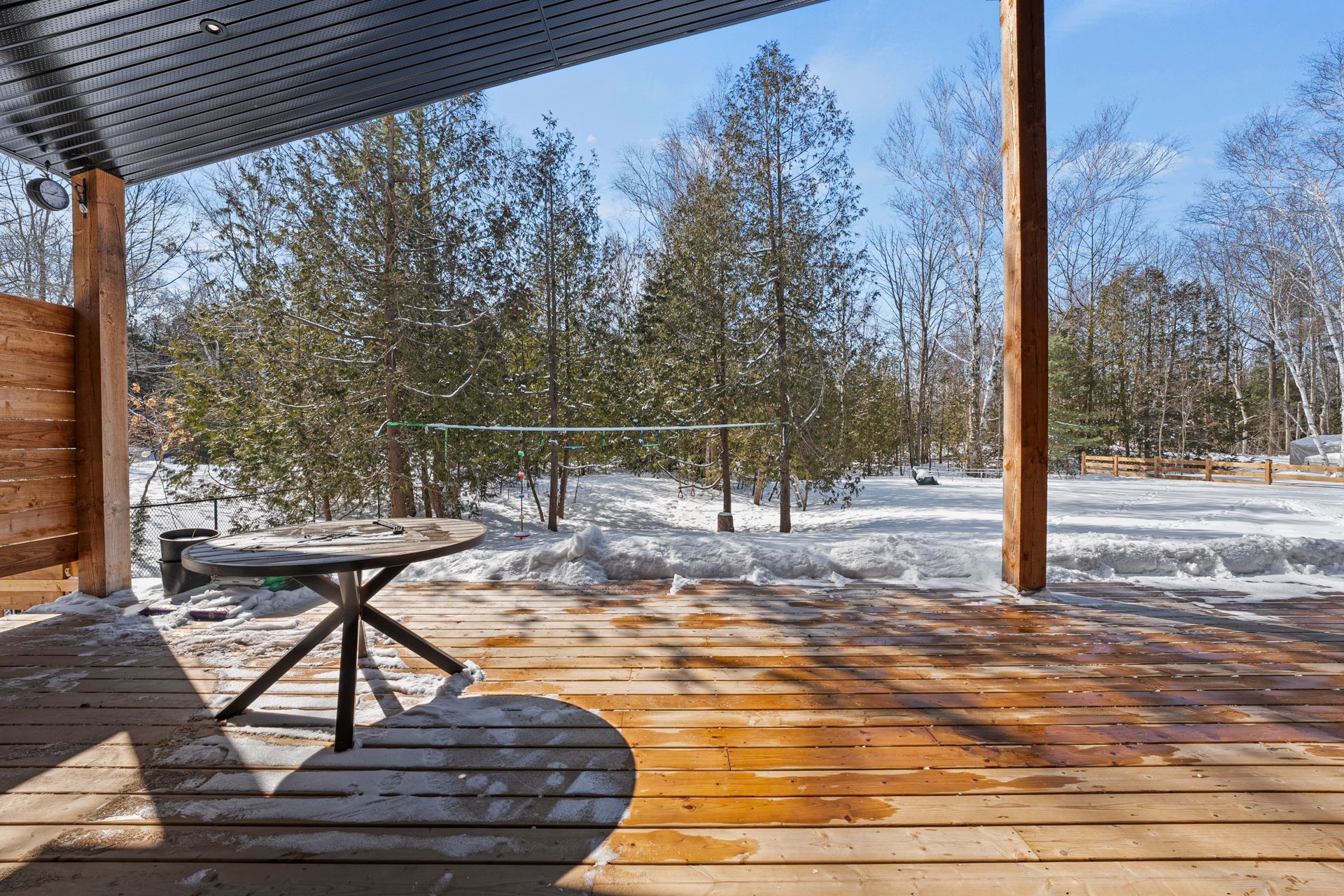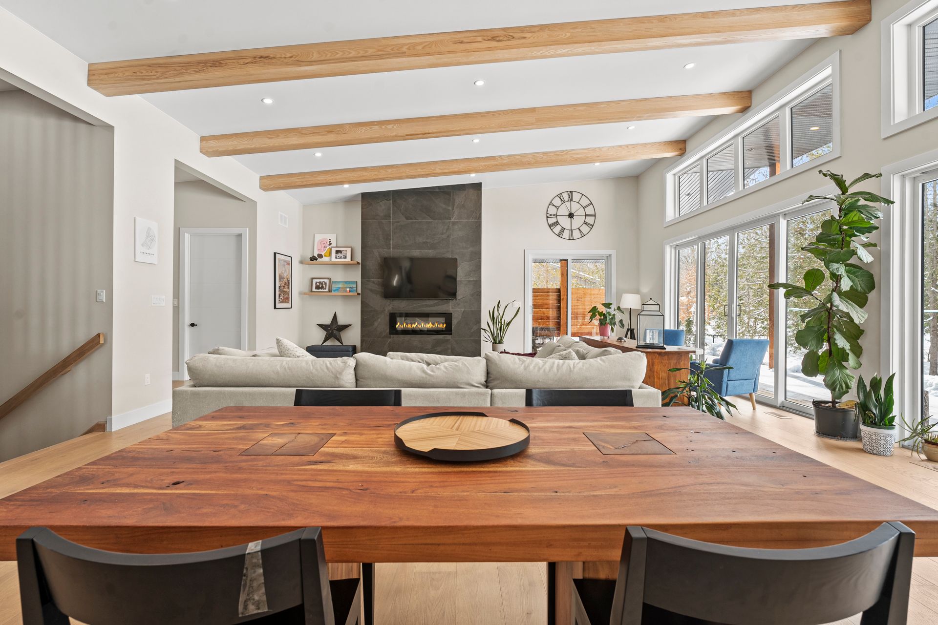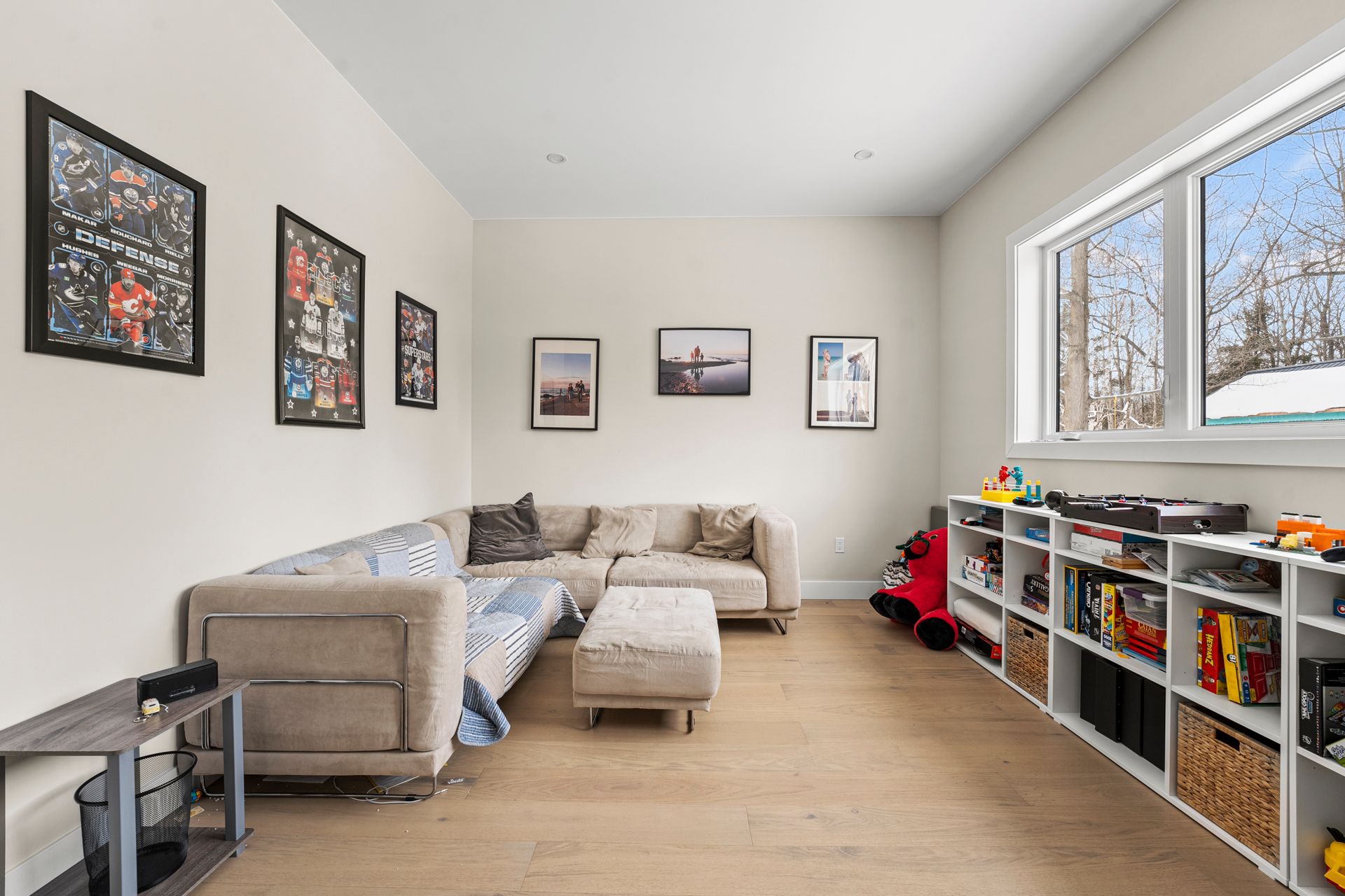 Welcome to this warm and modern custom-built 2024 home, ideally located just steps from the beach in the sought-after community of blairs grove. This one-of-a-kind residence features soaring 14-foot vaulted ceilings with exposed beams in the open-concept living and dining area, complemented by expansive windows and sliding glass doors that flood the space with natural light and offer serene forest views. Ten-foot ceilings extend throughout the three main-floor bedrooms, including a spacious primary suite with a walk-in closet featuring custom shelving and a spa-inspired ensuite with heated floors. The stunning kitchen showcases an 11-foot quartz island, white oak cabinetry, waterfall accents, and sleek modern finishes. Engineered hardwood floors flow throughout the main level, which also includes a five-piece bathroom, modern fireplace, and three sliding doors leading to a 56-foot covered back deck with beautiful 16 foot douglas fir posts. The fully finished lower level offers 3 additional bedrooms and ample storage space with 9 foot ceilings throughout and a 1,200 sq. Ft. Custom-finished rec room, perfect for family time or entertaining. The striking exterior combines brick with lp smart side board-and-batten siding and backs onto 25 acres of nature trails for added privacy. Located just 160 meters from beach access, this exceptional home offers the best of modern design and beachside living. Contact your realtor today and come take a look.