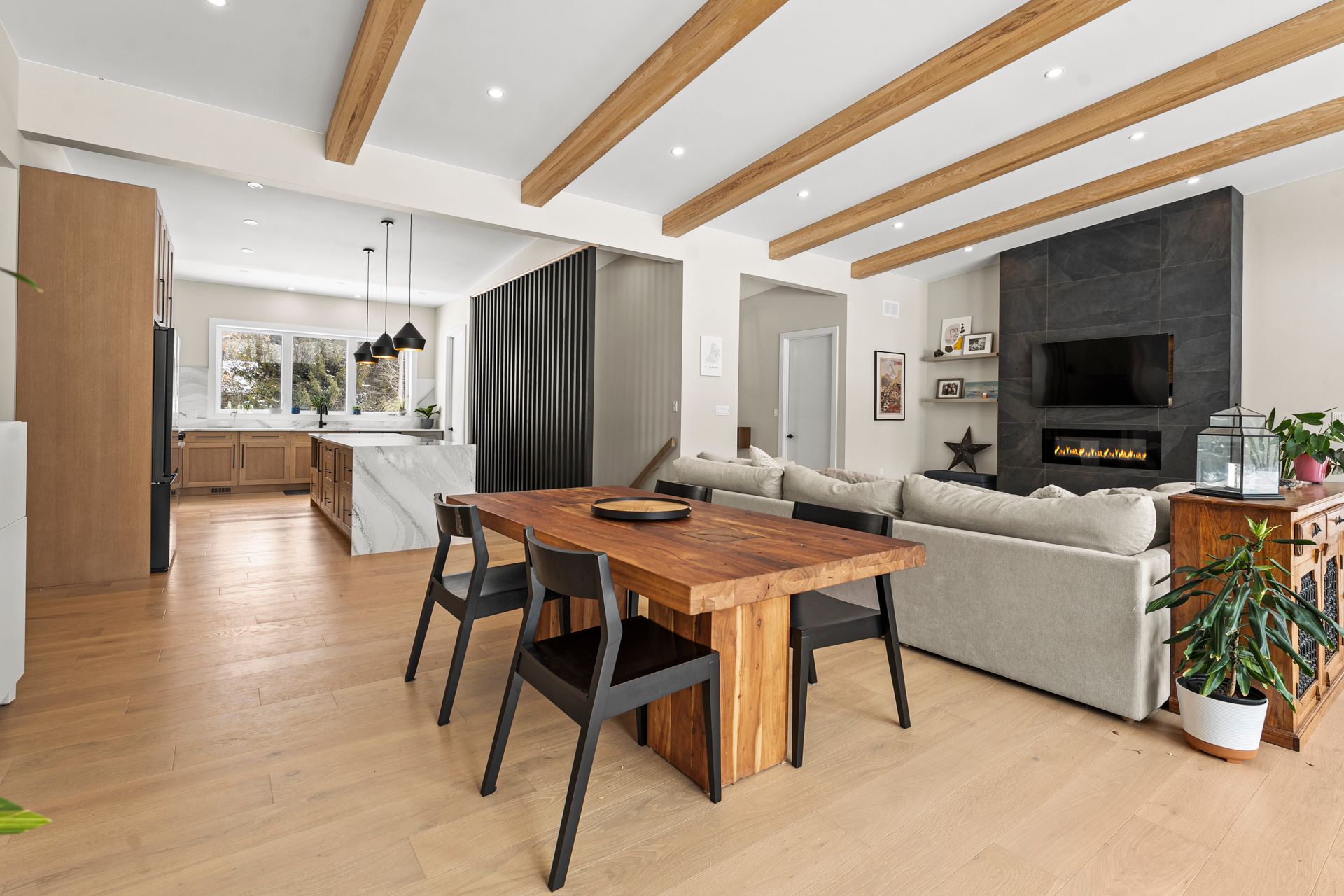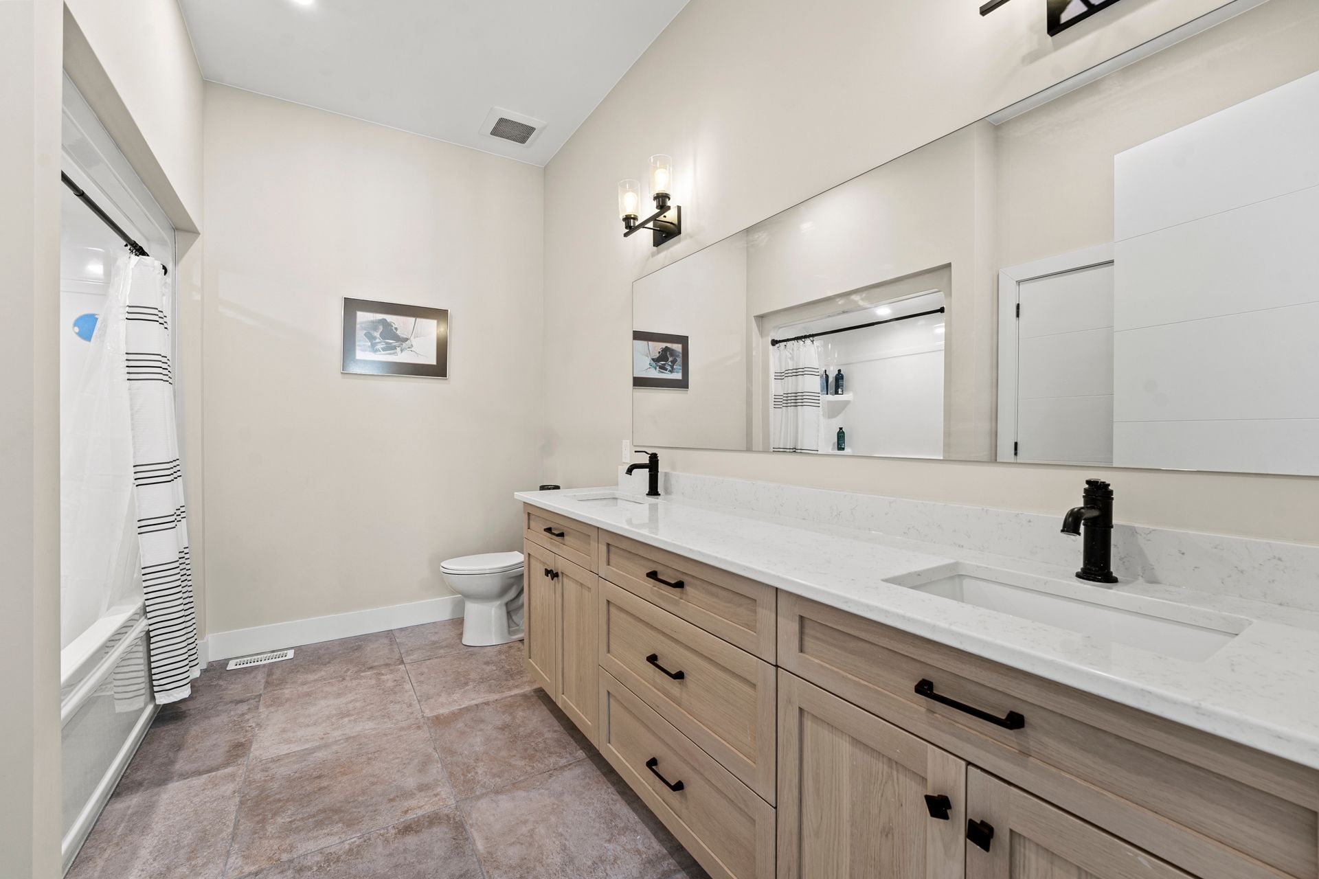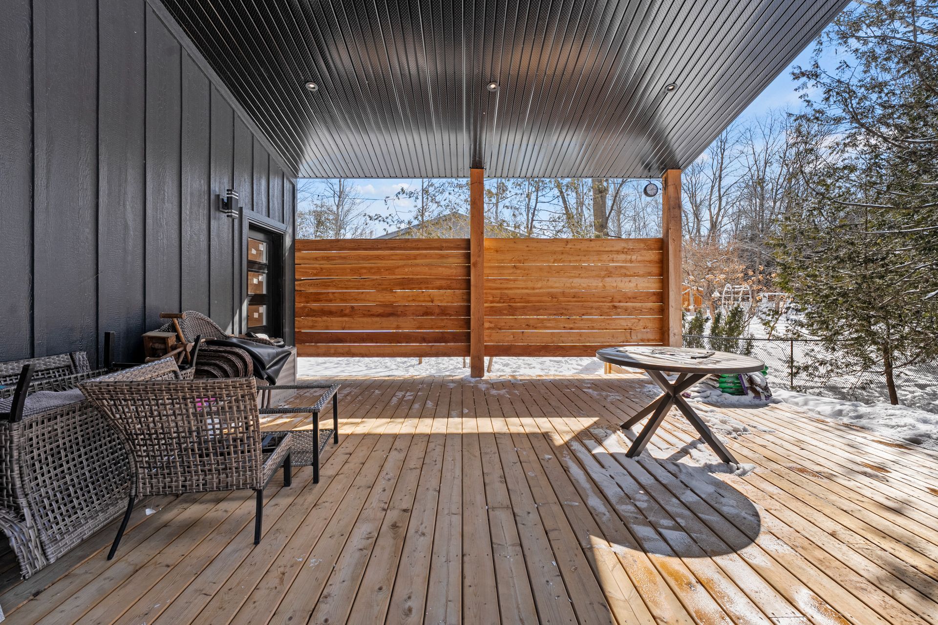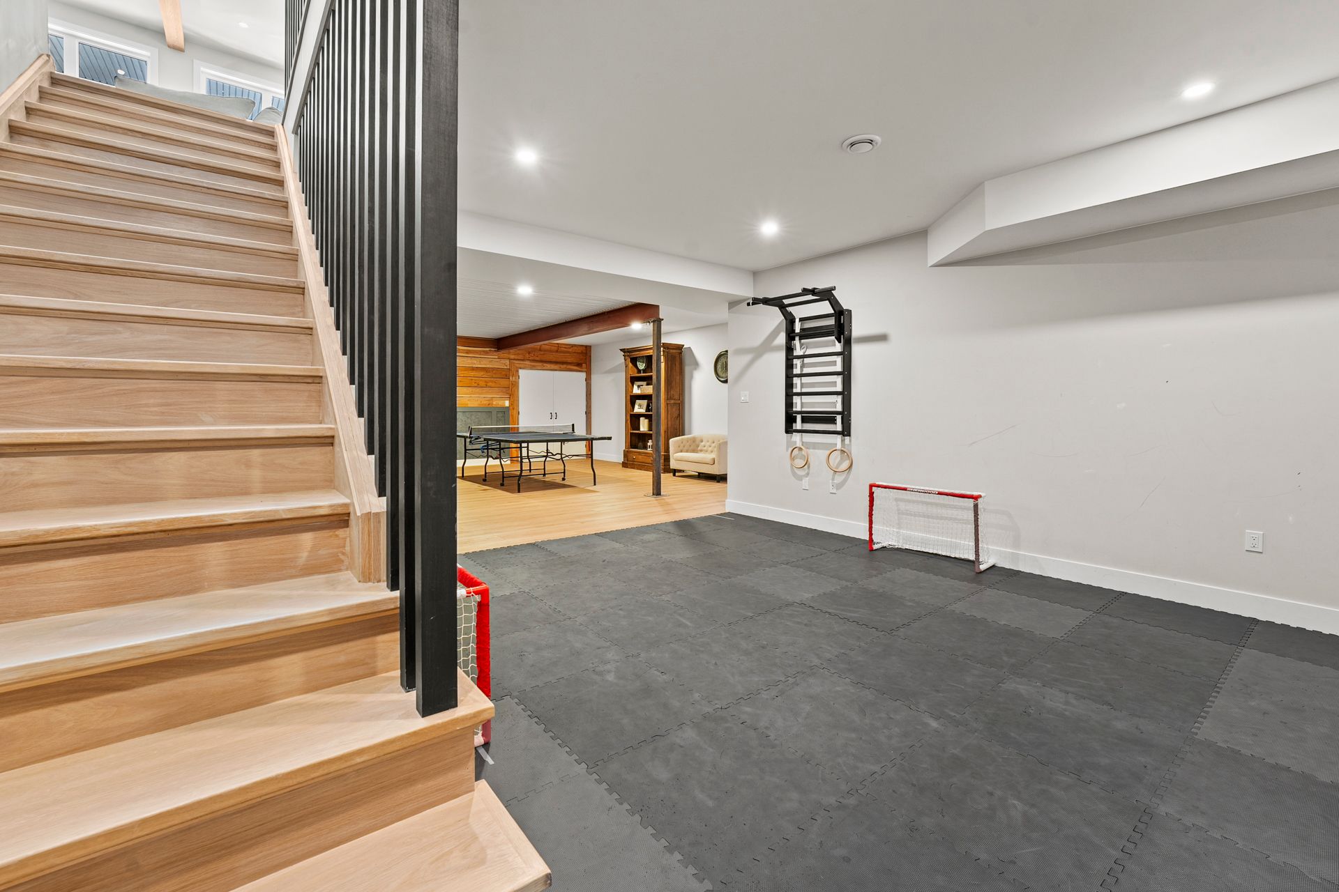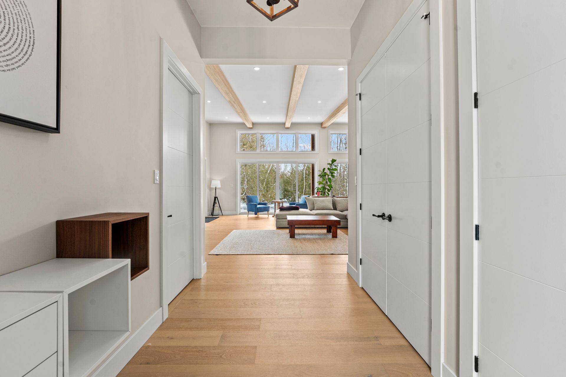 Welcome to this warm and modern custom-built 2024 home, ideally located just steps from the beach in the sought-after community of blairs grove. This one-of-a-kind residence features soaring 14-foot vaulted ceilings with exposed beams in the open-concept living and dining area, complemented by expansive windows and sliding glass doors that flood the space with natural light and offer serene forest views. Ten-foot ceilings extend throughout the three main-floor bedrooms, including a spacious primary suite with a walk-in closet featuring custom shelving and a spa-inspired ensuite with heated floors. The stunning kitchen showcases an 11-foot quartz island, white oak cabinetry, waterfall accents, and sleek modern finishes. Engineered hardwood floors flow throughout the main level, which also includes a five-piece bathroom, modern fireplace, and three sliding doors leading to a 56-foot covered back deck with beautiful 16 foot douglas fir posts. The fully finished lower level offers 3 additional bedrooms and ample storage space with 9 foot ceilings throughout and a 1,200 sq. Ft. Custom-finished rec room, perfect for family time or entertaining. The striking exterior combines brick with lp smart side board-and-batten siding and backs onto 25 acres of nature trails for added privacy. Located just 160 meters from beach access, this exceptional home offers the best of modern design and beachside living. Contact your realtor today and come take a look.
