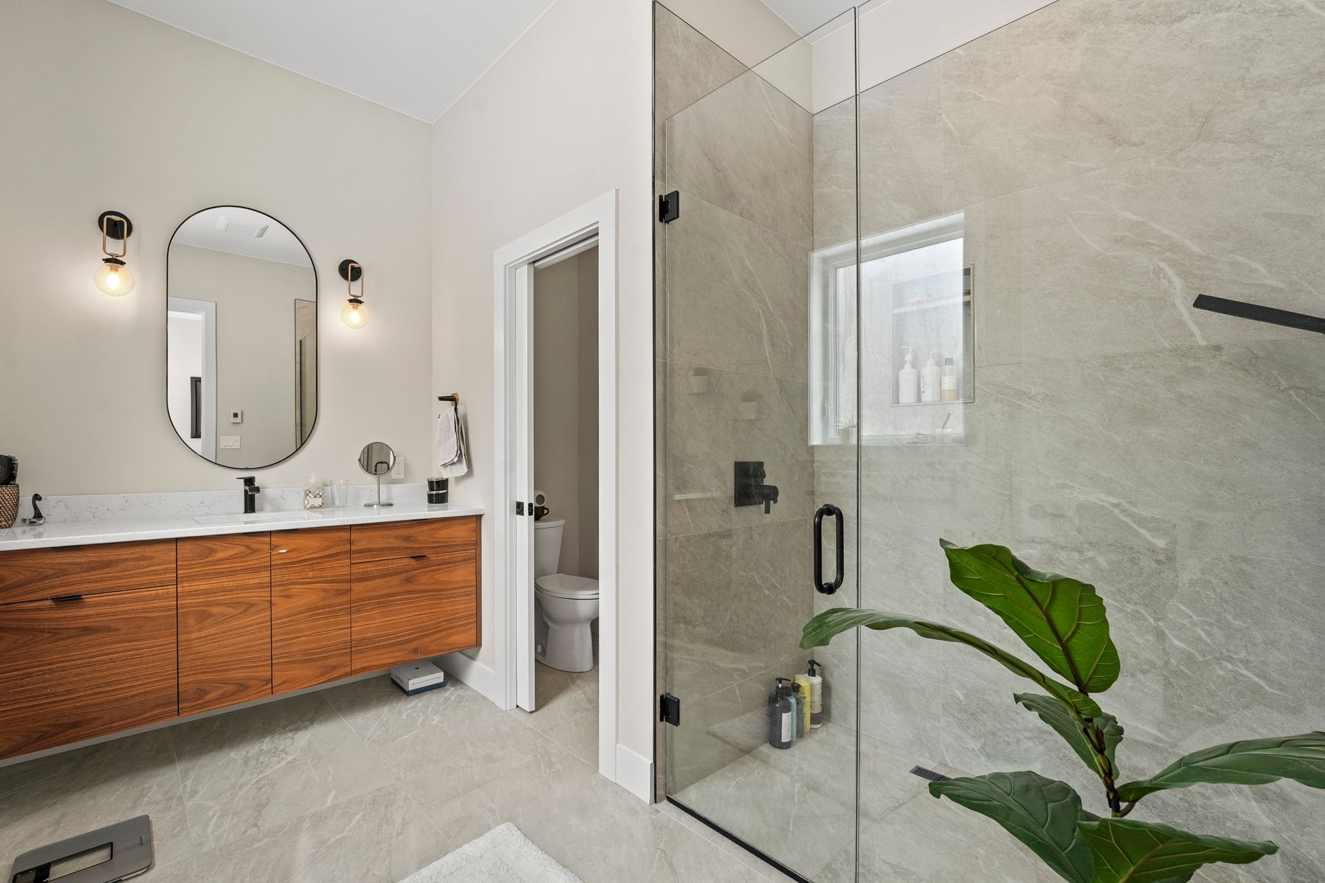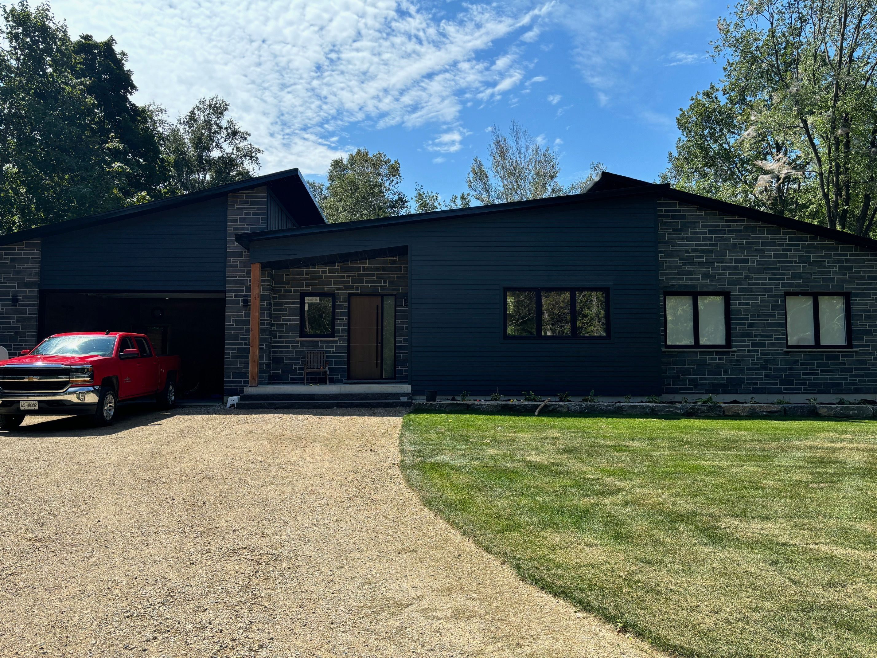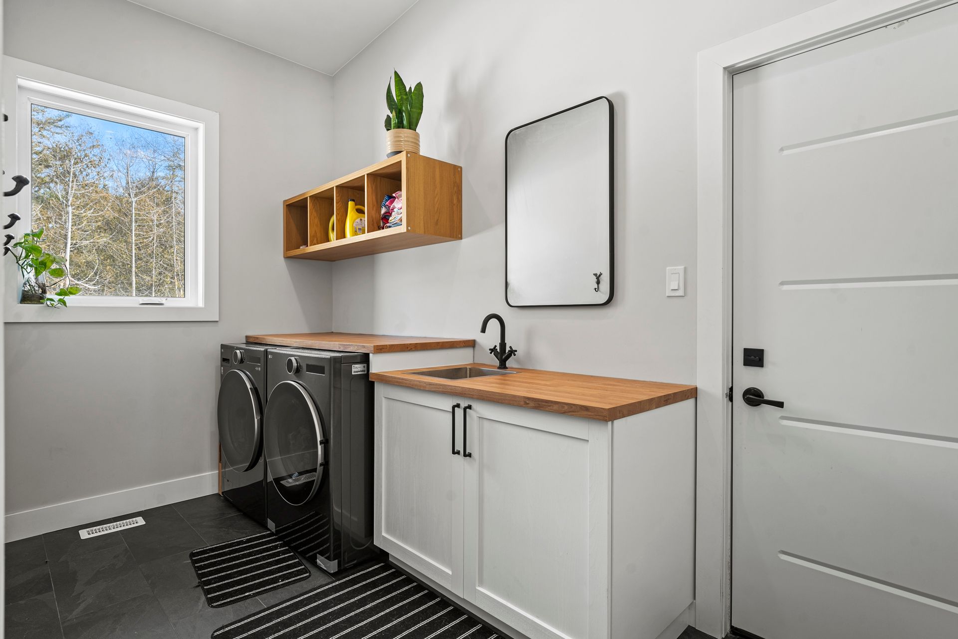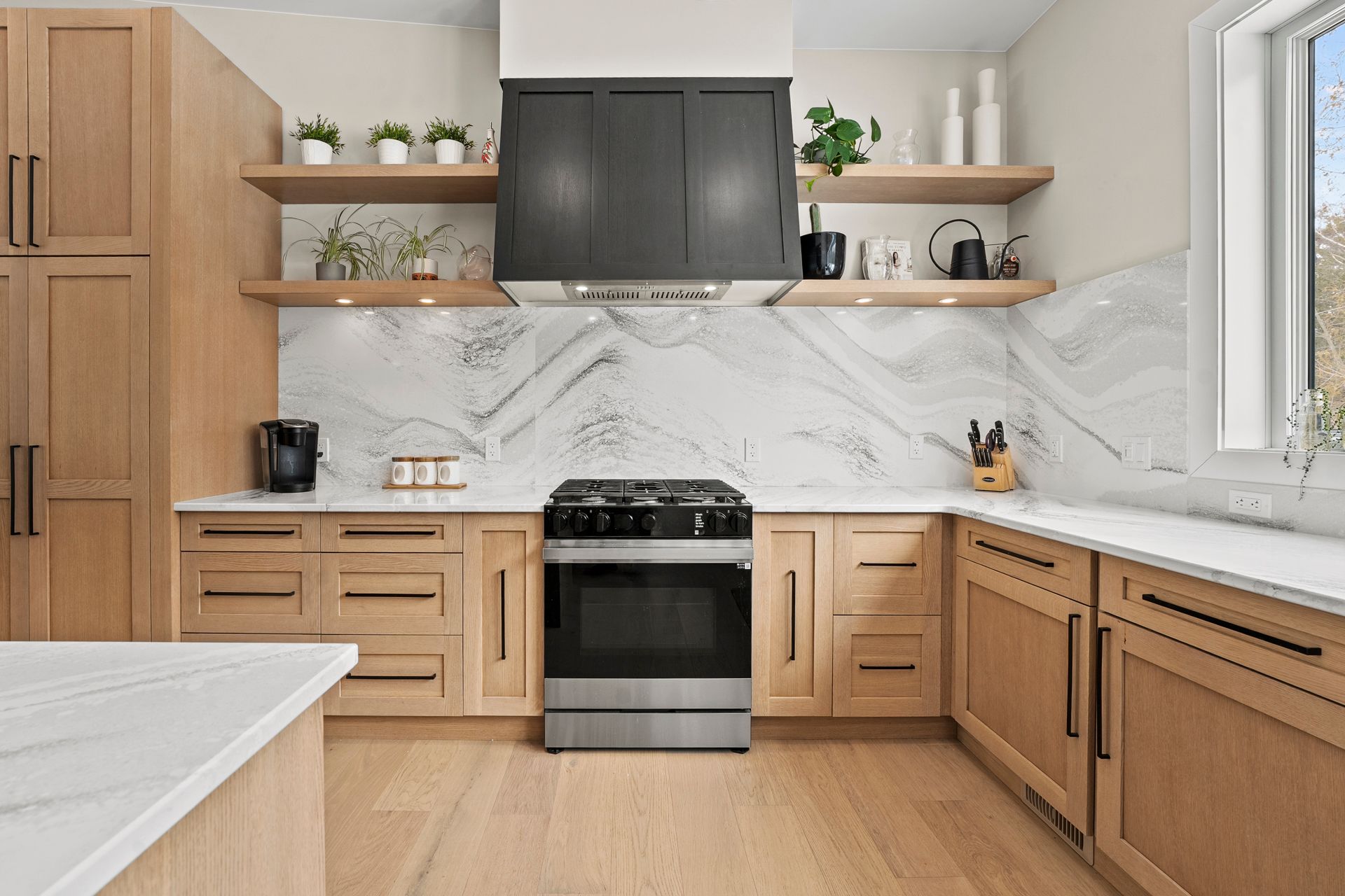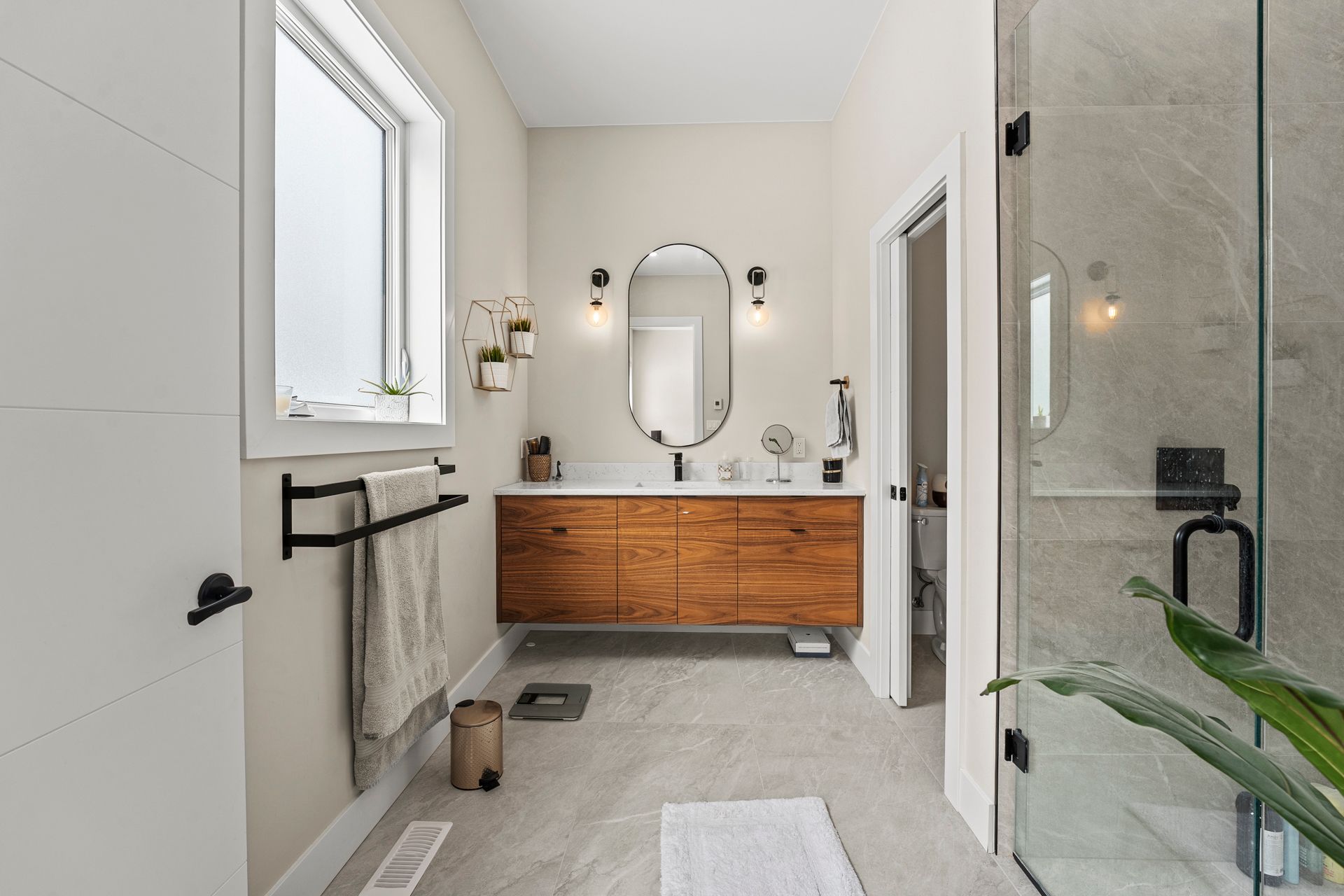 Welcome to this warm and modern custom-built 2024 home, ideally located just steps from the beach in the sought-after community of blairs grove. This one-of-a-kind residence features soaring 14-foot vaulted ceilings with exposed beams in the open-concept living and dining area, complemented by expansive windows and sliding glass doors that flood the space with natural light and offer serene forest views. Ten-foot ceilings extend throughout the three main-floor bedrooms, including a spacious primary suite with a walk-in closet featuring custom shelving and a spa-inspired ensuite with heated floors. The stunning kitchen showcases an 11-foot quartz island, white oak cabinetry, waterfall accents, and sleek modern finishes. Engineered hardwood floors flow throughout the main level, which also includes a five-piece bathroom, modern fireplace, and three sliding doors leading to a 56-foot covered back deck with beautiful 16 foot douglas fir posts. The fully finished lower level offers 3 additional bedrooms and ample storage space with 9 foot ceilings throughout and a 1,200 sq. Ft. Custom-finished rec room, perfect for family time or entertaining. The striking exterior combines brick with lp smart side board-and-batten siding and backs onto 25 acres of nature trails for added privacy. Located just 160 meters from beach access, this exceptional home offers the best of modern design and beachside living. Contact your realtor today and come take a look.