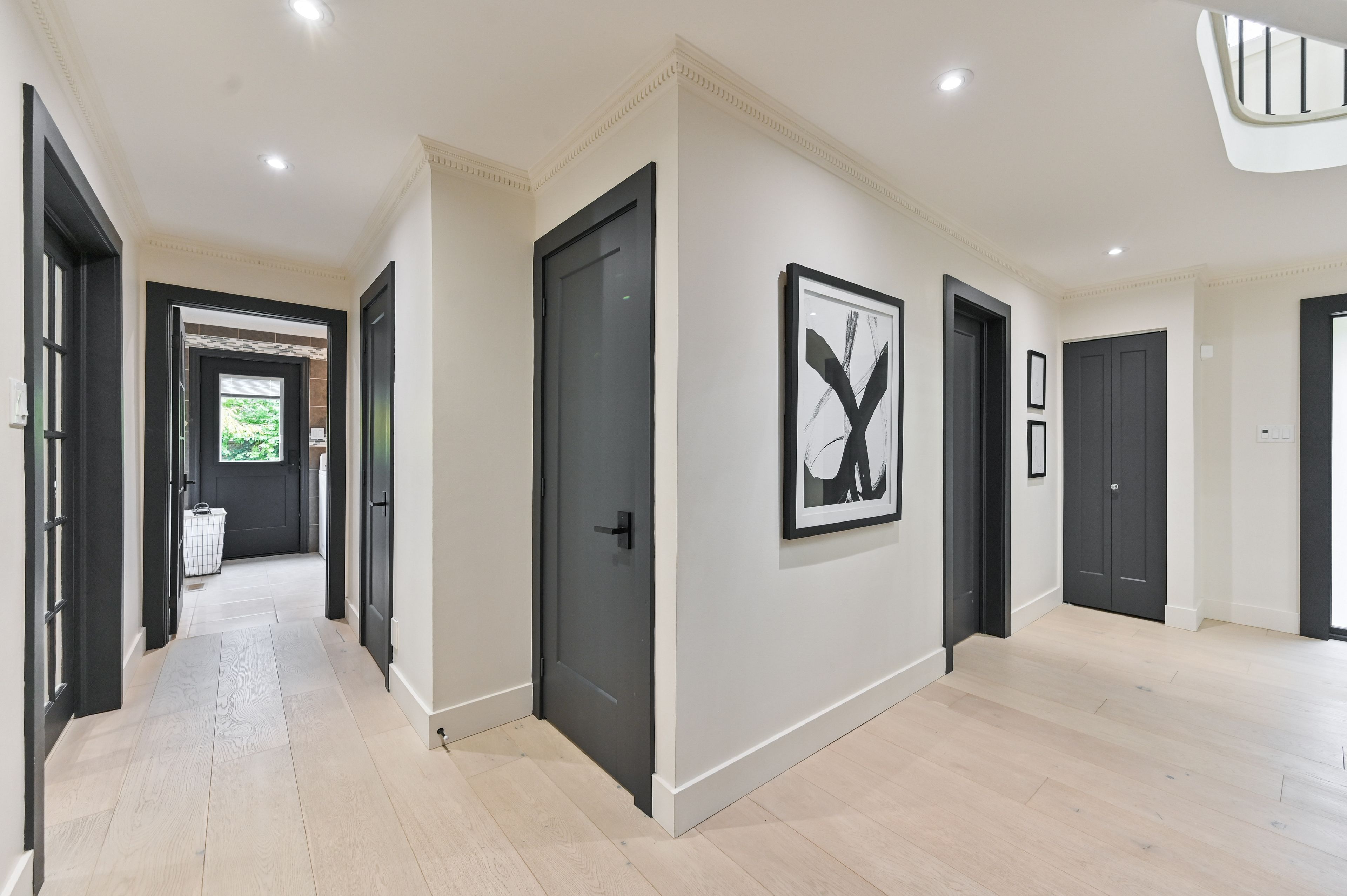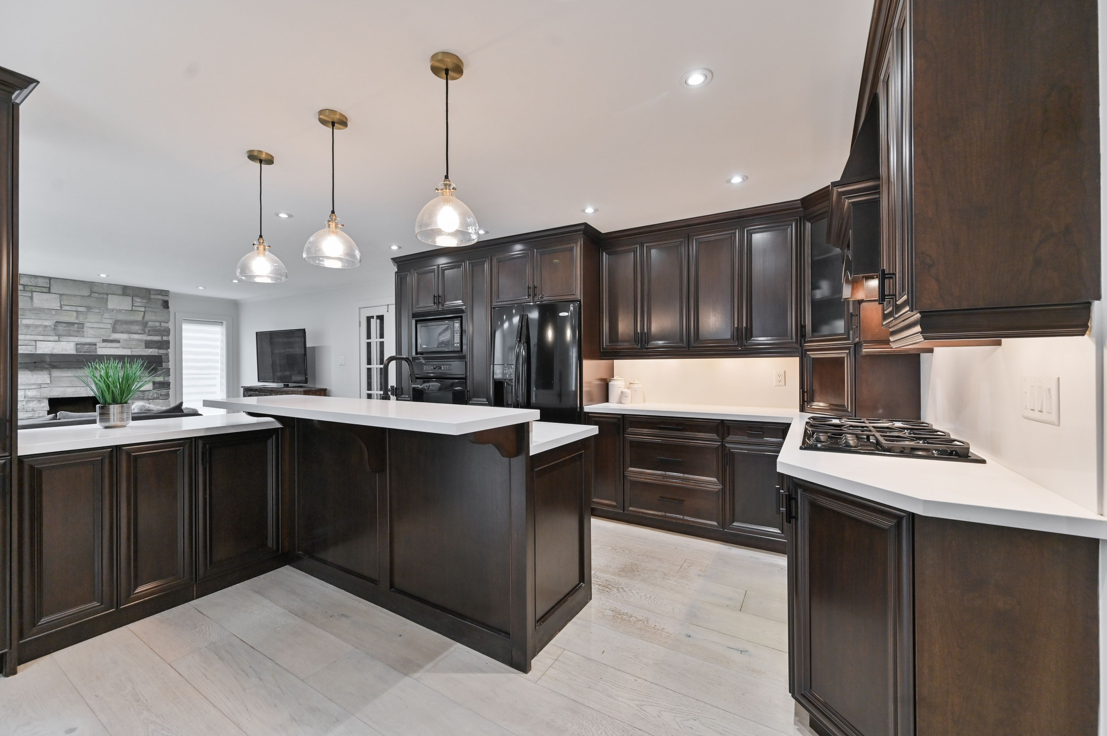 • Open kitchen with oversized breakfast island and modern appliances.