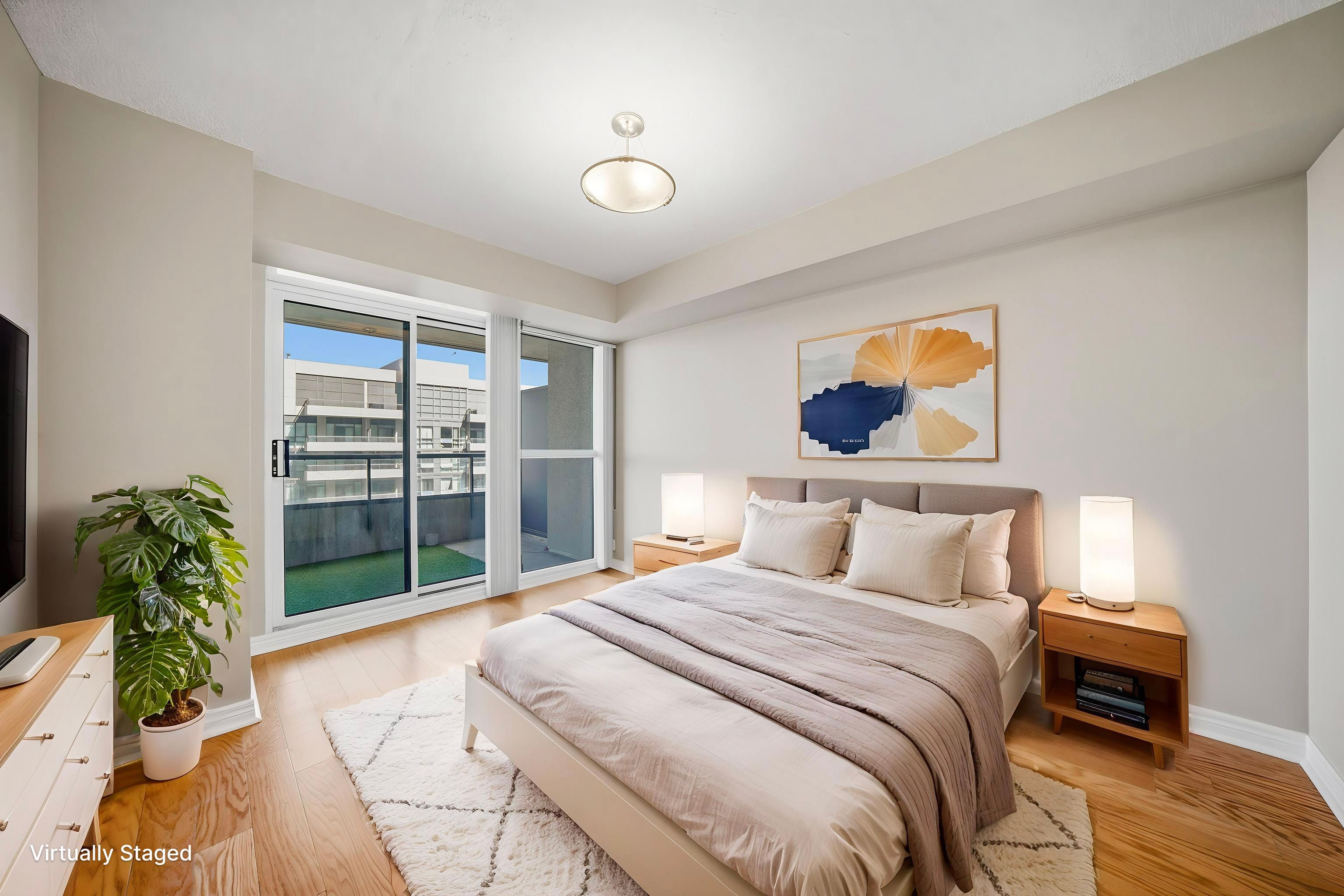 • Primary bedroom has a walk-in closet and balcony access for natural light.