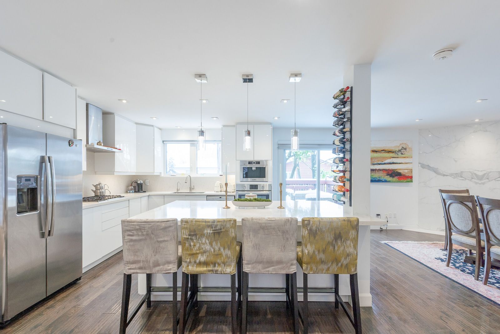 • Custom kitchen with high-end appliances and spacious Caesarstone island.
