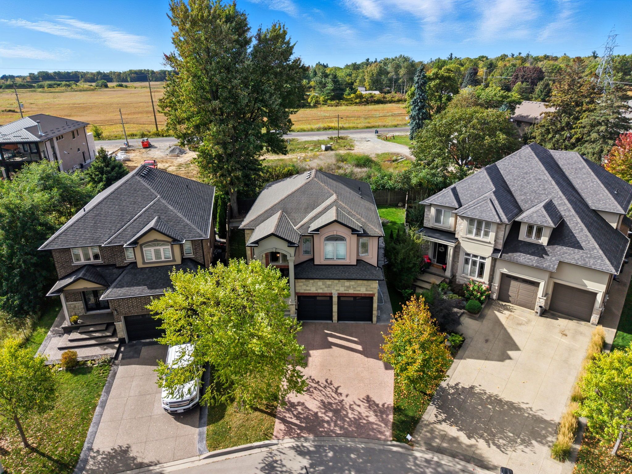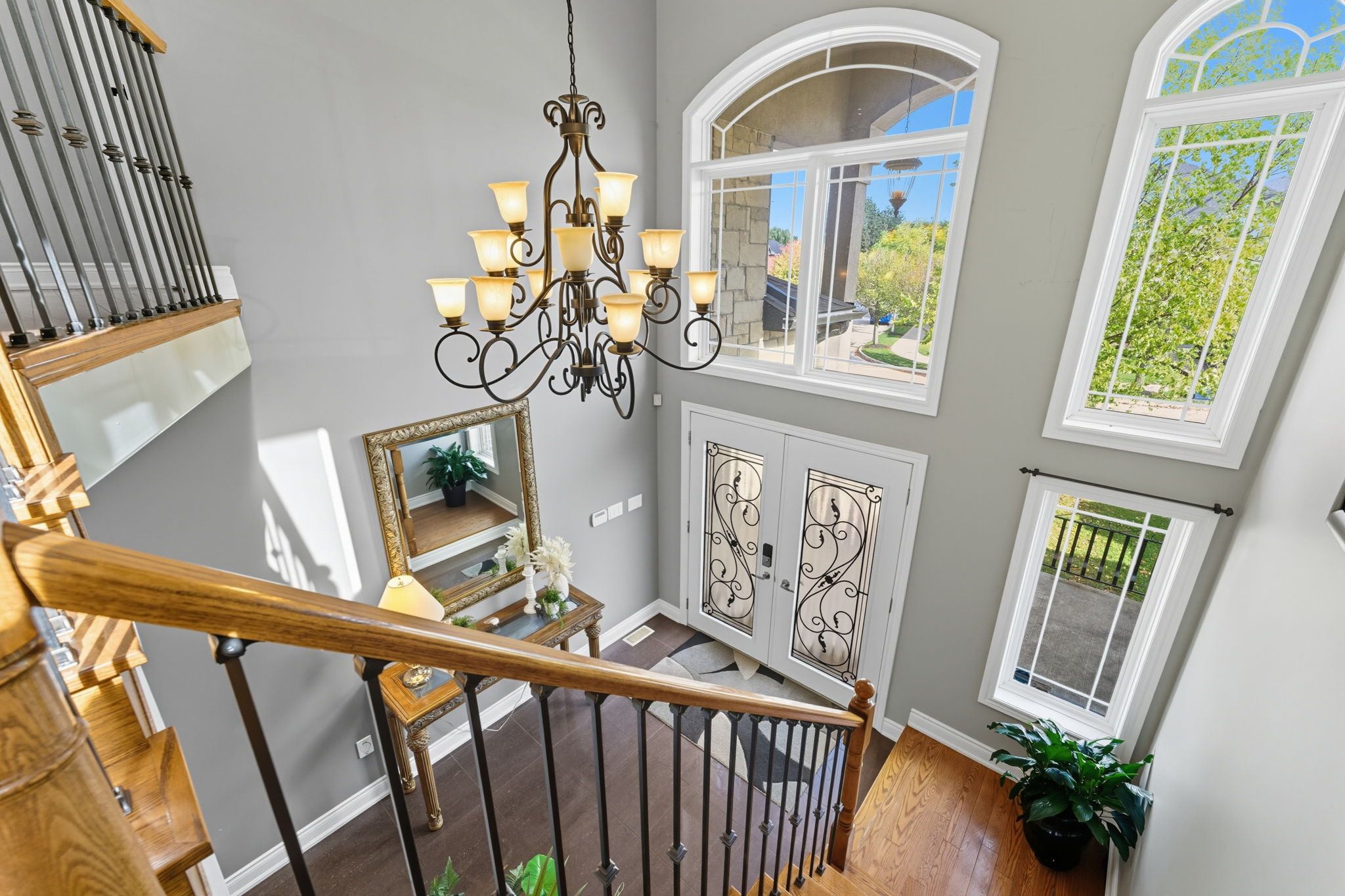 • Double garage and spacious entry with oak stairs and iron railing.