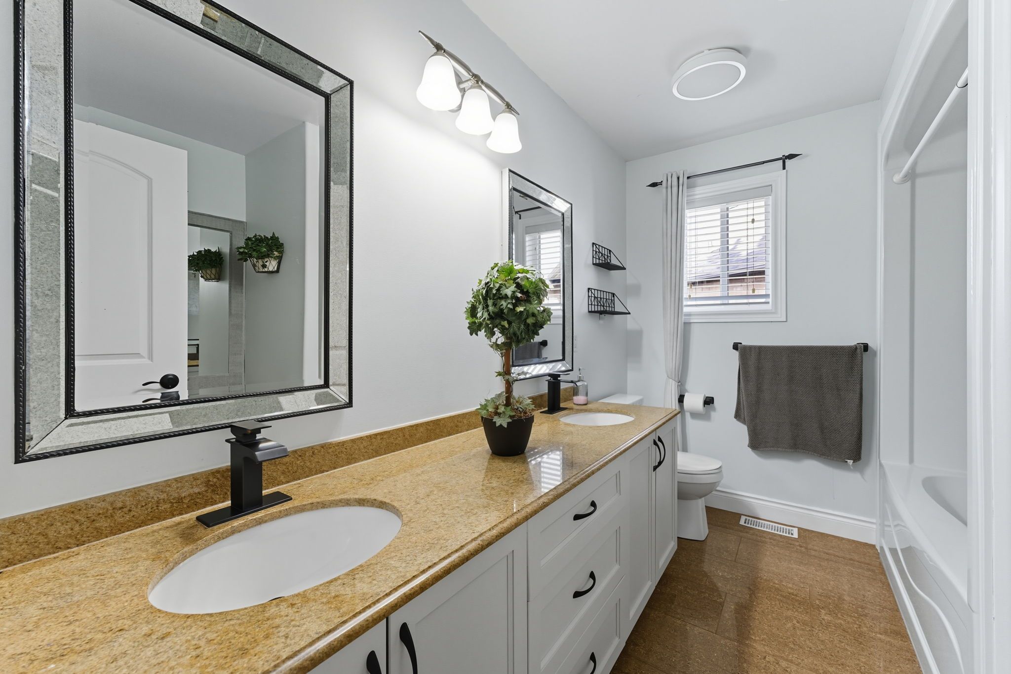 • Open concept main level with a large eat-in kitchen and granite countertops.