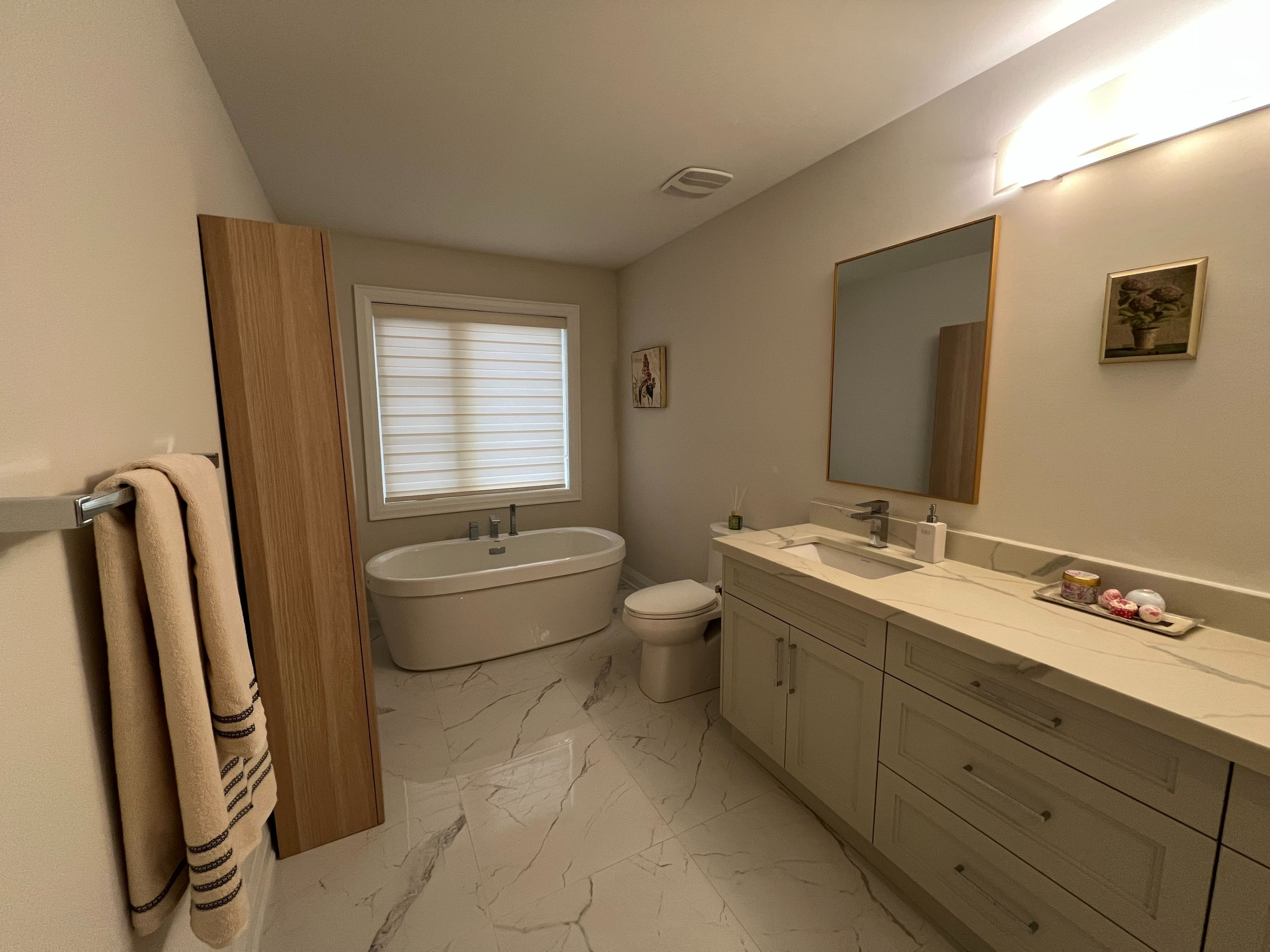 • Luxurious master bath with freestanding tub and double sink.
