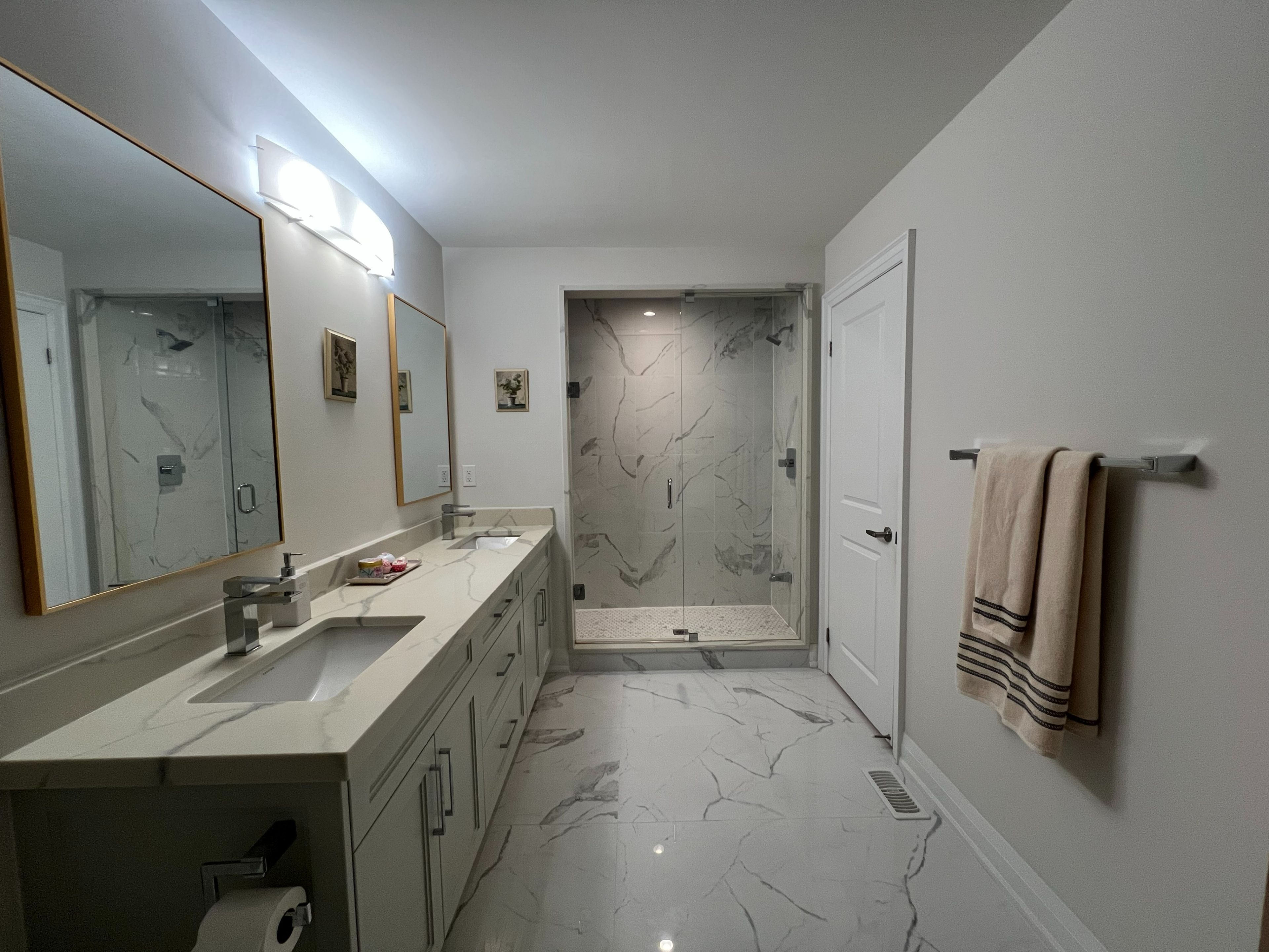 • Custom chef's kitchen with huge island and quartz counters.