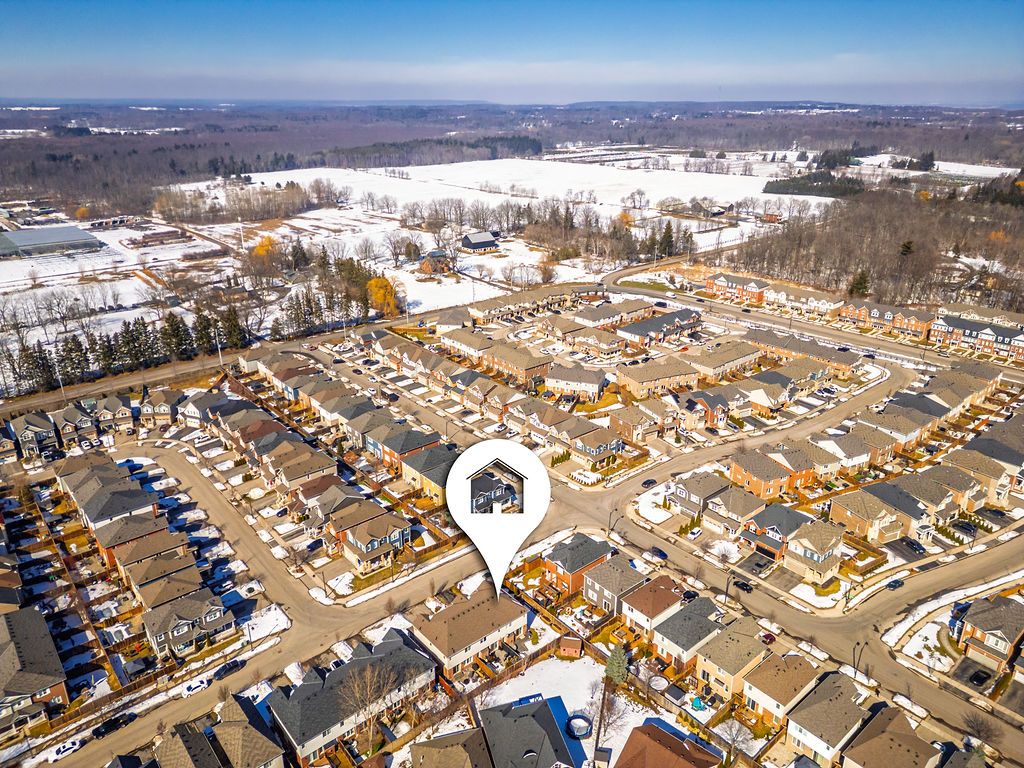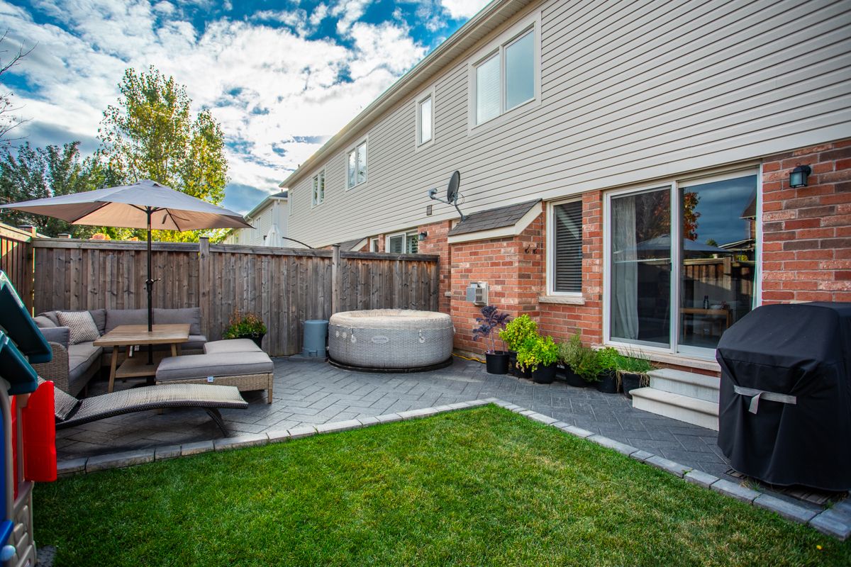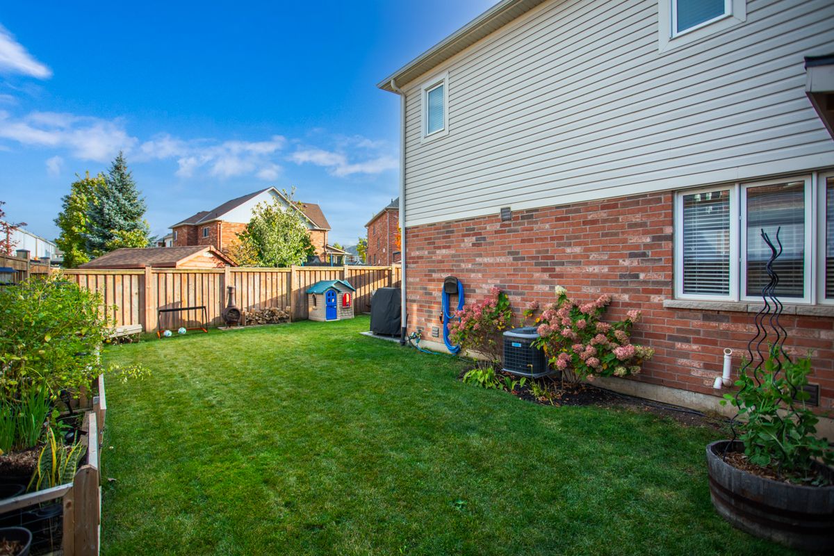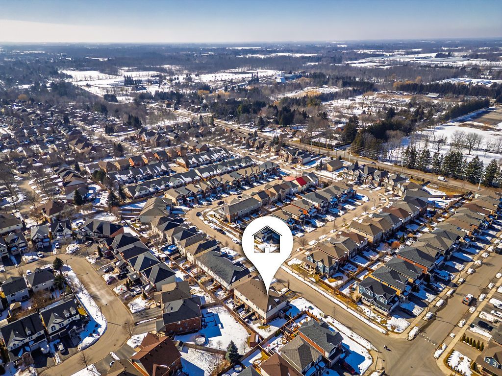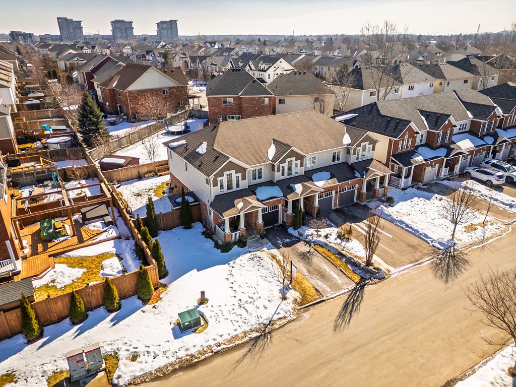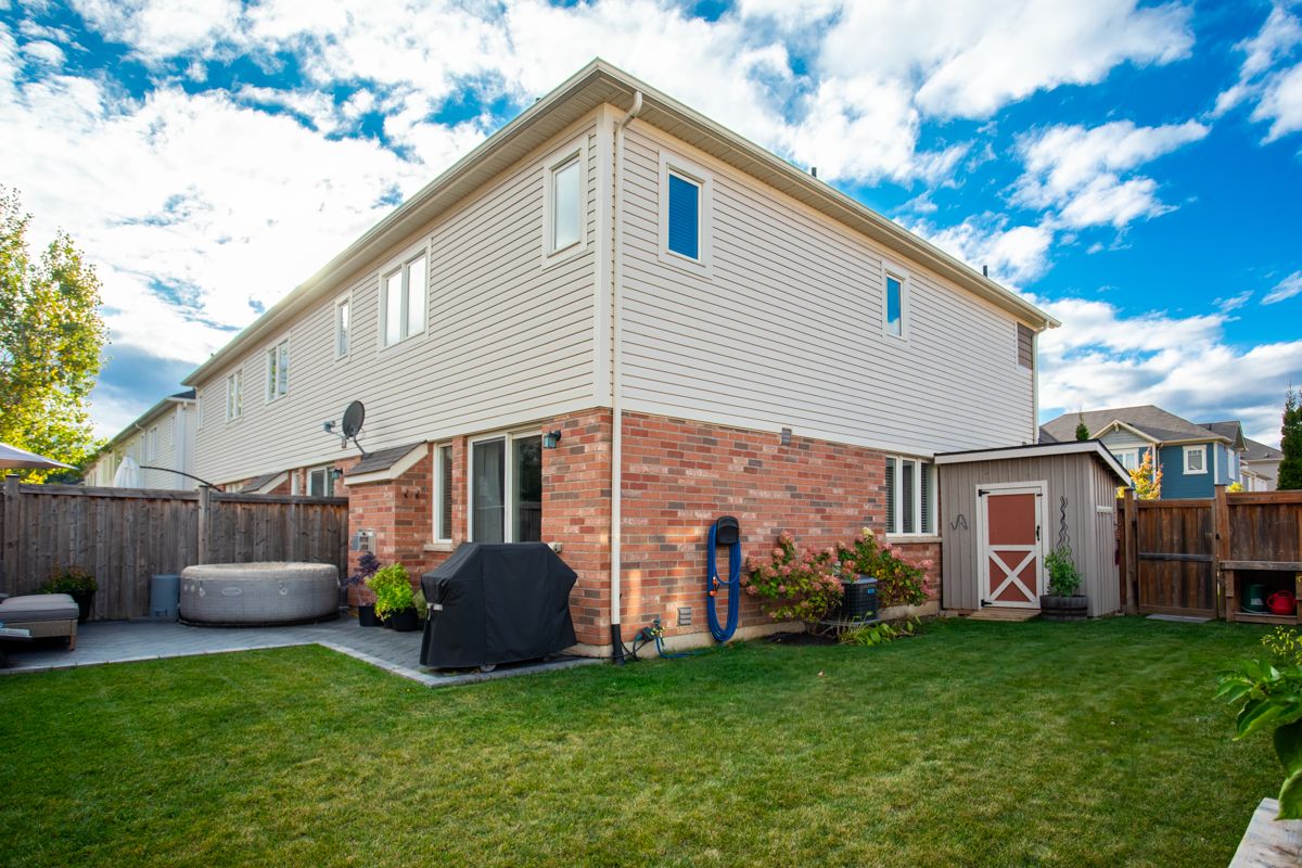 Dreaming of the space and privacy of a detached home-without the detached price tag? Welcome to this stylish, upgraded end-unit freehold townhome set on what is quite possibly one of the largest townhome lots in the village of waterdown. Bathed in natural light thanks to its end-unit positioning, this home offers the perfect blend of comfort, style, and everyday livability. Tucked away on a quiet, family-friendly crescent, the home greets you with charming curb appeal and an inviting front porch. Inside, the main floor features a spacious foyer, a dedicated dining area for hosting, and a bright open-concept kitchen and great room anchored by a cozy gas fireplace and a walk-out to the backyard-perfect for effortless indoor-outdoor living. Upstairs, the primary suite offers a generous walk-in closet and a bright ensuite, while two additional sun-filled bedrooms and a full bathroom provide plenty of space for family, guests, or a home office. The unfinished lower level offers abundant storage and endless potential for future living space. Step outside and discover what truly sets this home apart: an exceptionally large side and backyard that feels more like a detached property. Designed for entertaining and relaxing, the space features a stylish interlocking patio, soft tub, built-in planter boxes, a garden shed, and full fencing with extreme privacy -creating your own private outdoor retreat. Ideally located in spring creek's desirable east side, you'll enjoy easy access to burlington, downtown waterdown, dundas, and the 407. This is the lifestyle upgrade you've been waiting for in one of waterdown's most sought-after neighbourhoods.