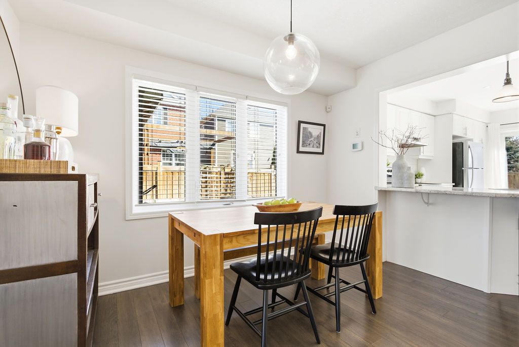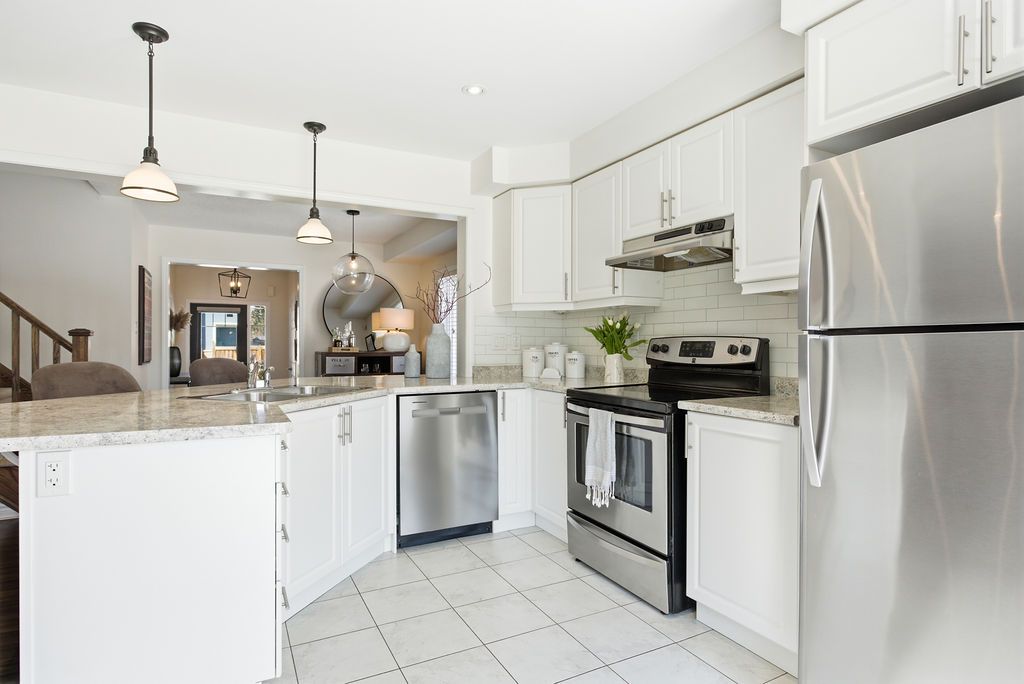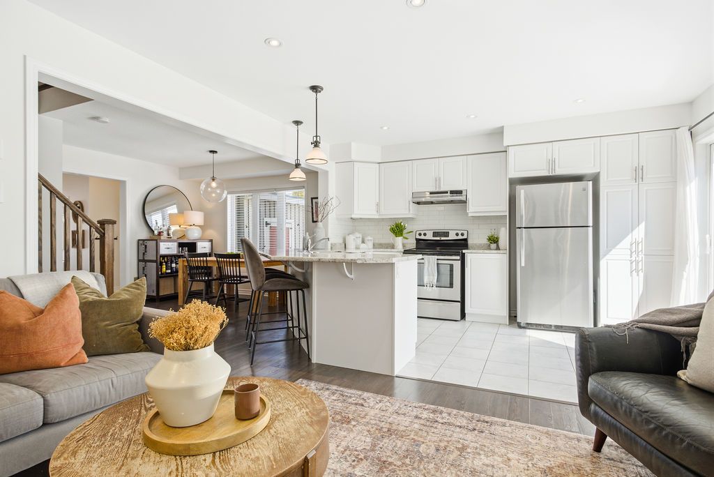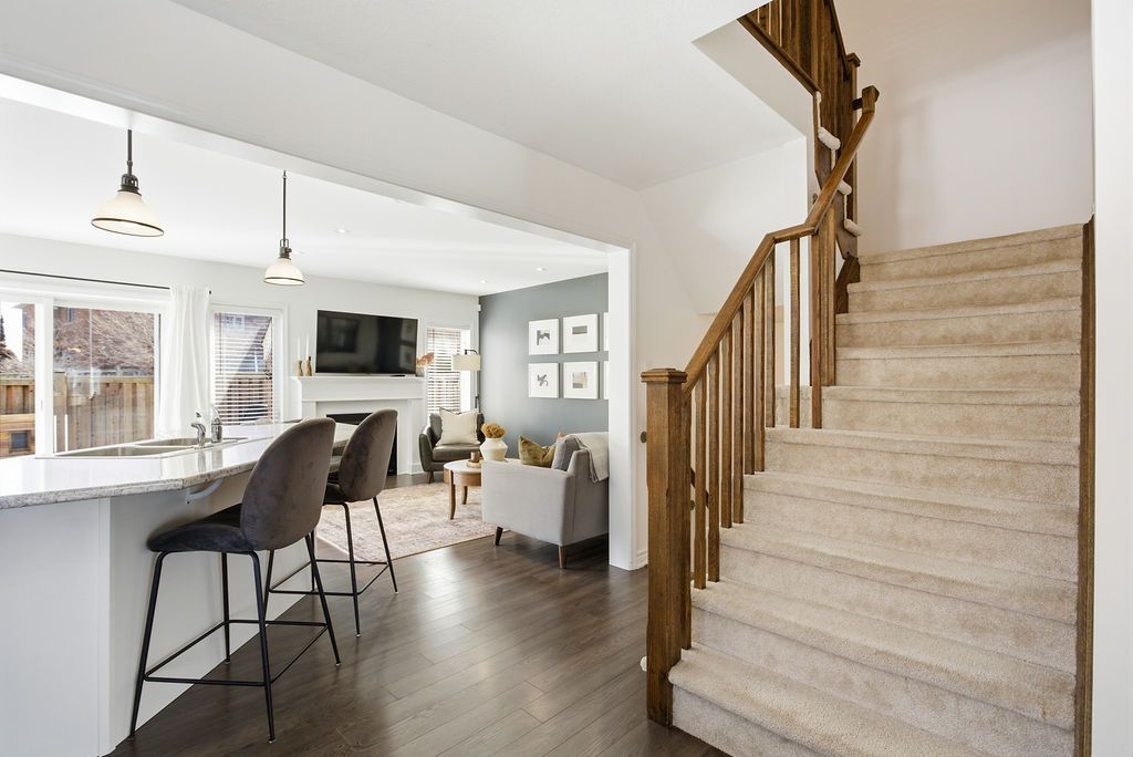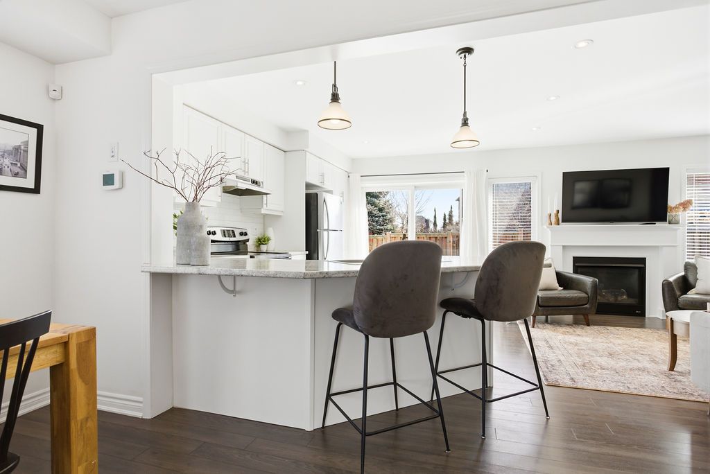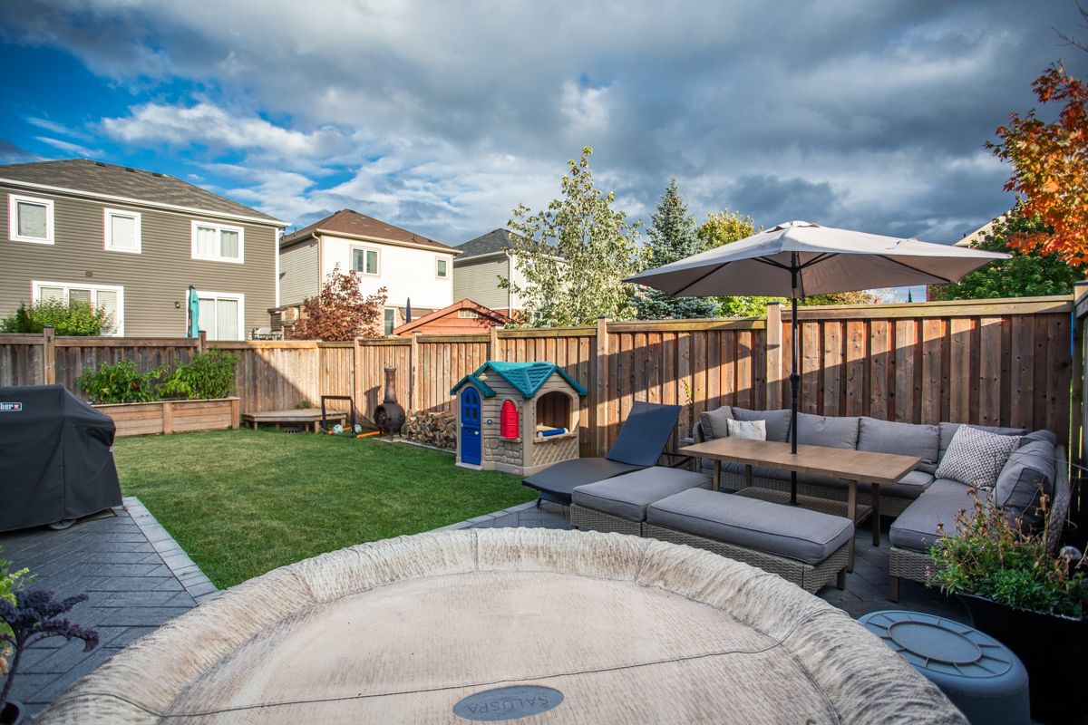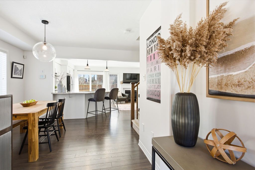 Dreaming of the space and privacy of a detached home-without the detached price tag? Welcome to this stylish, upgraded end-unit freehold townhome set on what is quite possibly one of the largest townhome lots in the village of waterdown. Bathed in natural light thanks to its end-unit positioning, this home offers the perfect blend of comfort, style, and everyday livability. Tucked away on a quiet, family-friendly crescent, the home greets you with charming curb appeal and an inviting front porch. Inside, the main floor features a spacious foyer, a dedicated dining area for hosting, and a bright open-concept kitchen and great room anchored by a cozy gas fireplace and a walk-out to the backyard-perfect for effortless indoor-outdoor living. Upstairs, the primary suite offers a generous walk-in closet and a bright ensuite, while two additional sun-filled bedrooms and a full bathroom provide plenty of space for family, guests, or a home office. The unfinished lower level offers abundant storage and endless potential for future living space. Step outside and discover what truly sets this home apart: an exceptionally large side and backyard that feels more like a detached property. Designed for entertaining and relaxing, the space features a stylish interlocking patio, soft tub, built-in planter boxes, a garden shed, and full fencing with extreme privacy -creating your own private outdoor retreat. Ideally located in spring creek's desirable east side, you'll enjoy easy access to burlington, downtown waterdown, dundas, and the 407. This is the lifestyle upgrade you've been waiting for in one of waterdown's most sought-after neighbourhoods.