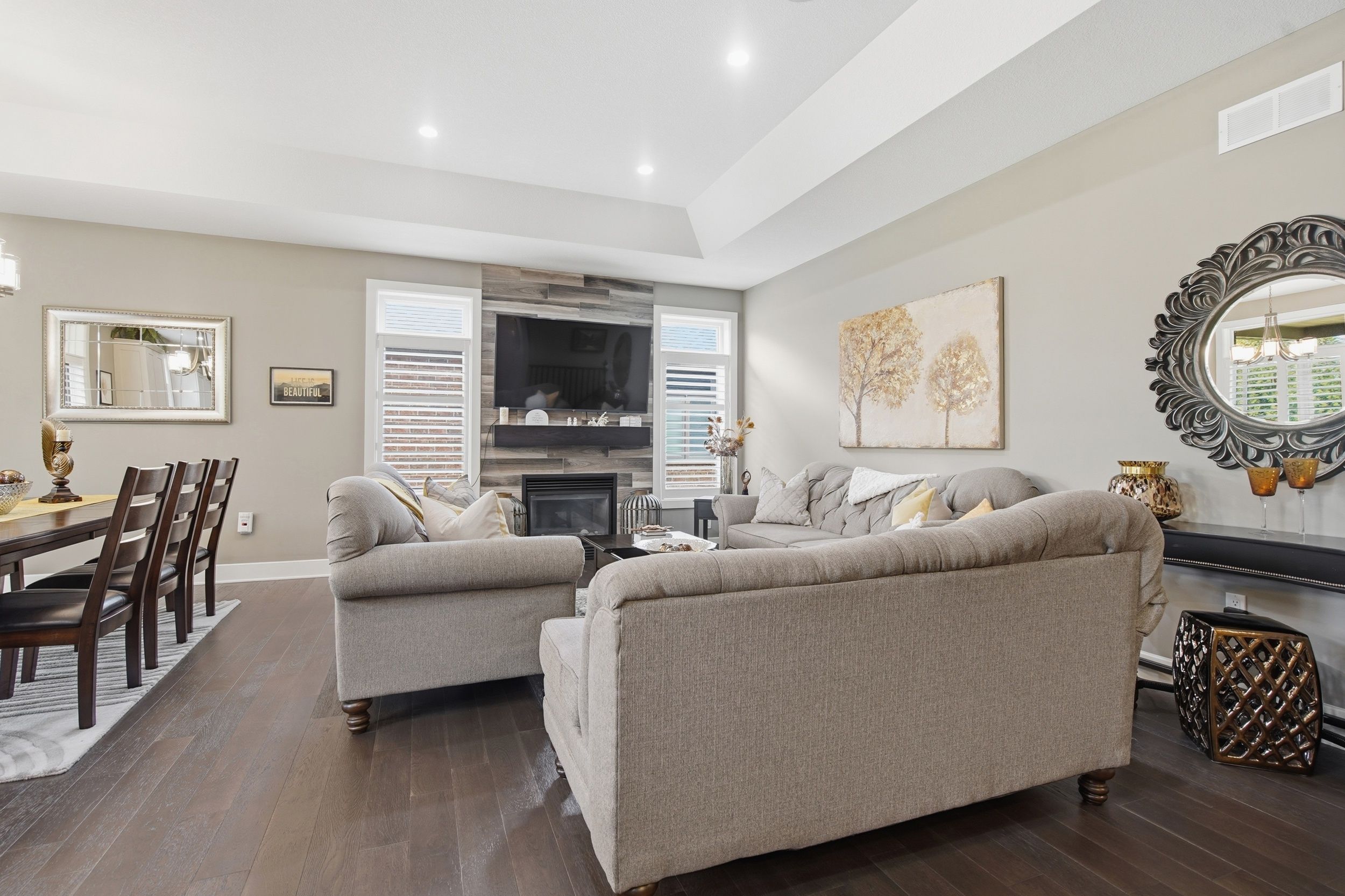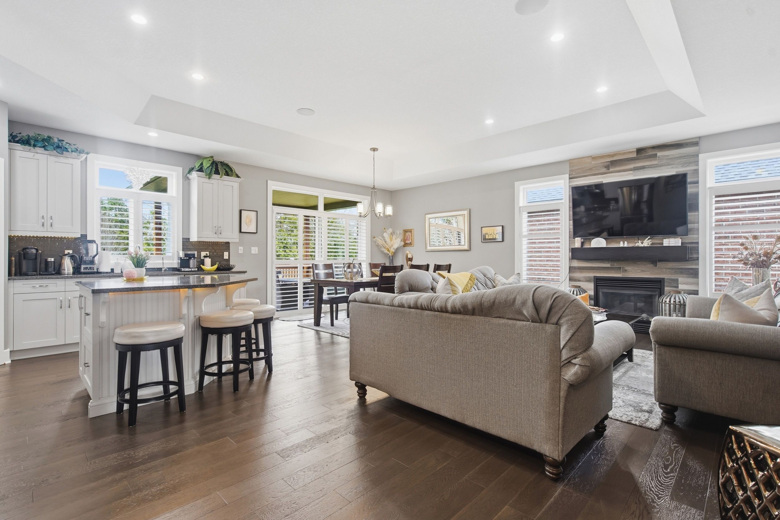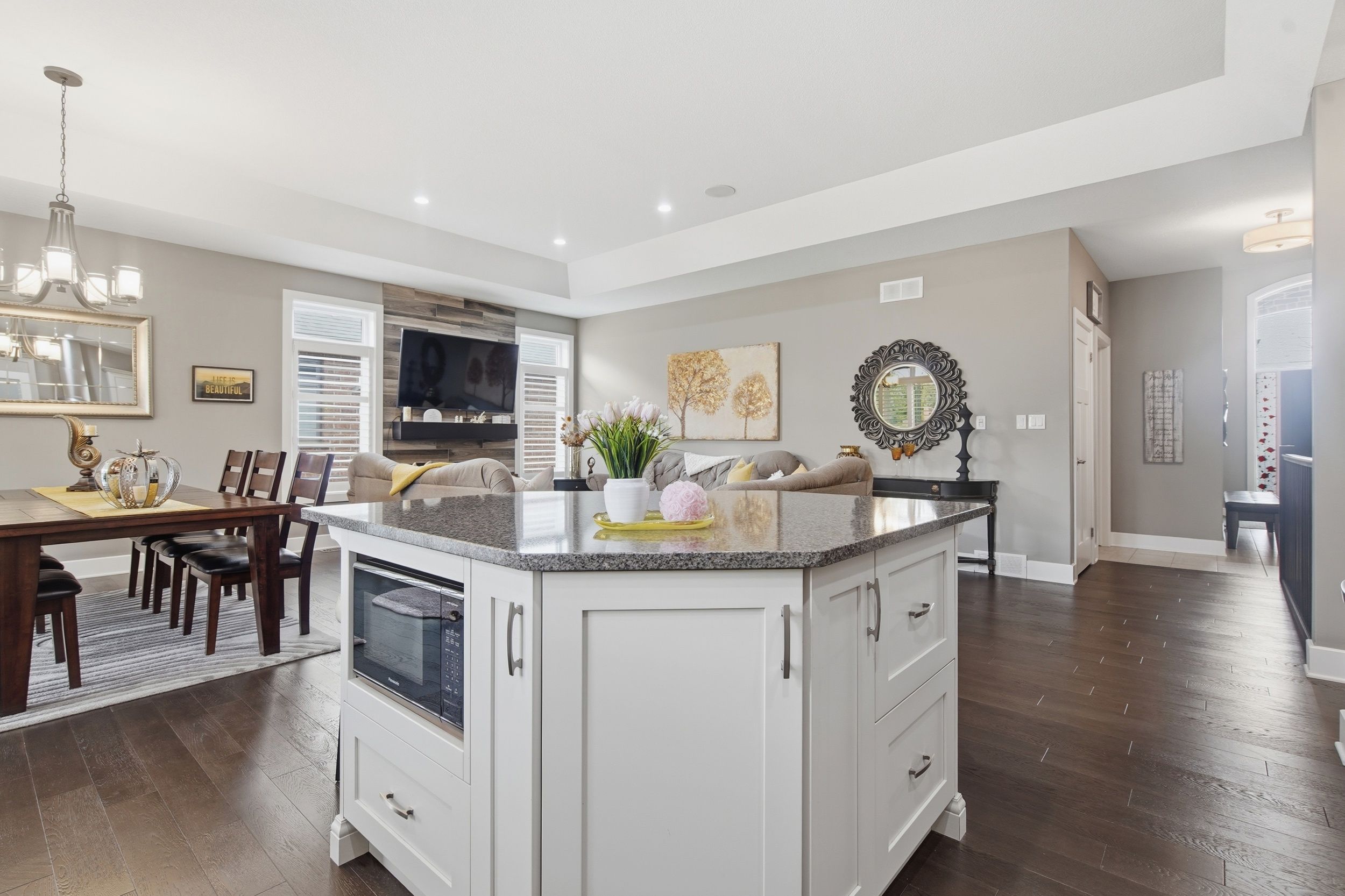 • Open concept design with hardwood flooring and coffered ceiling in great room.