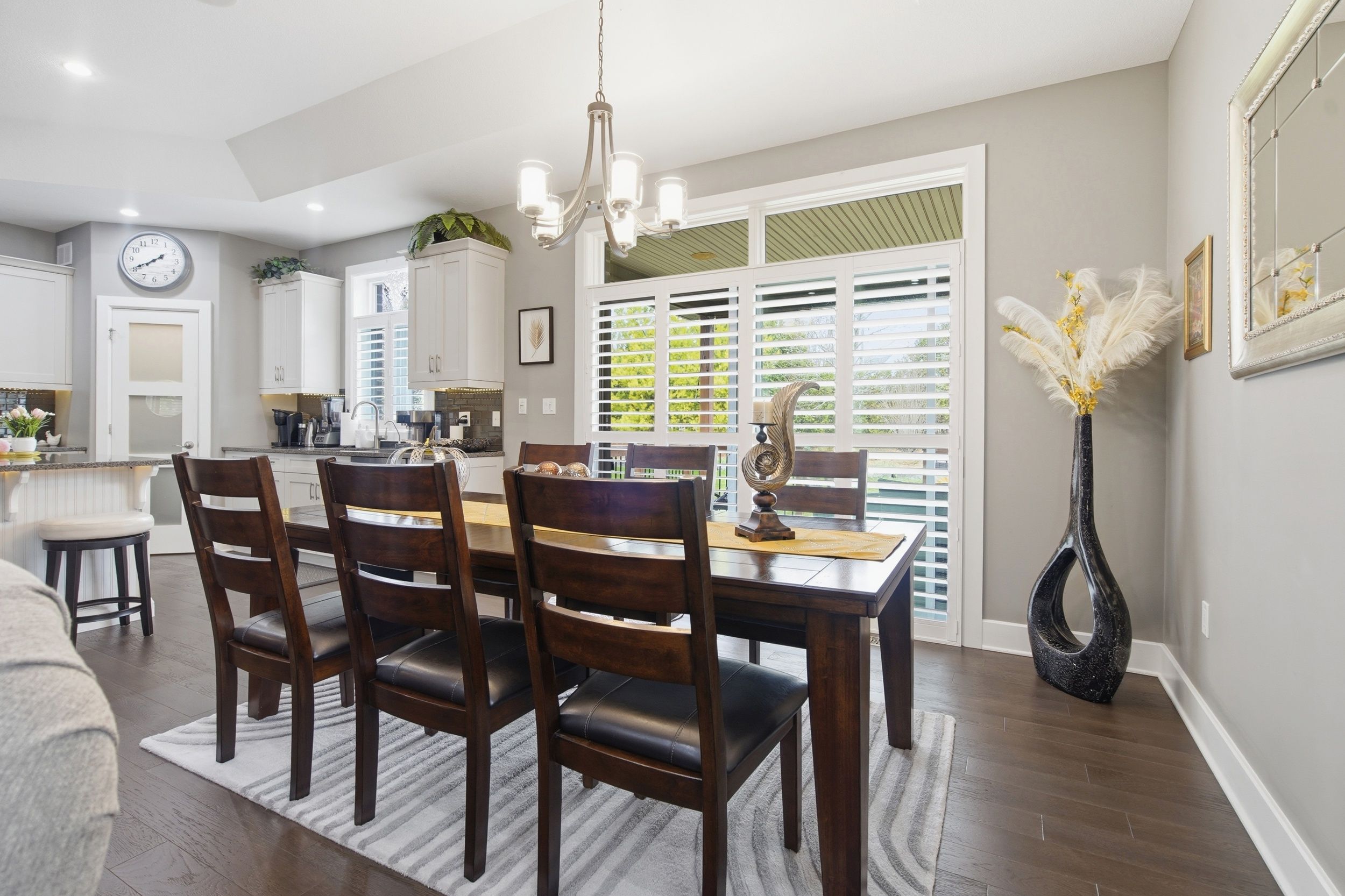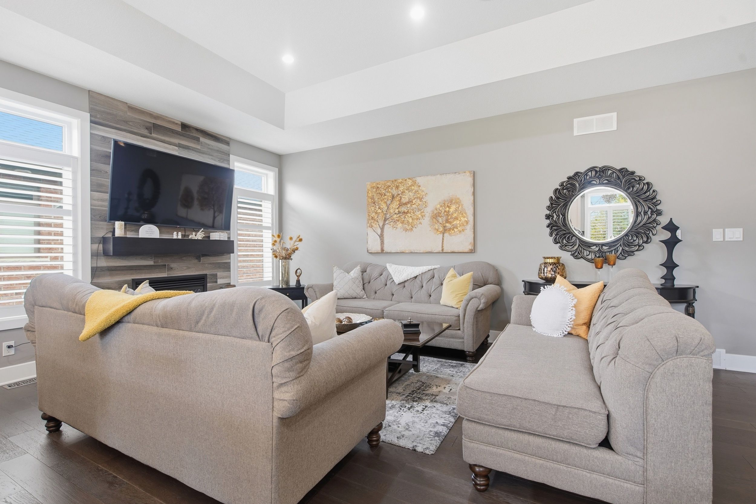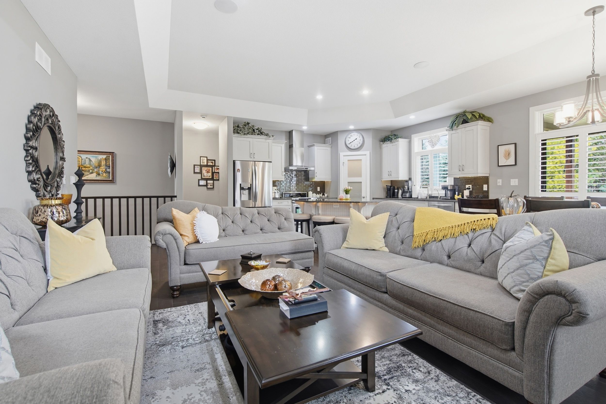 • Open concept design with hardwood flooring and coffered ceiling in great room.