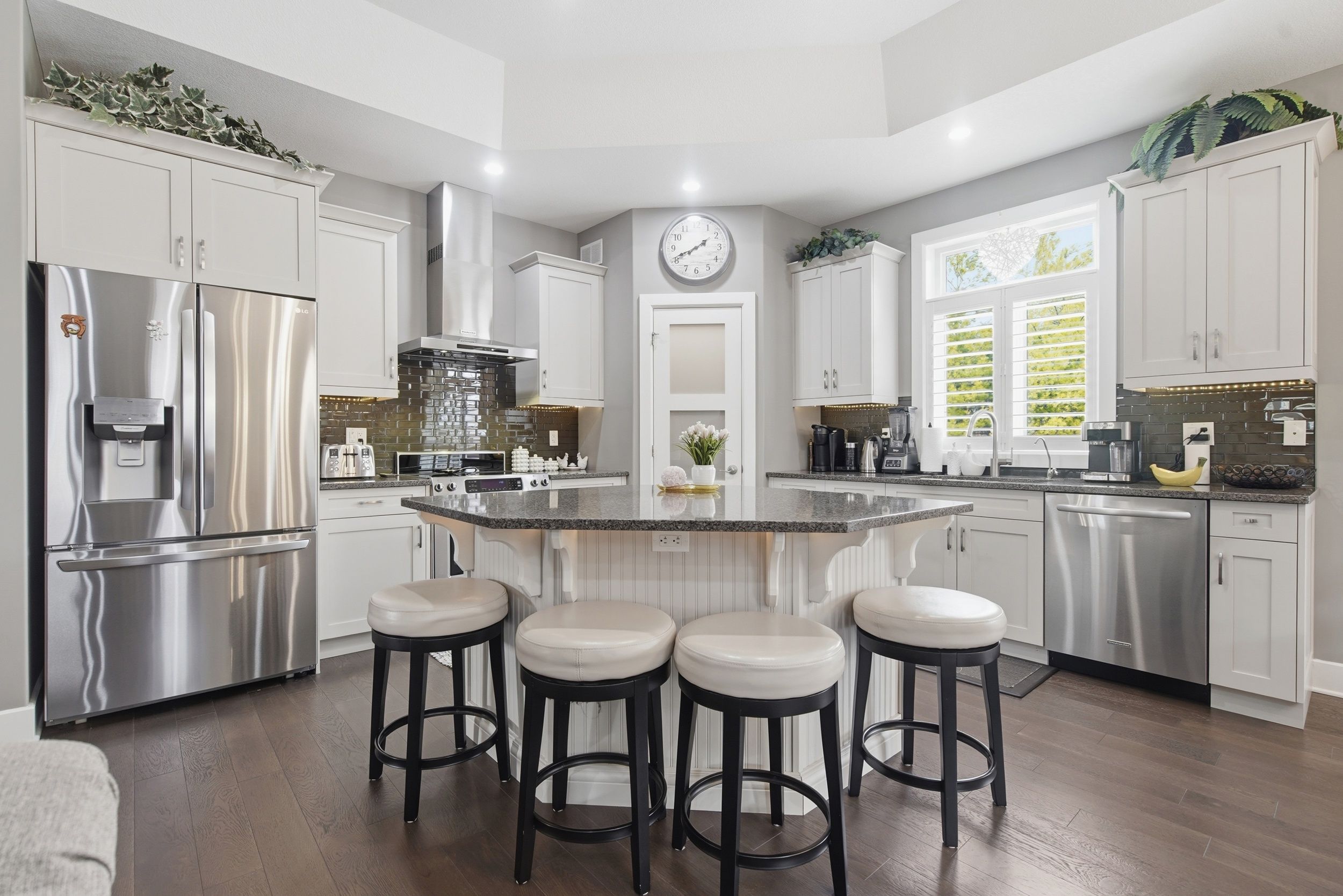 • Modern kitchen featuring quartz countertops and a handy breakfast island.