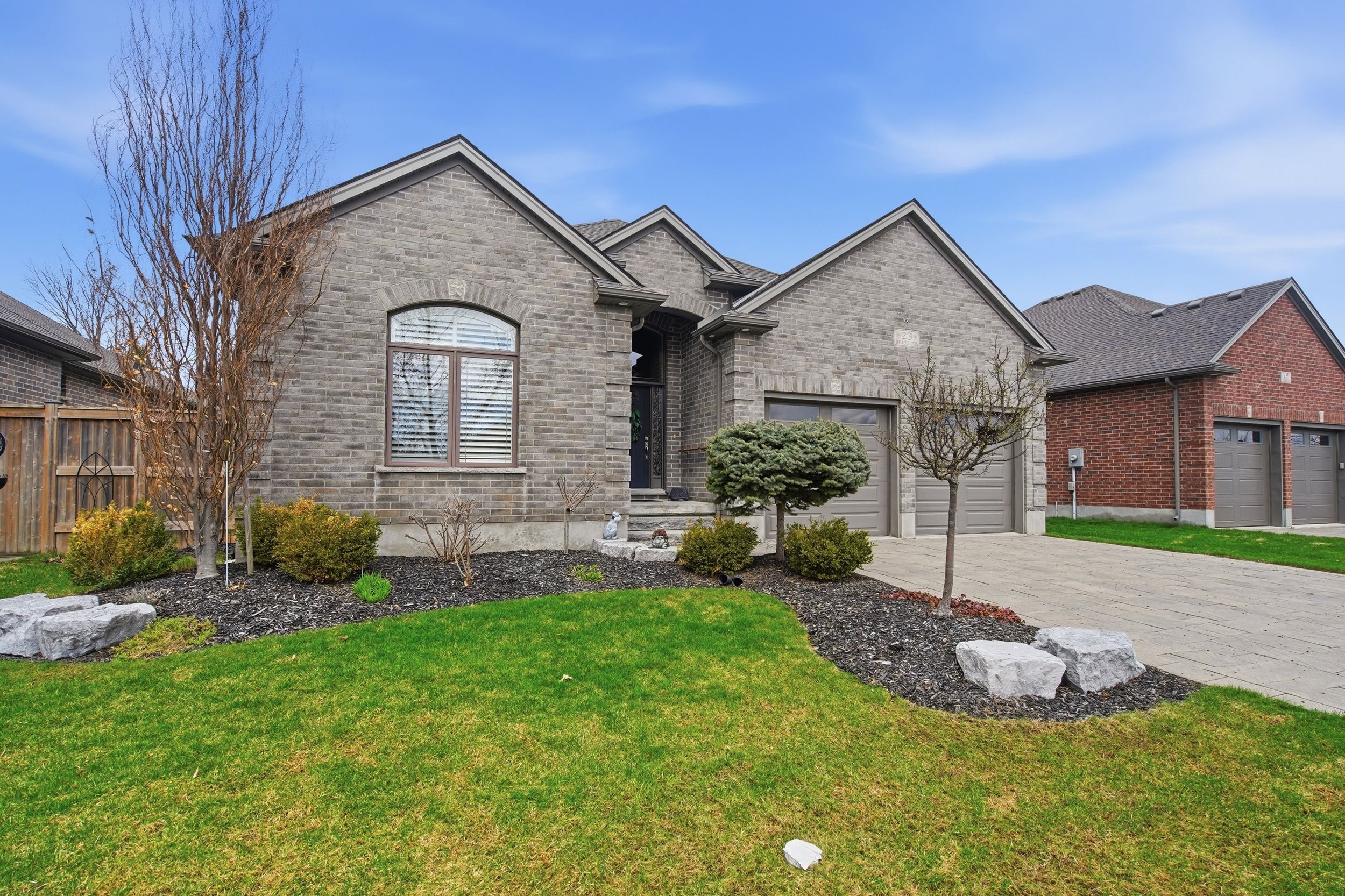 Gorgeous executive brick ranch in timberwalk estates in ilderton with gorgeous backyard & perennial garden. 1800 sf colden homes built. Double attached garage with paver stone driveway and walkway. Professional landscaping and fully fenced yard. Irrigation system. Covered rear deck/porch with gas bbq hook-up. Stunning open concept interior with gourmet kitchen and quartz countertops. Handy breakfast island. Hardwood flooring throughout much of the main floor. Speaker system in great room and covered porch. Coffered ceiling in great room. 3 bedrooms and 2 bathrooms including gorgeous en-suite with oversize walk in shower. California shutters throughout. This home shows a 10!