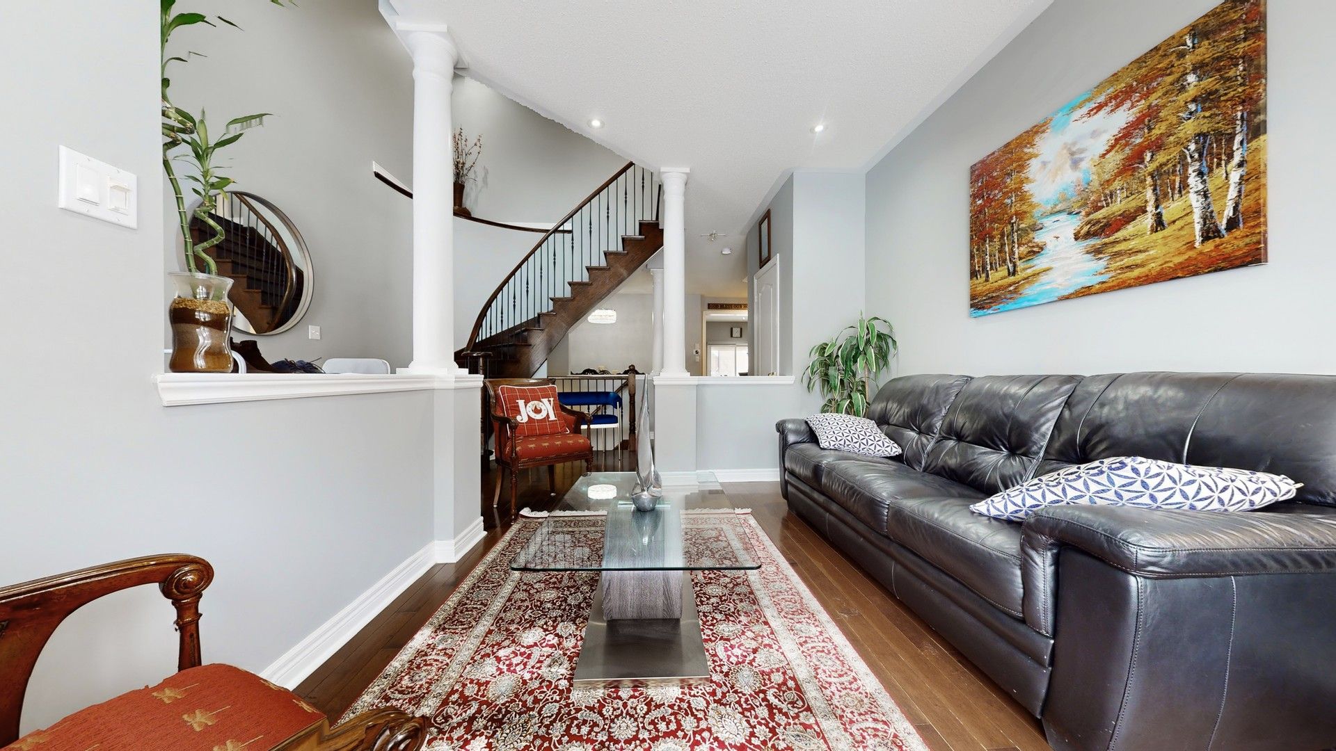Stunning, immaculate home on premium lot with serene wooded views in sought-after boxgrove community! This beautifully maintained home features elegant living and dining areas, a spacious open-concept kitchen and family room with 9' ceilings and pot lights throughout the main floor. The gourmet kitchen boasts granite countertops, mosaic backsplash, and top-of-the-line stainless steel appliances. Walk out to a professionally landscaped backyard complete with a brand-new deck, gazebo, interlock patio, and lush greenery-perfect for entertaining. Upstairs offers a striking circular staircase leading to a cozy sitting area. The luxurious primary suite features a 5-piece ensuite with glass shower, dual walk-in closets, and custom built-ins. The finished basement includes a full bath and a den-ideal as a home office or guest space. Recent upgrades include a newer furnace and roof. Double car driveway with interlock, and convenient visitor parking right in front. Located in a family-friendly neighborhood close to top-rated schools, parks, shopping, hwy 407/7, and all essential amenities.