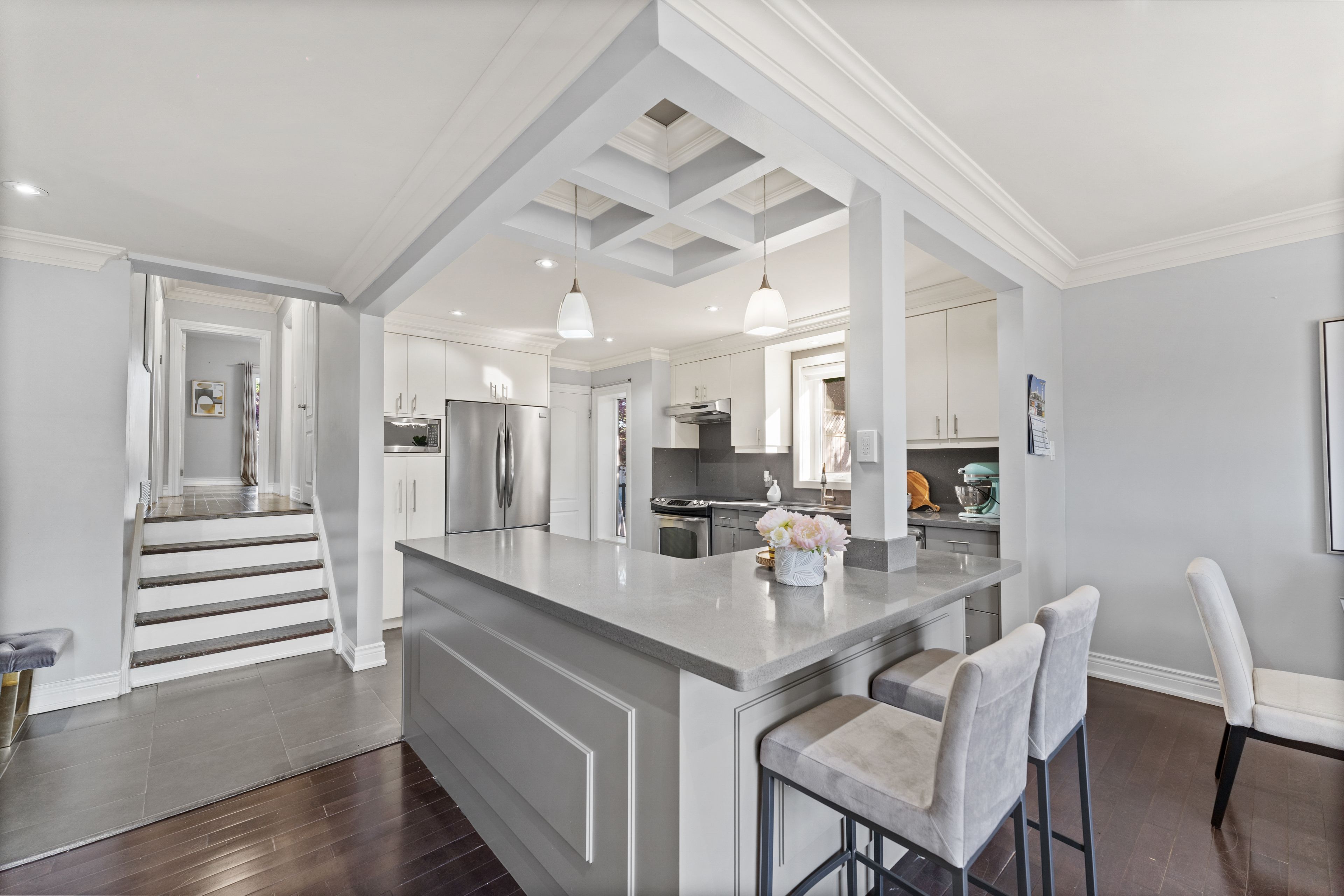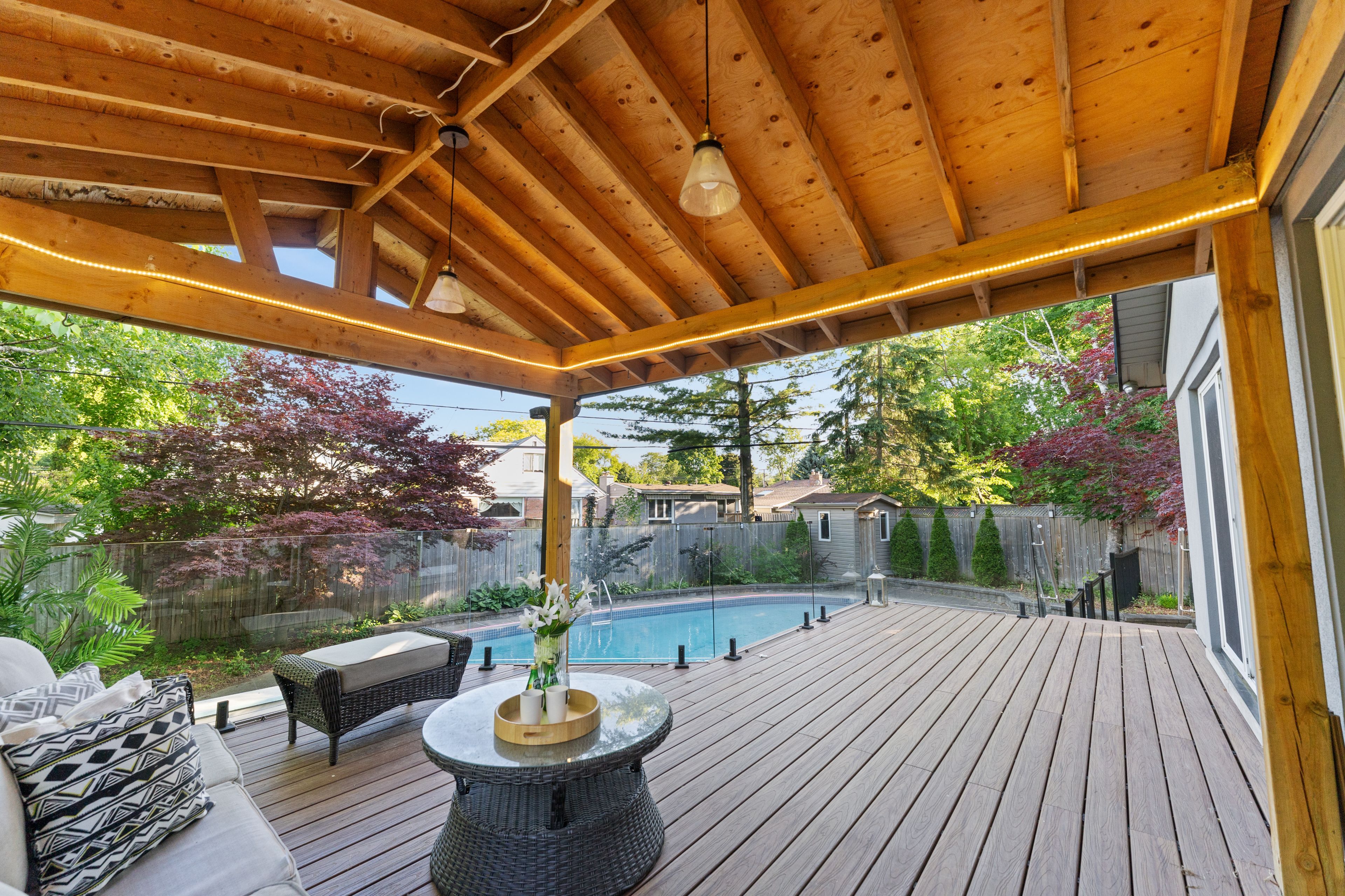 This home offers the perfect blend of style and comfort. With its modern stucco exterior and open concept layout, the space feels bright and welcoming from the moment you walk in. The insulated carport with a cedar ceiling and pot lights adds a unique touch of character. Inside, you'll find spacious rooms, hardwood floors, and a custom kitchen with quartz countertops, a breakfast bar, and clean, modern finishes-ideal for everyday living and entertaining. The backyard is a true highlight, featuring a large deck, side yard, and an in-ground pool-perfect for relaxing or hosting in the warmer months. The fully finished basement with separate entrance adds incredible flexibility, whether for a growing family, multi-generational living, a nanny suite, or potential rental income.