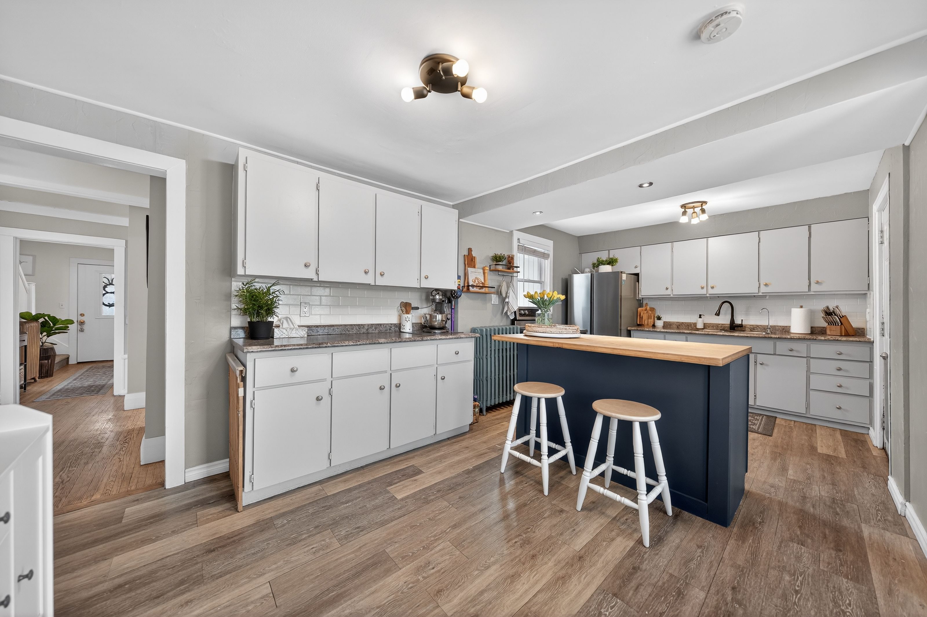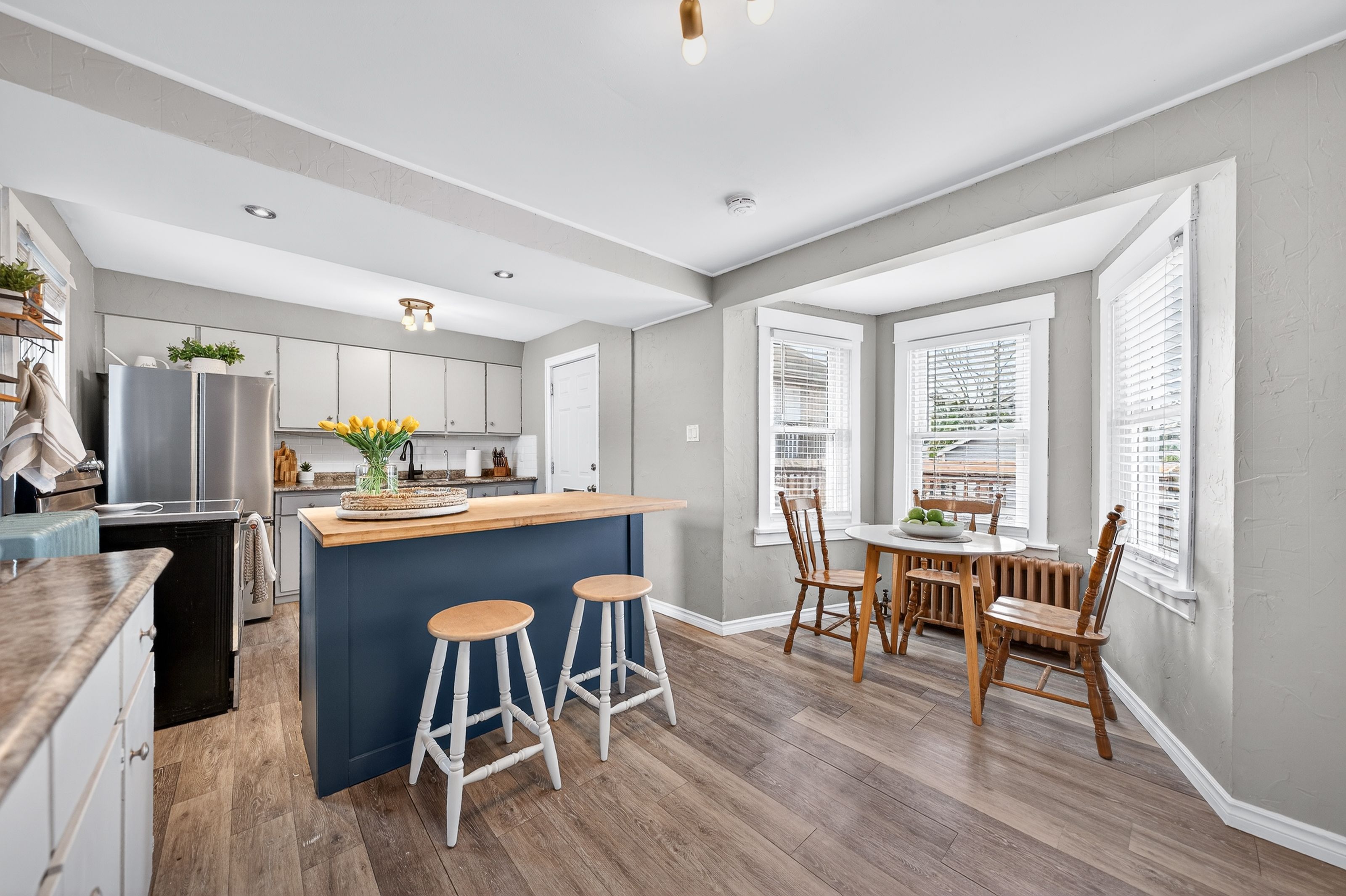 • Spacious main floor with living, dining, and large kitchen areas.