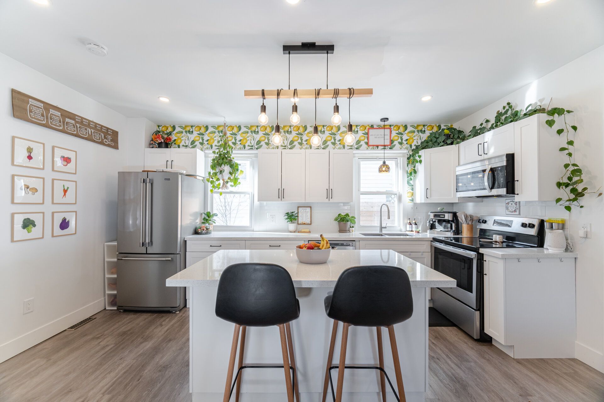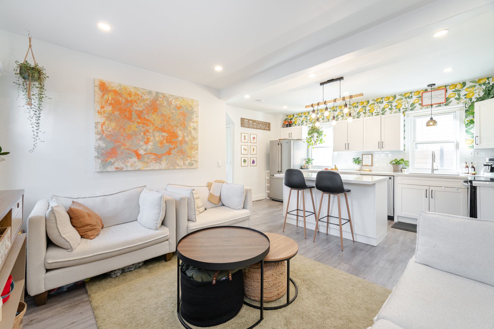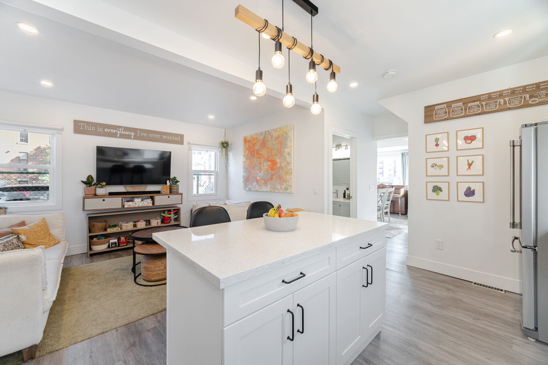 • Open-concept kitchen and living area filled with natural light and bay window.