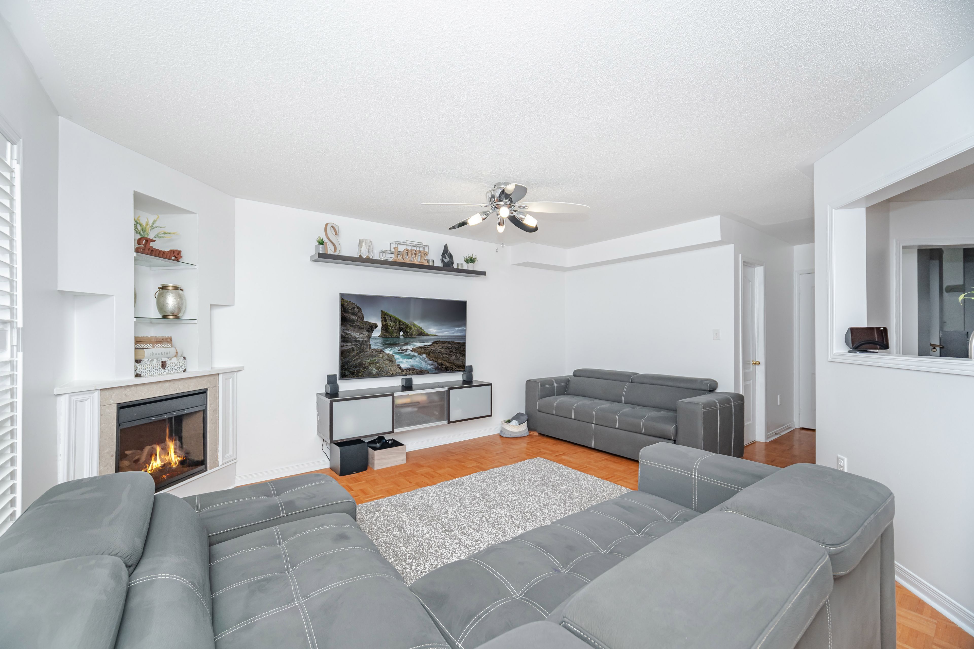 • Cozy family room featuring a fireplace for relaxation and gatherings.