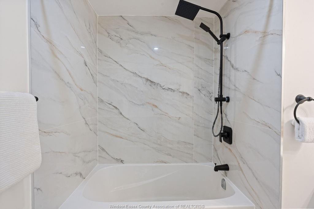 • Spacious bathroom featuring large-format porcelain tile for an upscale feel.