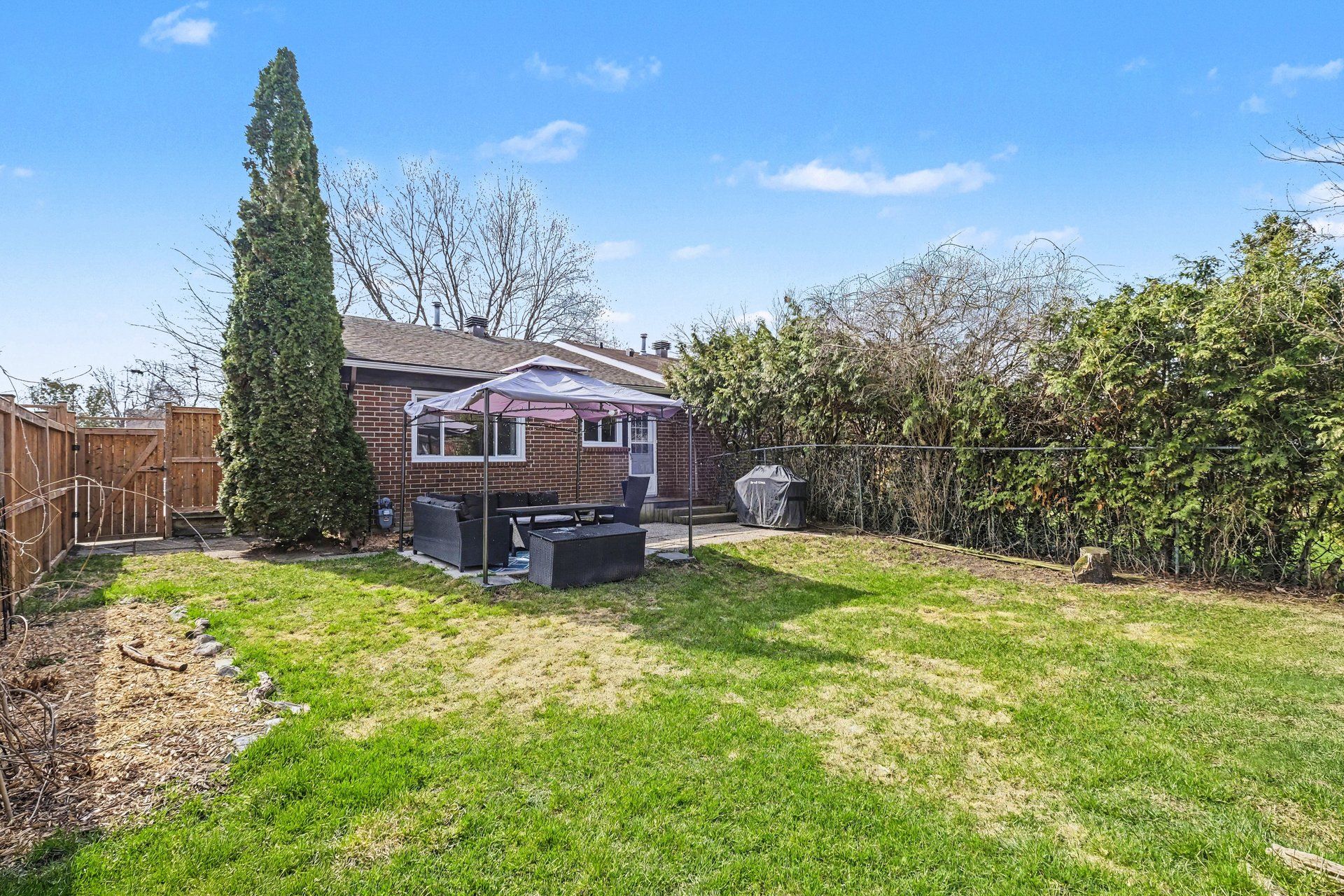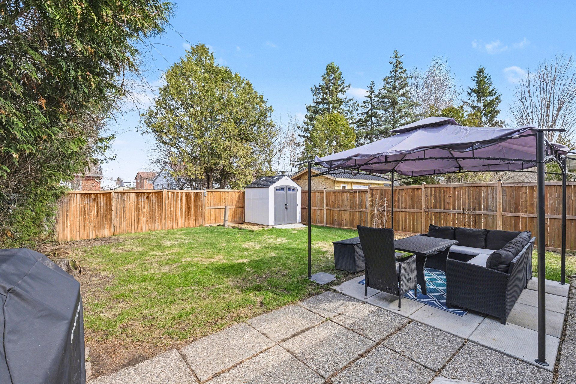 • Oversized fenced backyard with seating area, gazebo, and garden shed.